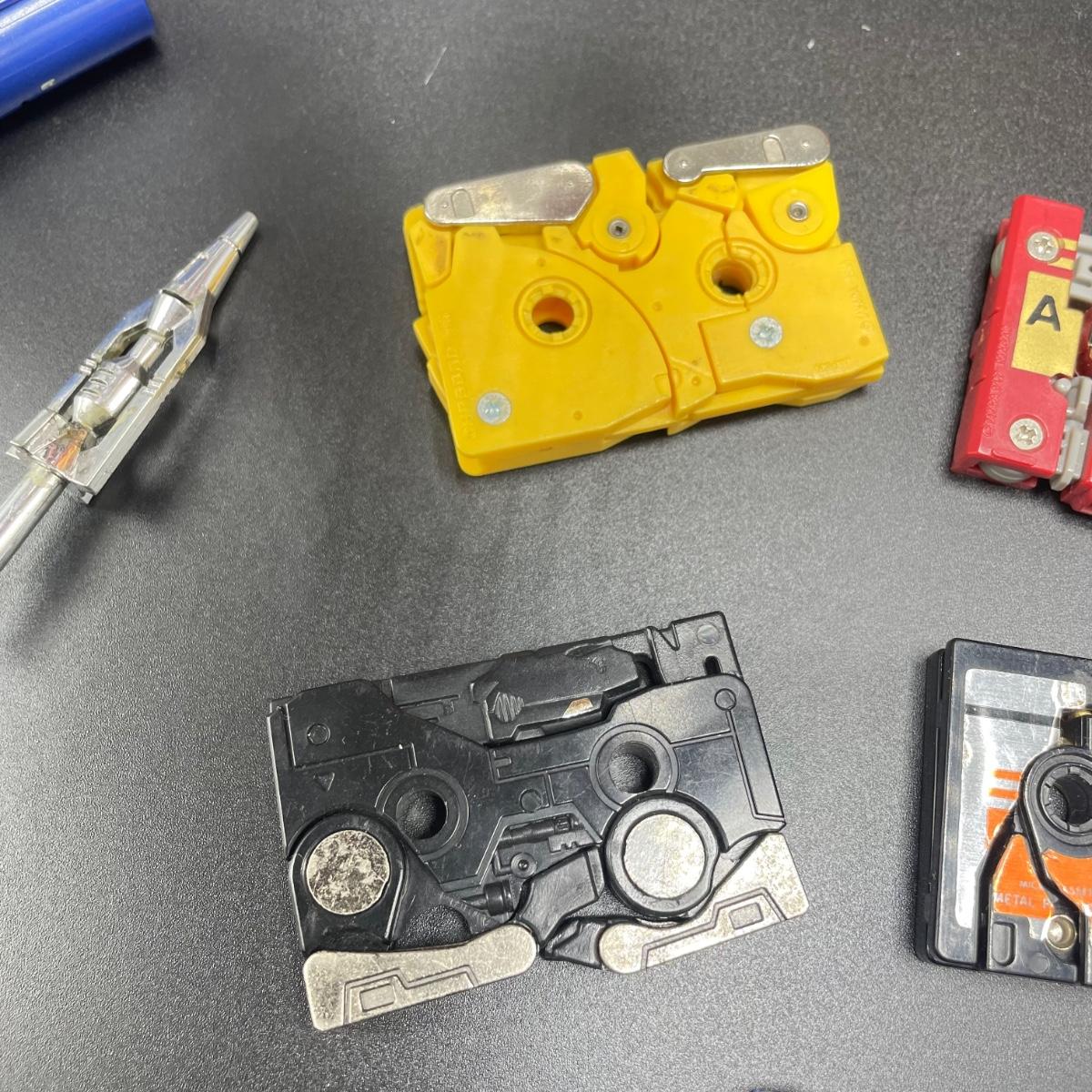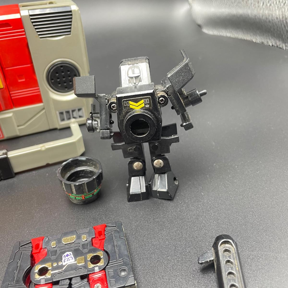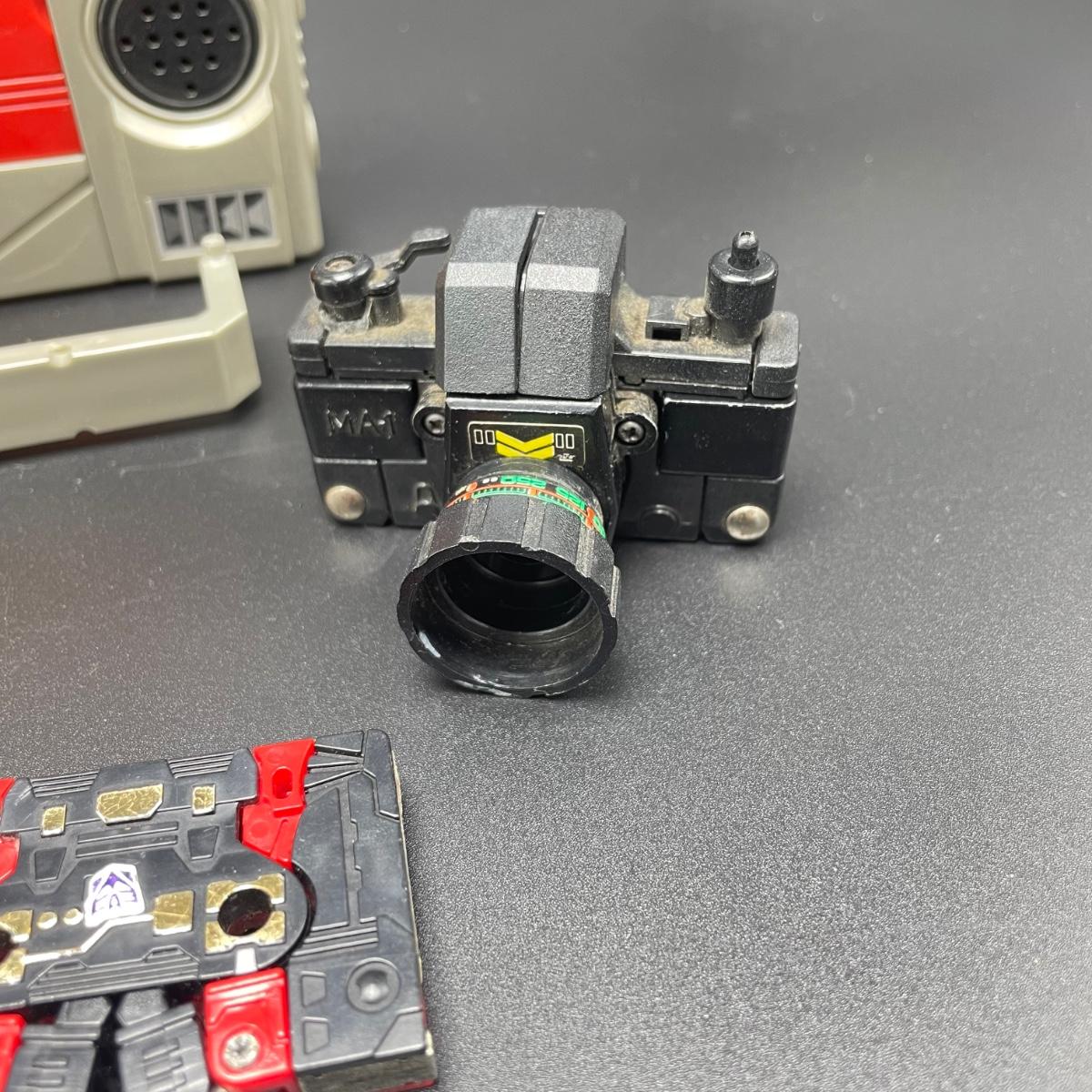 Media Transformer lot including Blaster, Soundwave, seven cassettes and a camera. Soundwave includes three accessories, but is missing it’s head and one sticker has faded into just adhesive. Blaster has its handle removed and some adhesive on the black pieces of the handle. The stickers on the cassettes vary, but most are in great condition. One cassette with black, gold and white pieces has no stickers and adhesive residue on one side. Lastly, lot includes a camera marked MA-1 and a firearm for Blaster. See images. Shipping available.