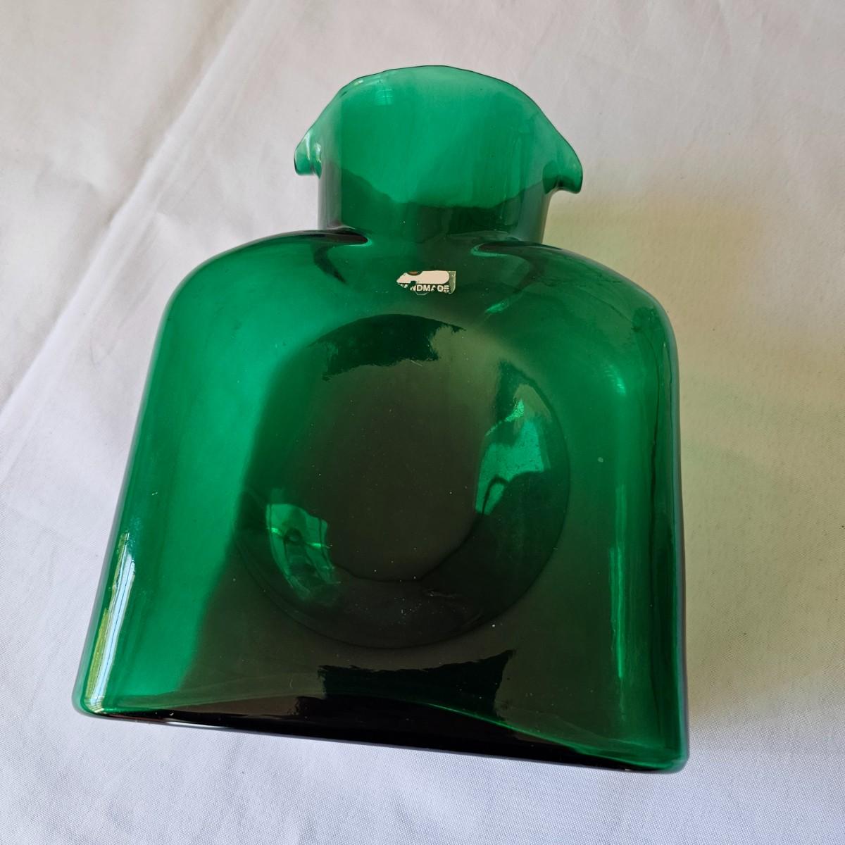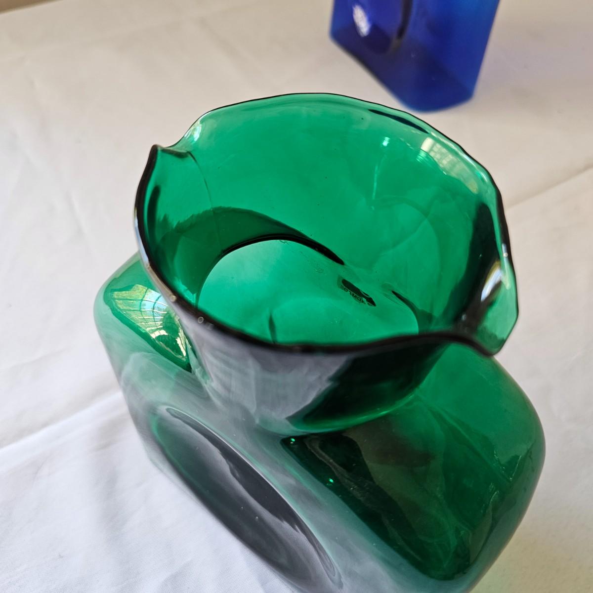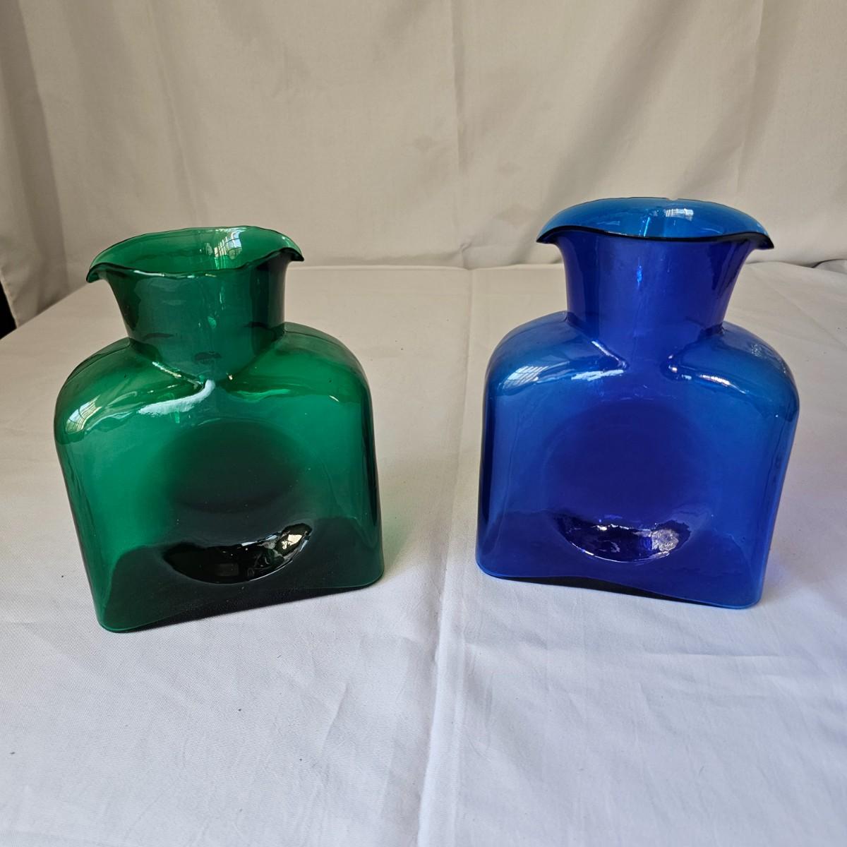 One green, one cobalt blue water bottles with double spouts, made by Blenko. These were introduced in the late 1930's to fit the smaller refrigerators of the time. Bottles each measure 6" x 3.5" x 8"H. Blenko insignia on blue item, 2002. No visible marks on green piece. Each item has a small chip or crack in the top lip. See photos for details. Shipping available.