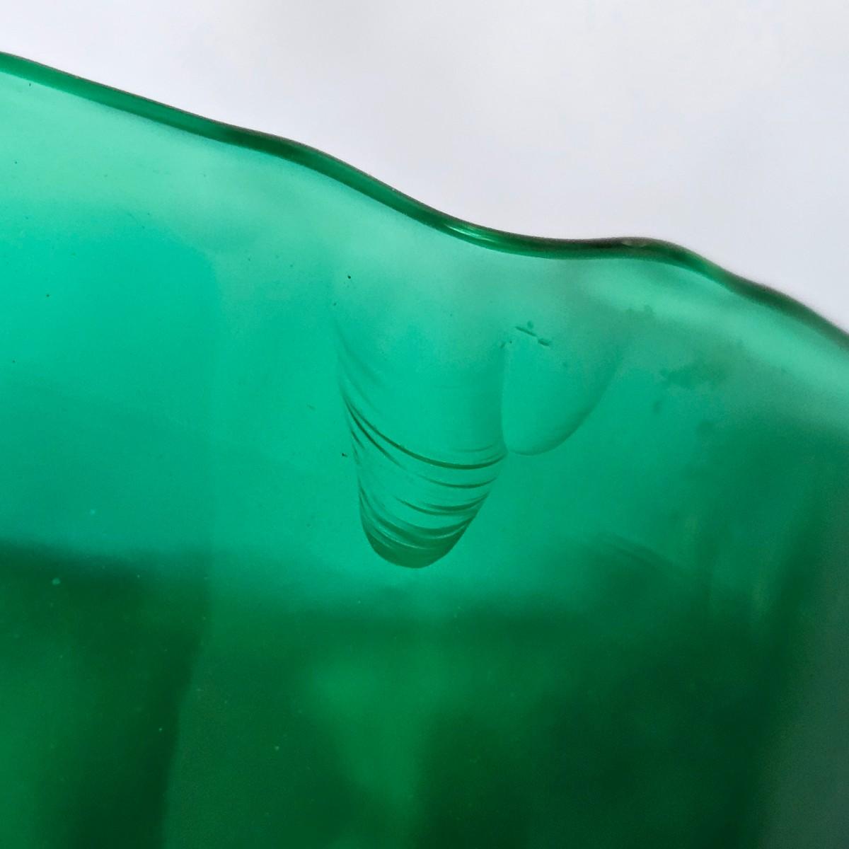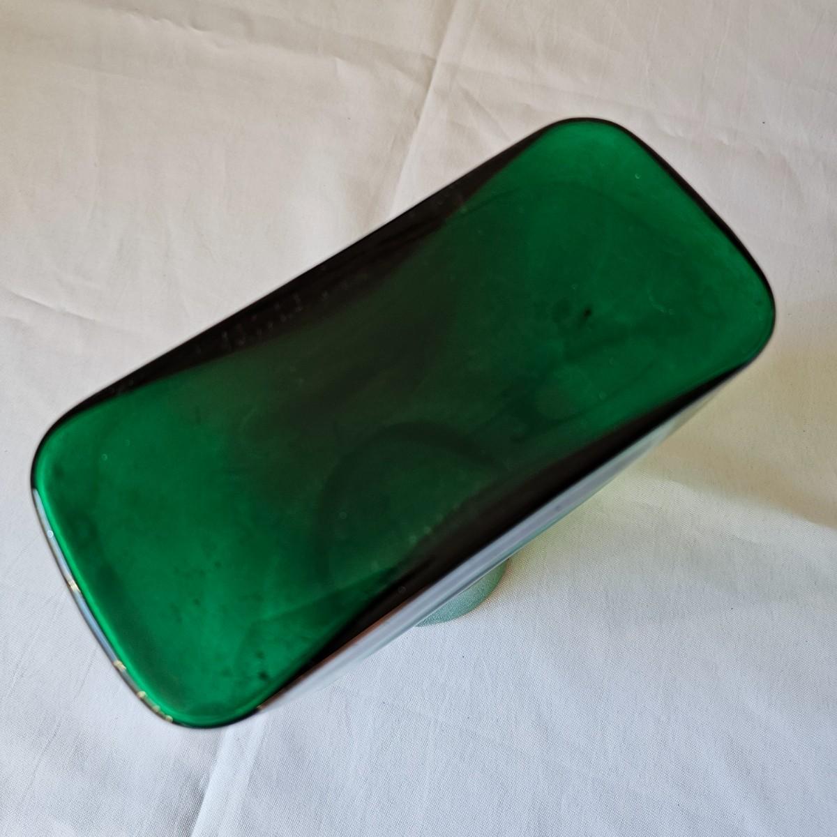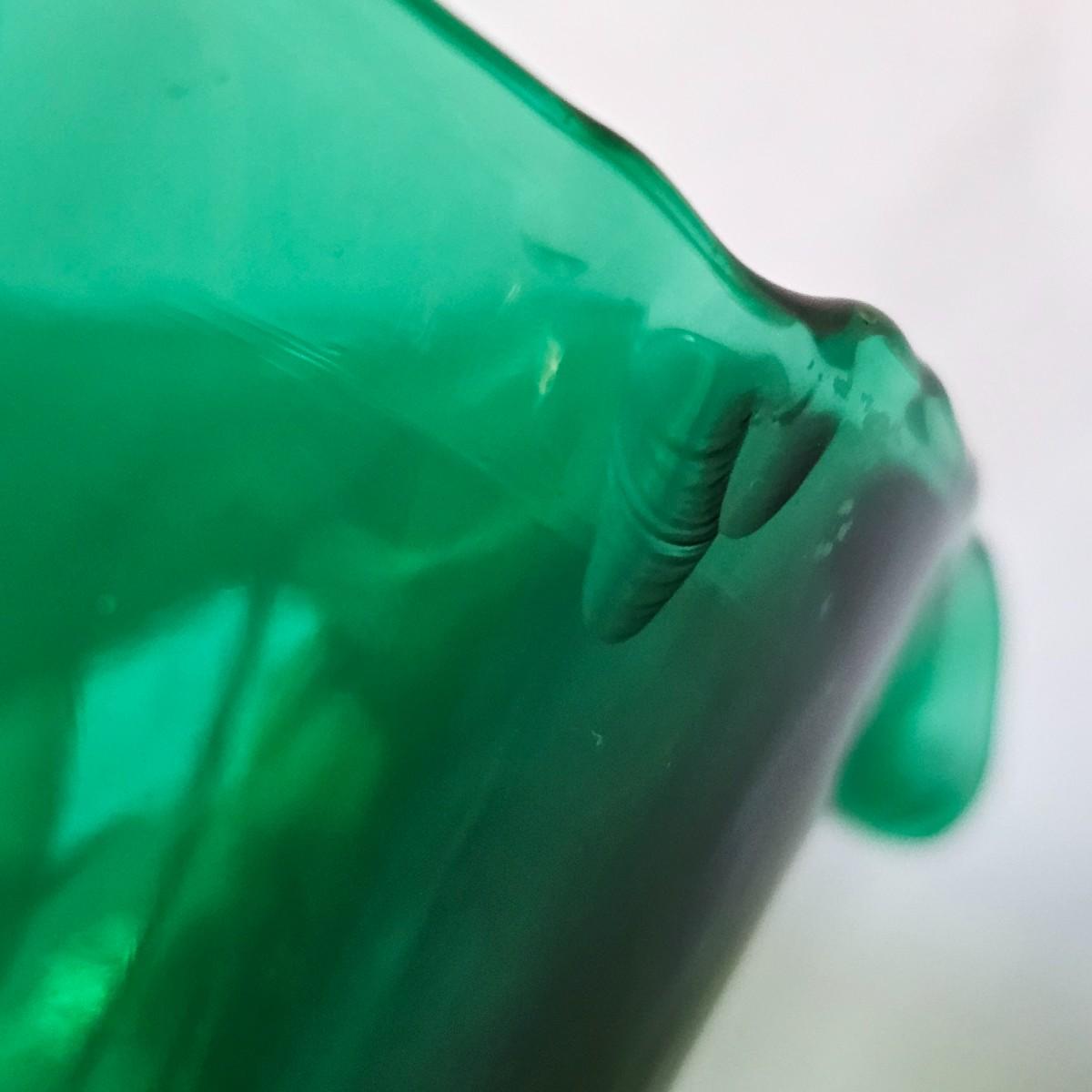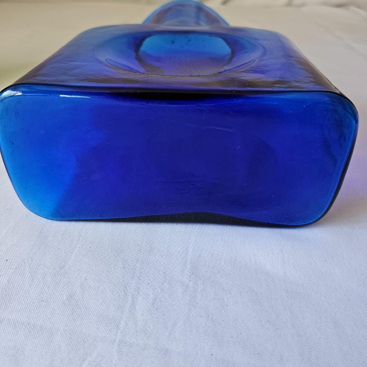 One green, one cobalt blue water bottles with double spouts, made by Blenko. These were introduced in the late 1930's to fit the smaller refrigerators of the time. Bottles each measure 6" x 3.5" x 8"H. Blenko insignia on blue item, 2002. No visible marks on green piece. Each item has a small chip or crack in the top lip. See photos for details. Shipping available.