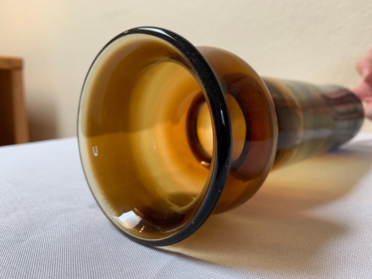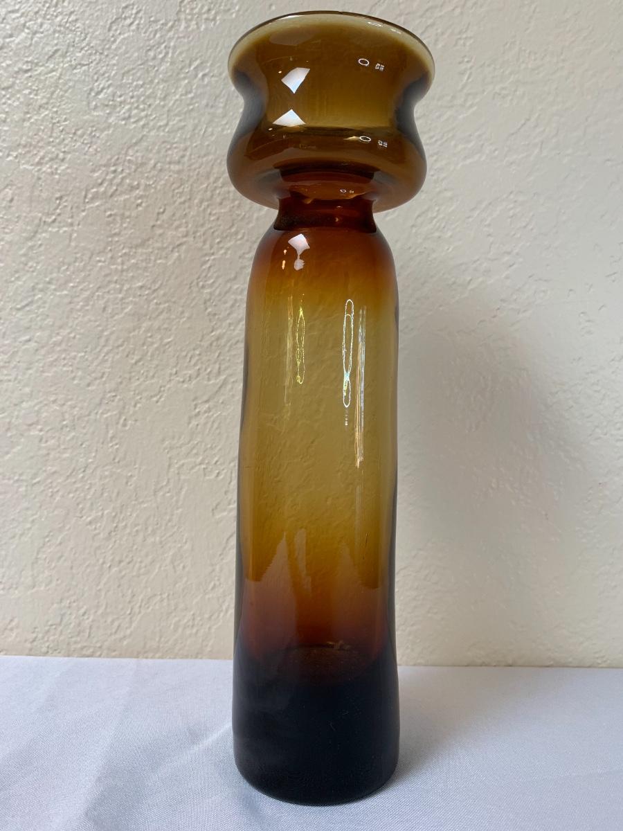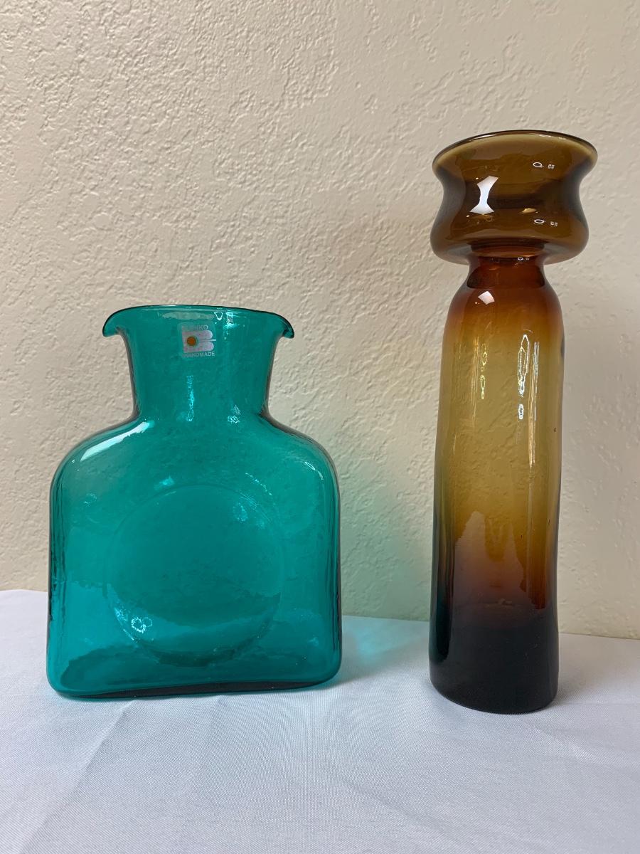 Two mid century Blenko art glass vases one with sticker. Excellent condition (11 1/2 inches in height“”- for brown one)