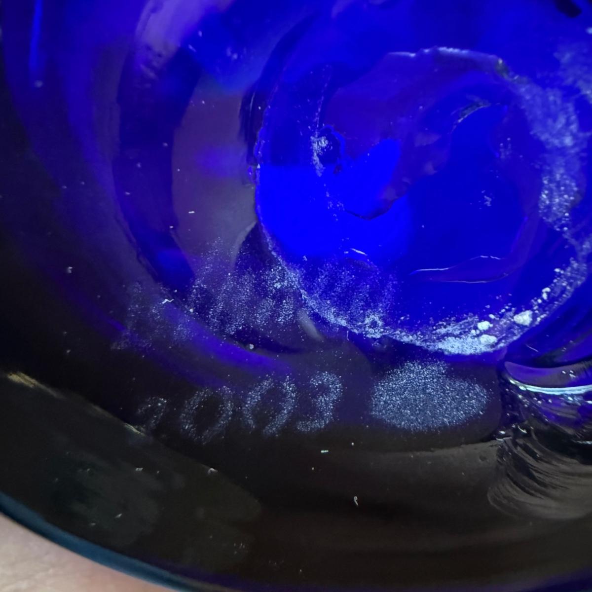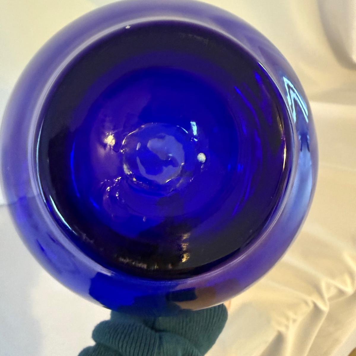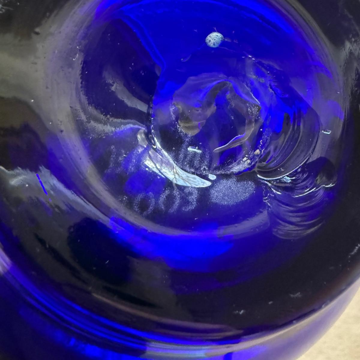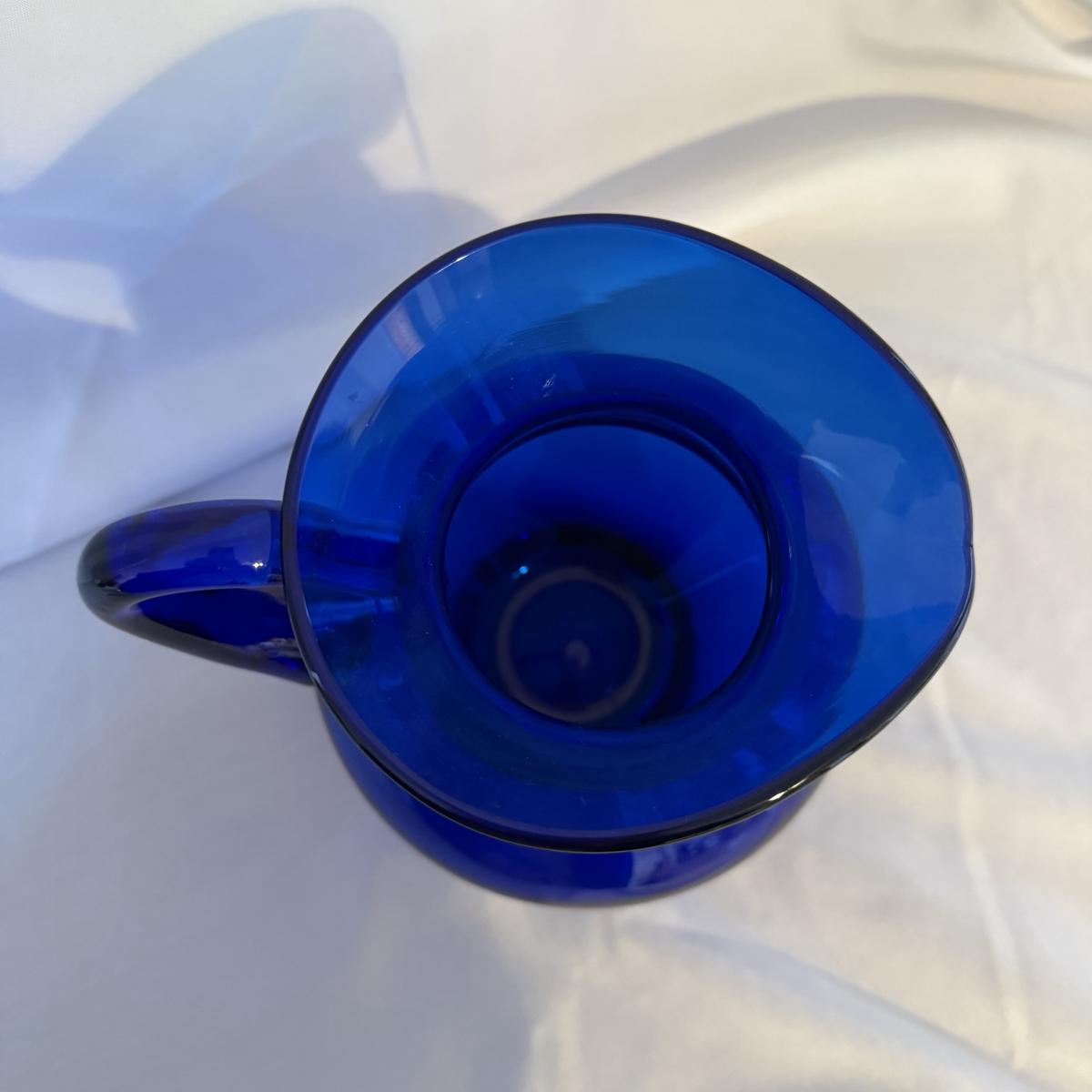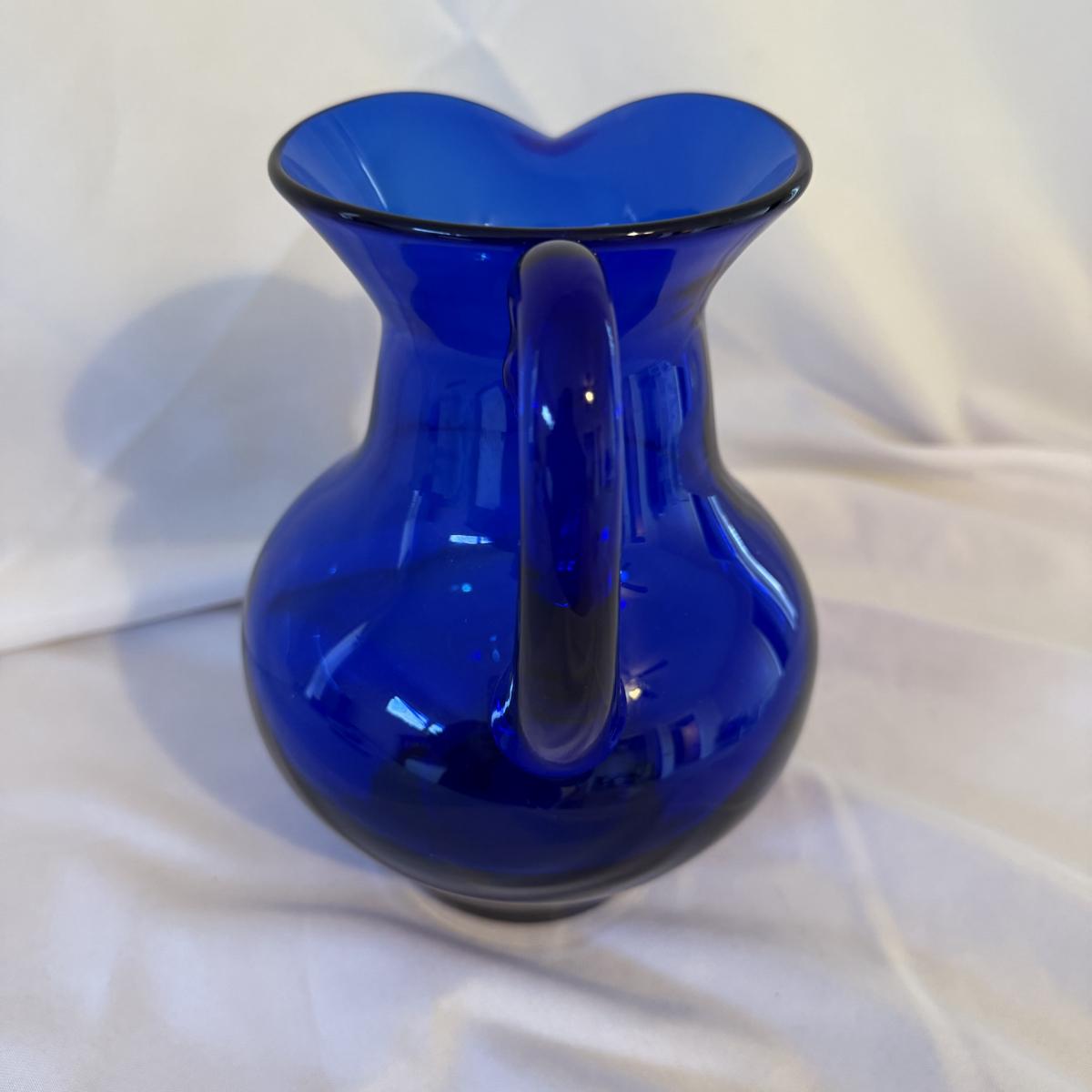 This lot contains a brilliant cobalt blue glass pitcher with a Blenko 2003 marking on the bottom. This stunning piece measures 6.75” x 5” x 8.25”H. Shipping available.