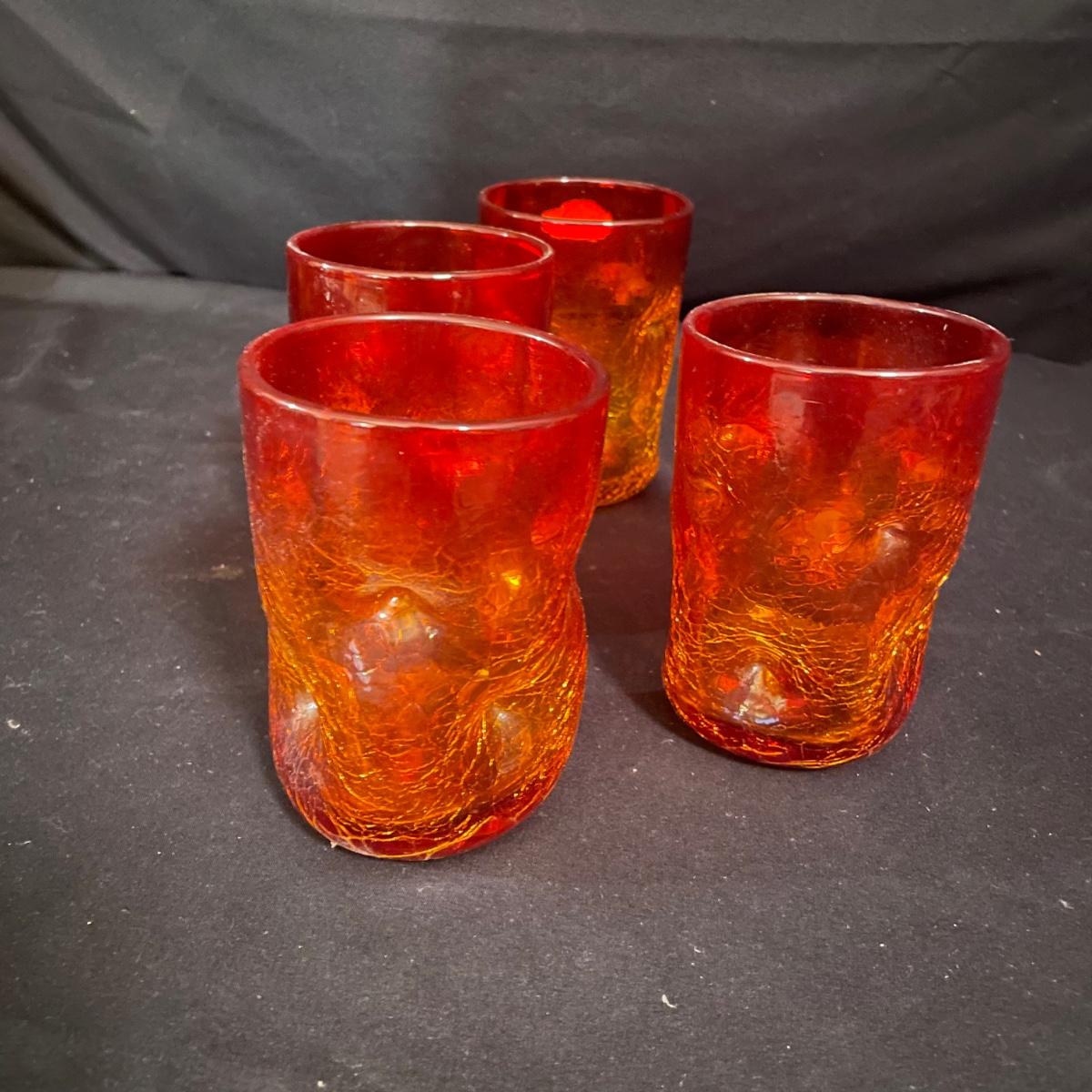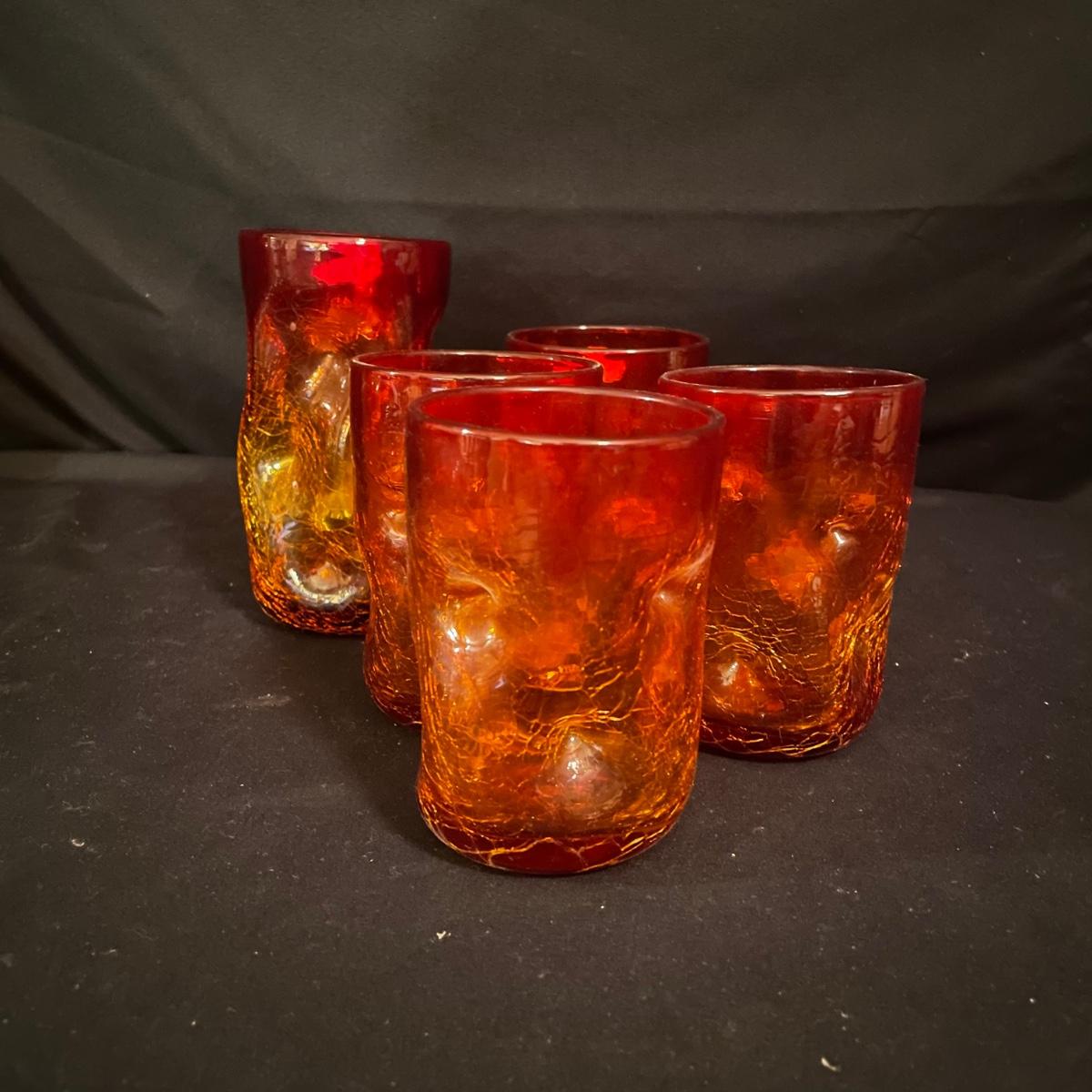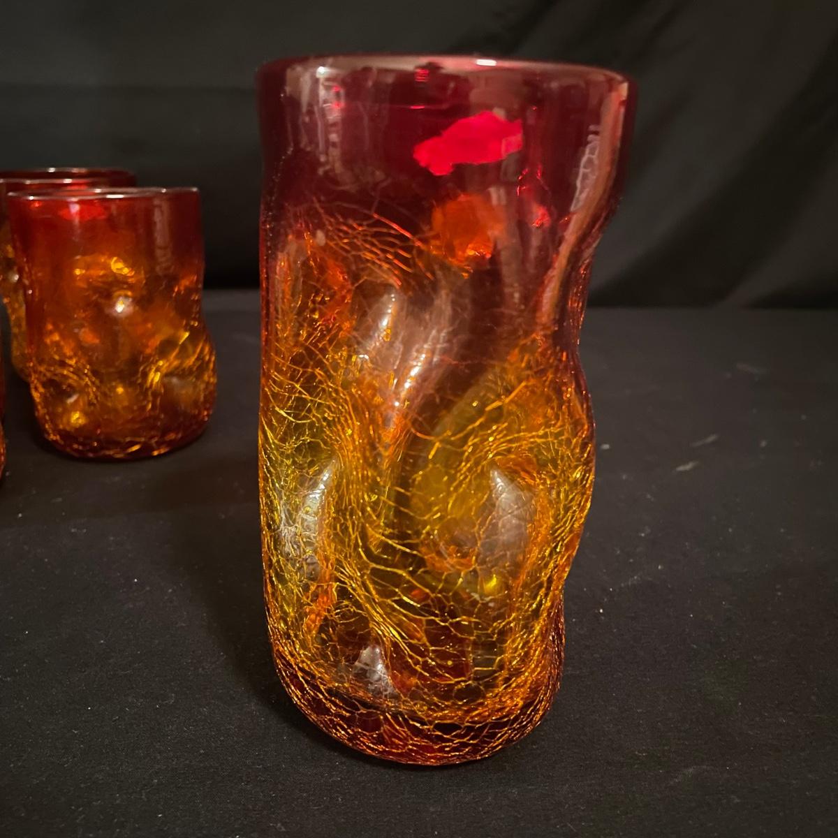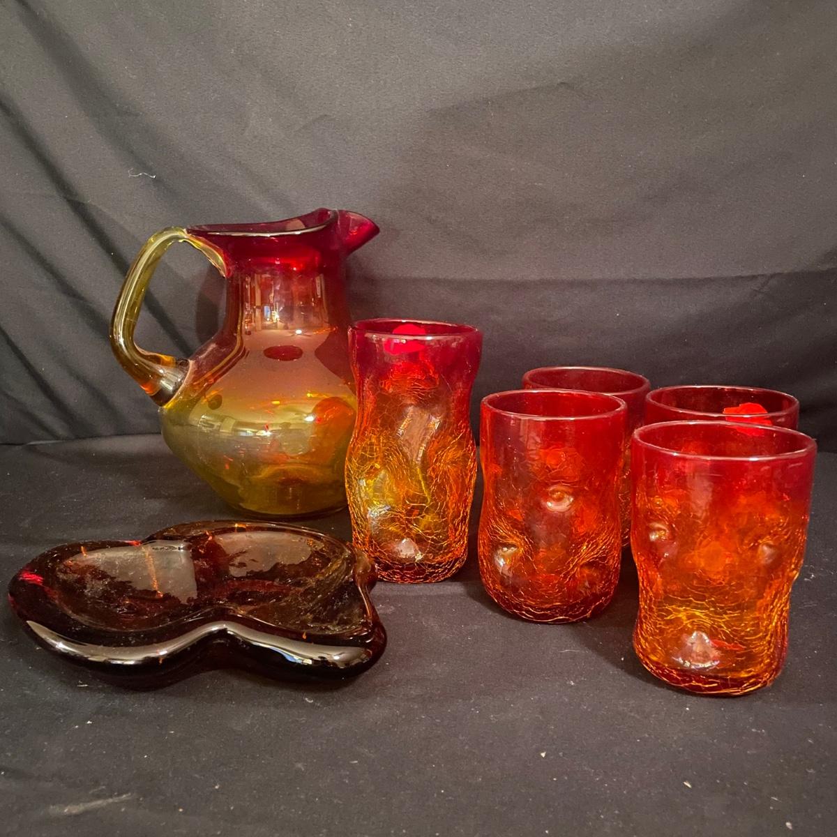 Five Blenko orange glasses have a crackle effect, four are 4.5” tall and the fifth is 6”. Also included is a thick glass shallow bowl ideal for an ashtray or for display and a pitcher that measures 5” d x 9” tall. All items are in very good condition.
