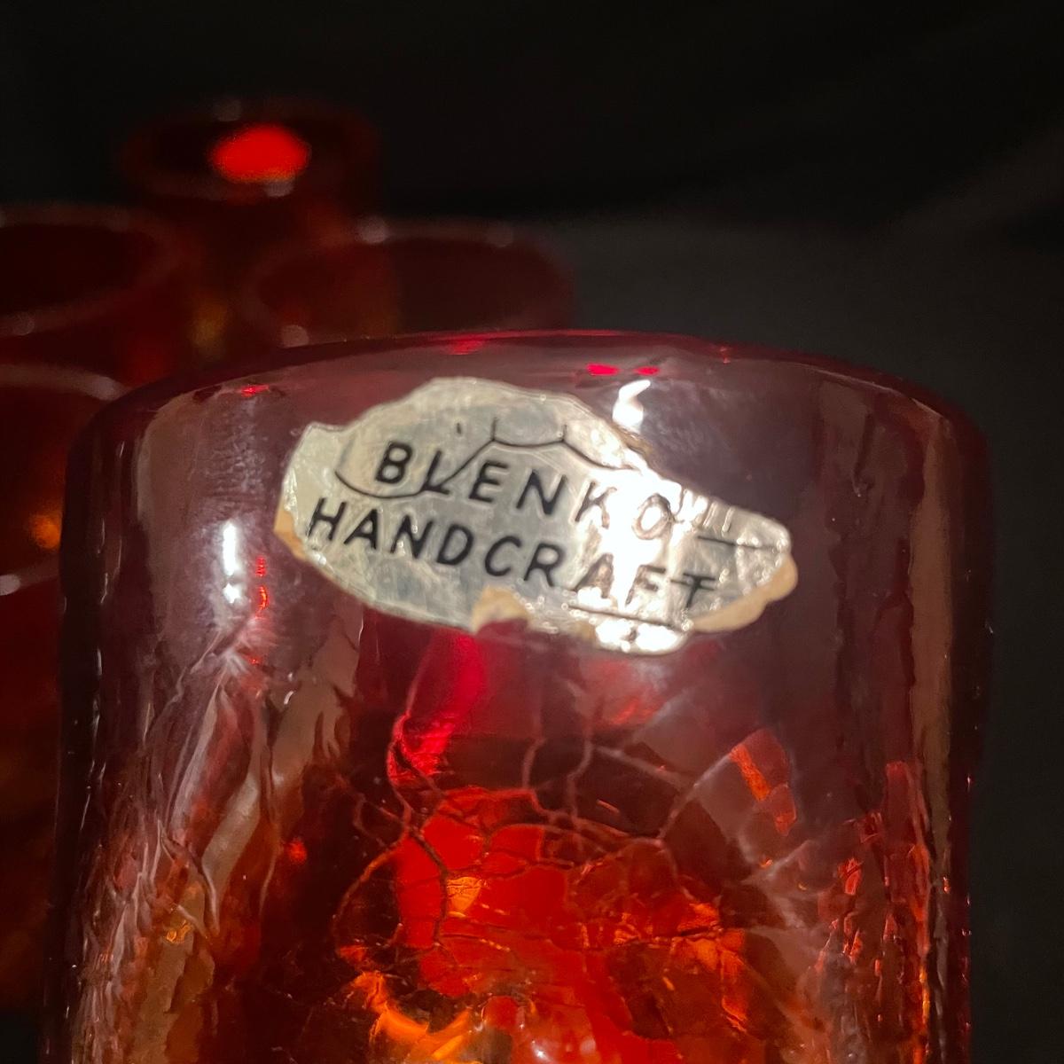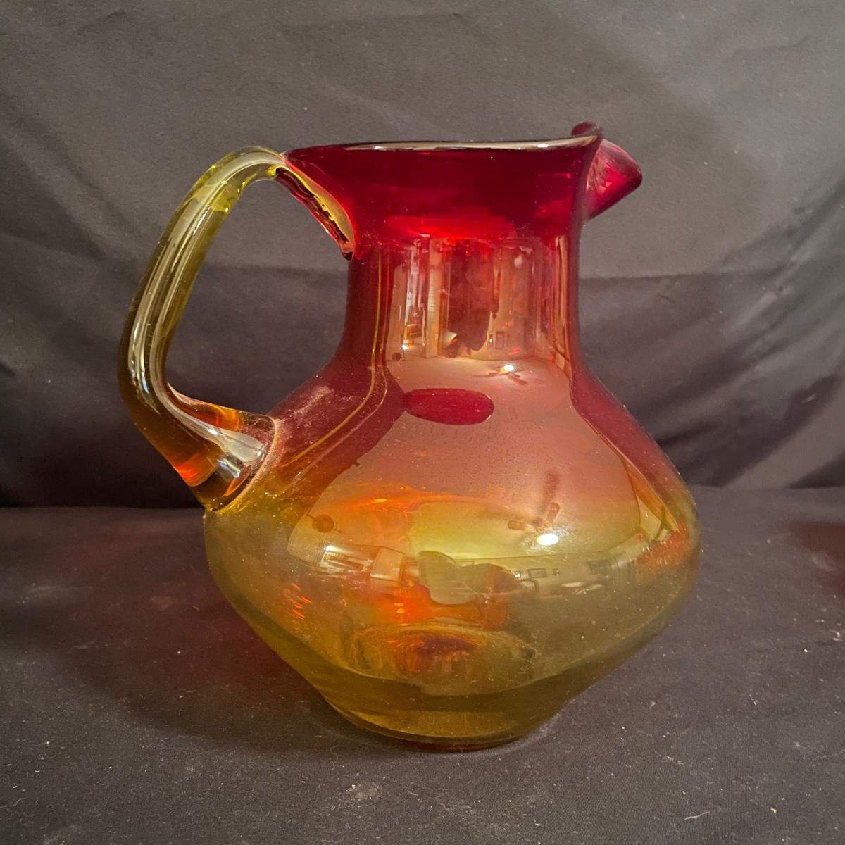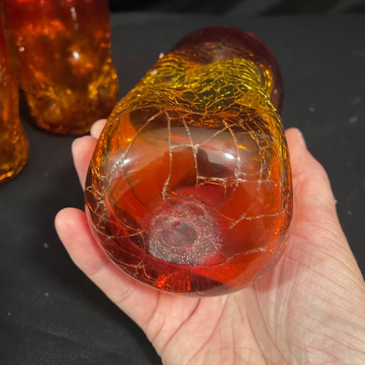 Five Blenko orange glasses have a crackle effect, four are 4.5” tall and the fifth is 6”. Also included is a thick glass shallow bowl ideal for an ashtray or for display and a pitcher that measures 5” d x 9” tall. All items are in very good condition.