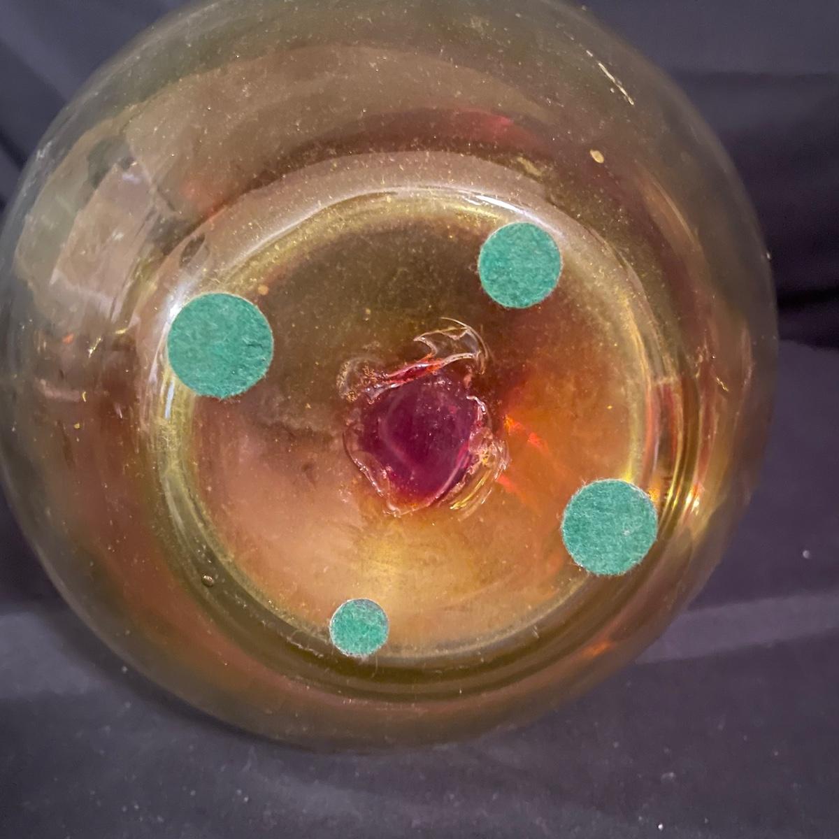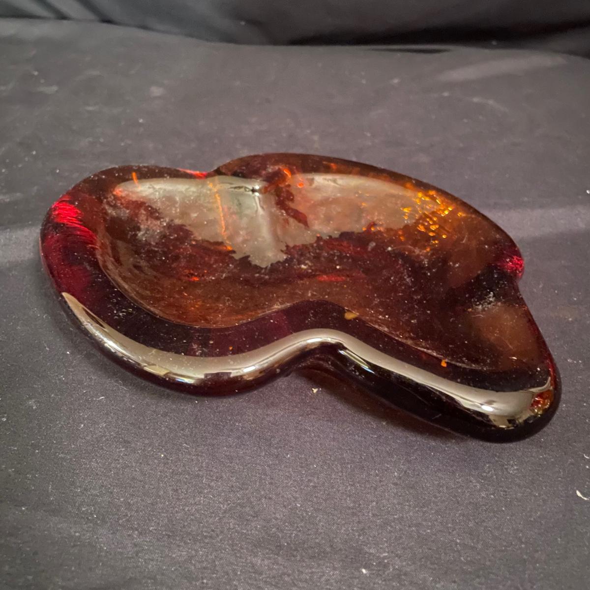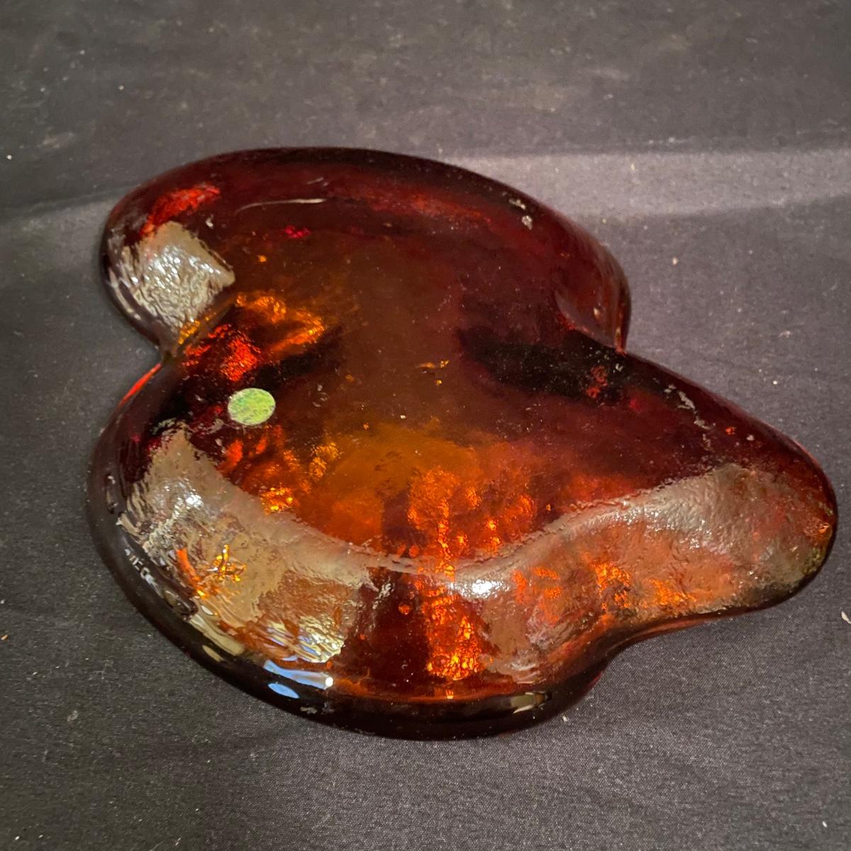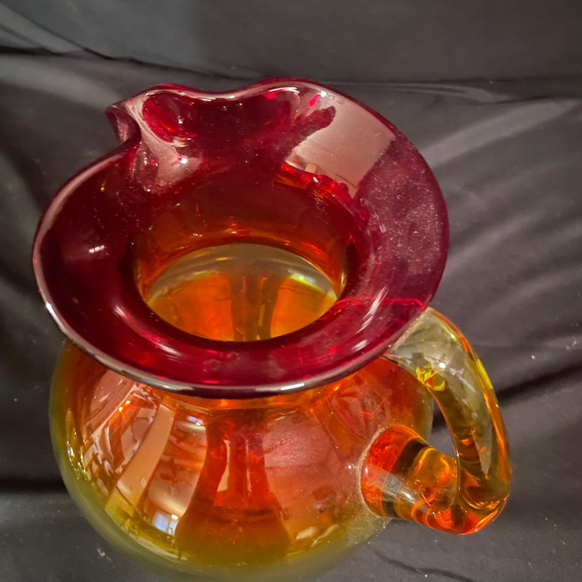 Five Blenko orange glasses have a crackle effect, four are 4.5” tall and the fifth is 6”. Also included is a thick glass shallow bowl ideal for an ashtray or for display and a pitcher that measures 5” d x 9” tall. All items are in very good condition.