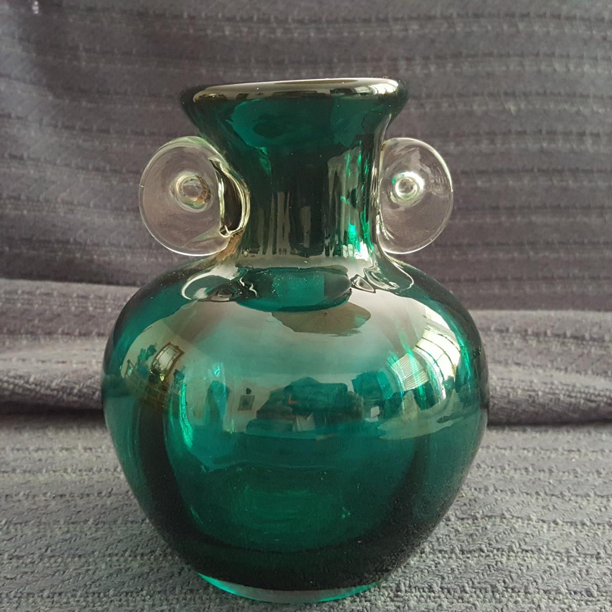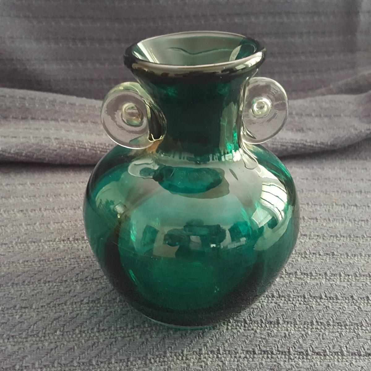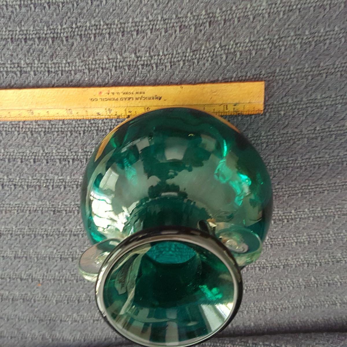 This auction lot is for a fine example of the early Blenko Glass Vase with Handles. Nice turquois-ey green color. Will look fabulous wherever it sits. Add to your collection or start one with this little beauty. See photo for sizing.