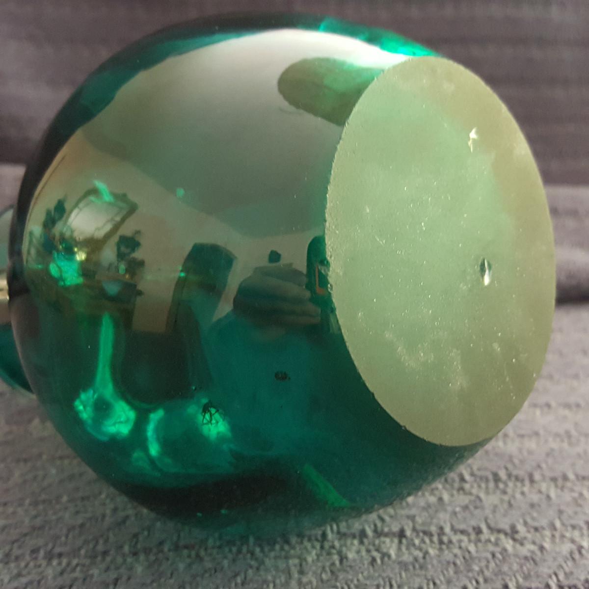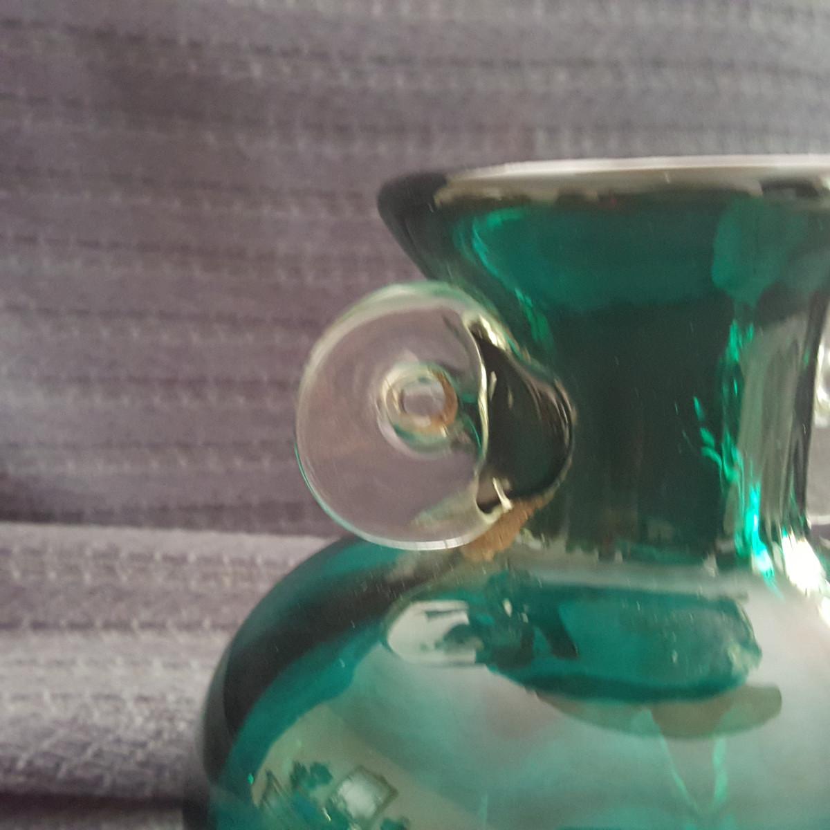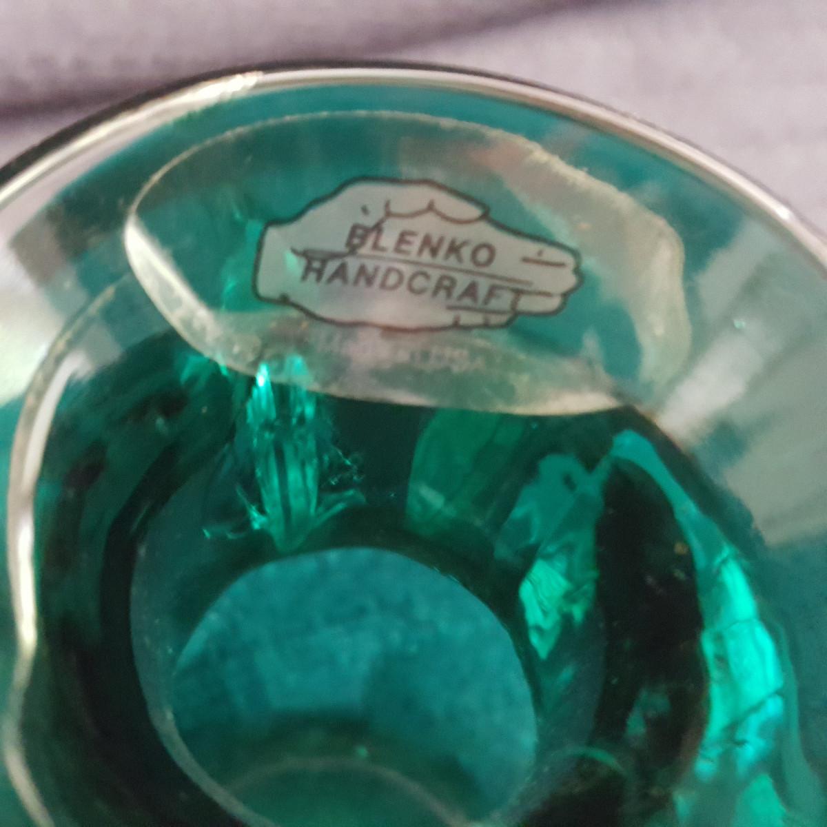 This auction lot is for a fine example of the early Blenko Glass Vase with Handles. Nice turquois-ey green color. Will look fabulous wherever it sits. Add to your collection or start one with this little beauty. See photo for sizing.
