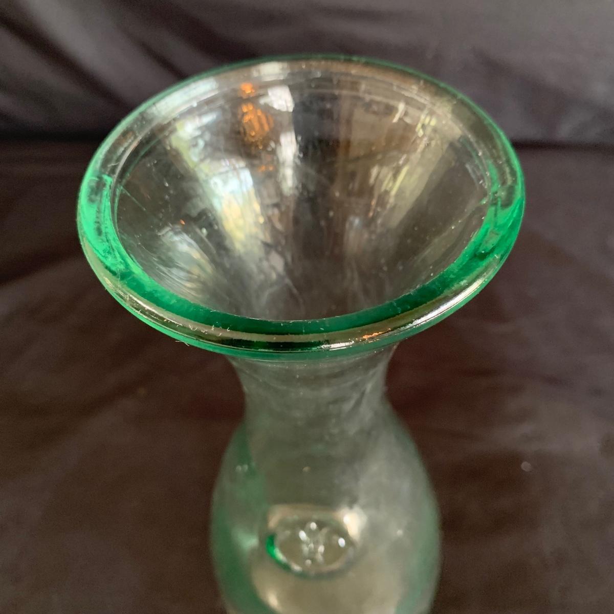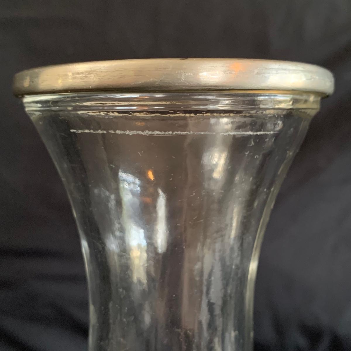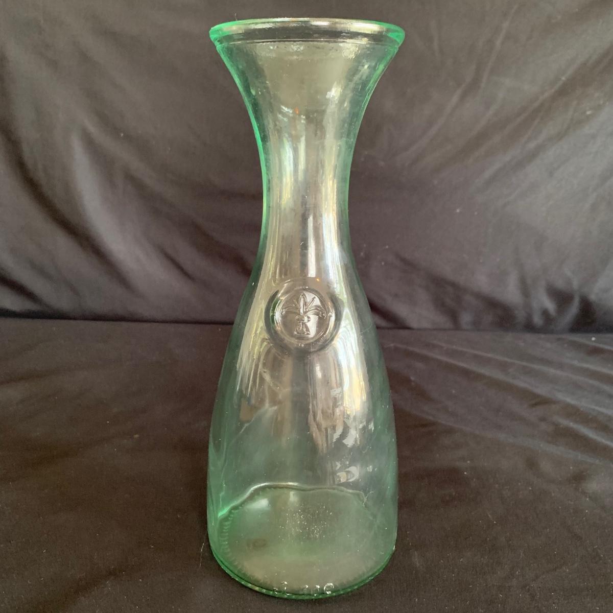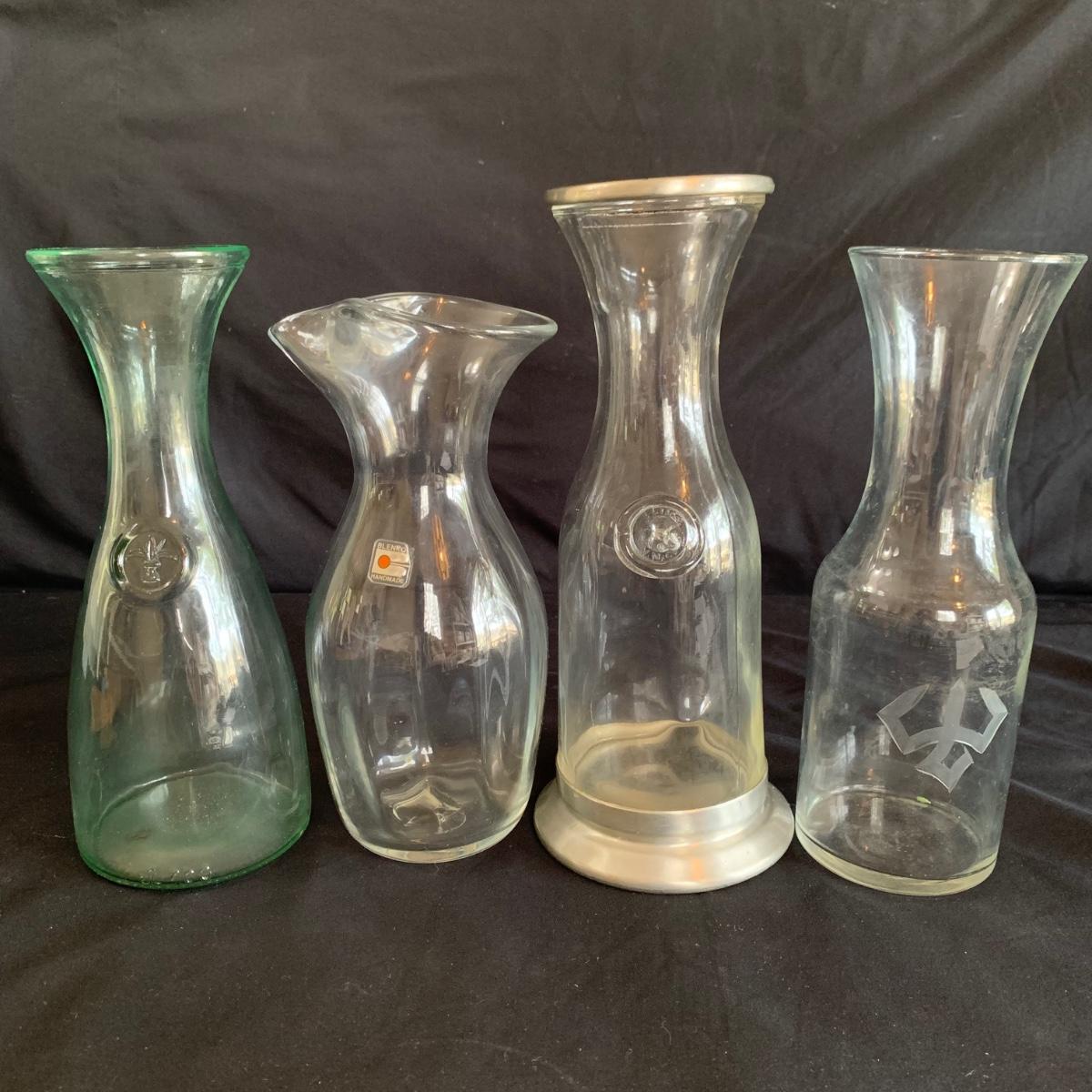 Four glass vases/carafes. One has a Blenko Handmade label and could function as a base or a pitcher. Another has a “˜Vetreria Etrusca Made in Italy’ label; it has a light green hue. One has a pewter base and rim. For reference, its base is 5“D and it is 11.75“H. It is marked “˜Eastern Pewter’. This one has a scratch in the glass near the top, see photos. The fourth has an etched design. They are all a bit dusty and could use a good cleaning.