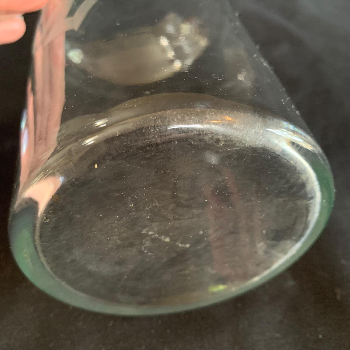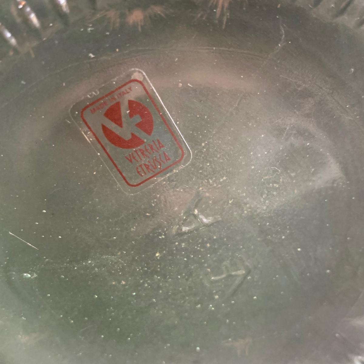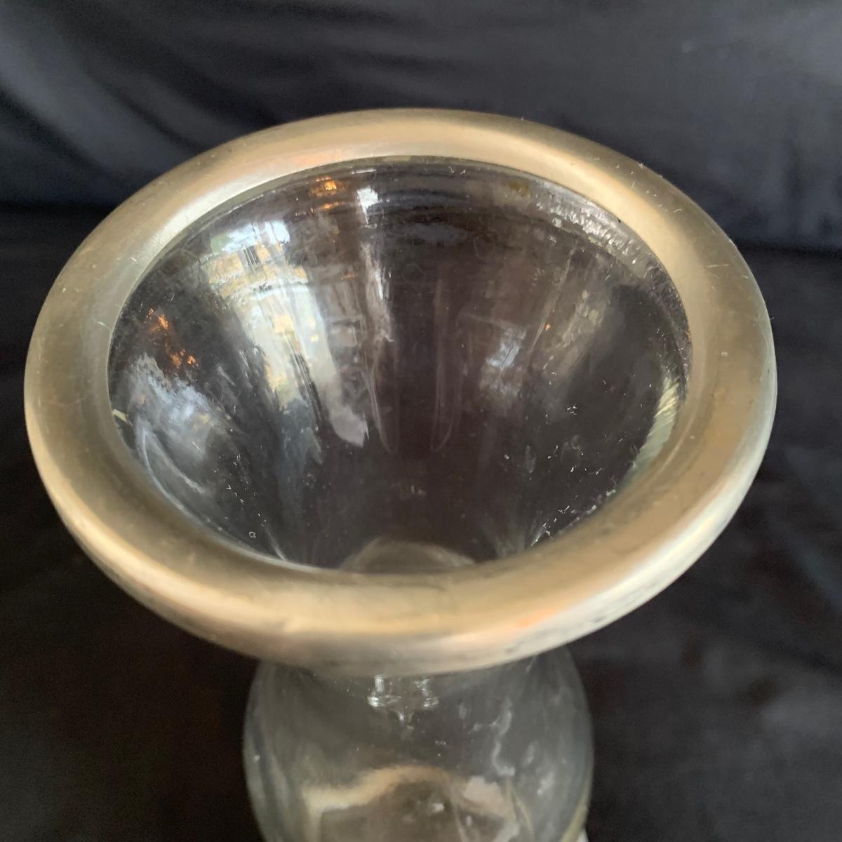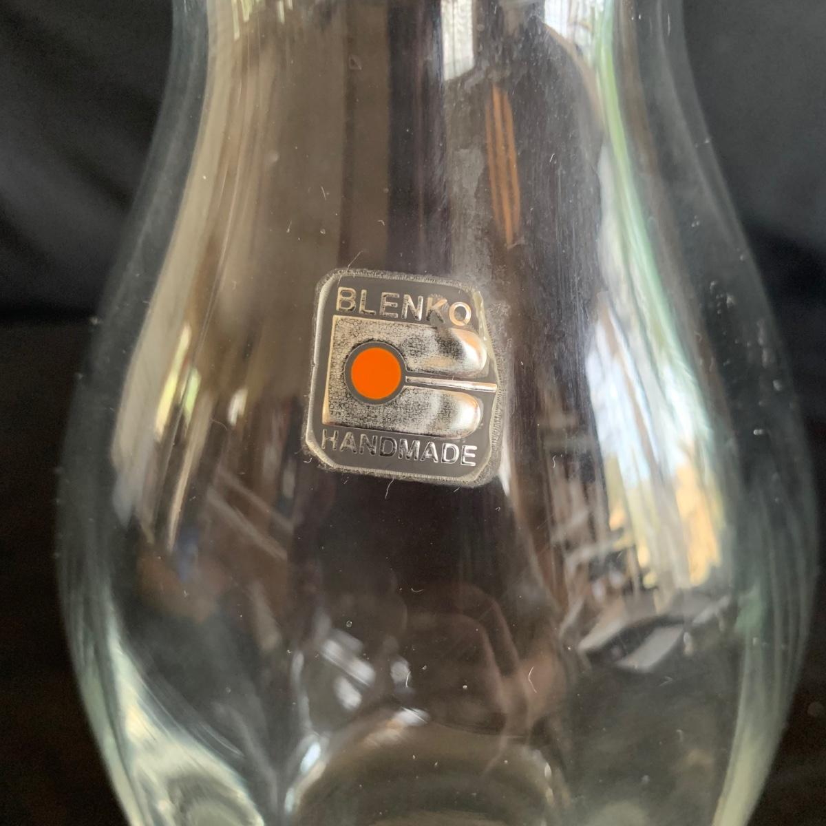 Four glass vases/carafes. One has a Blenko Handmade label and could function as a base or a pitcher. Another has a “˜Vetreria Etrusca Made in Italy’ label; it has a light green hue. One has a pewter base and rim. For reference, its base is 5“D and it is 11.75“H. It is marked “˜Eastern Pewter’. This one has a scratch in the glass near the top, see photos. The fourth has an etched design. They are all a bit dusty and could use a good cleaning.