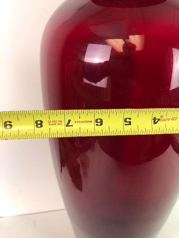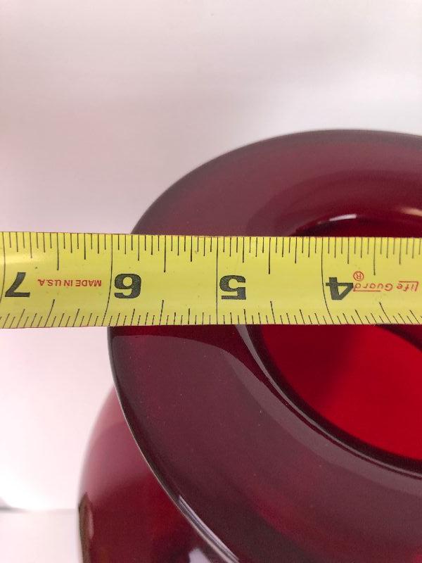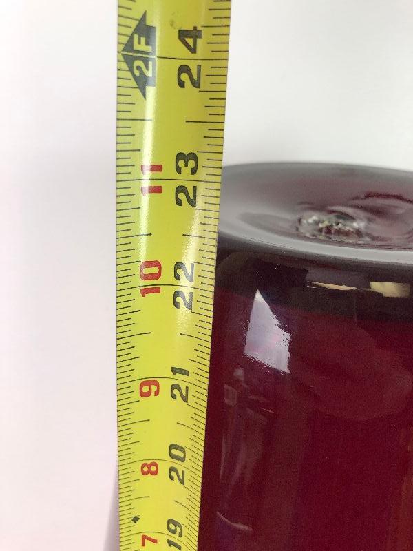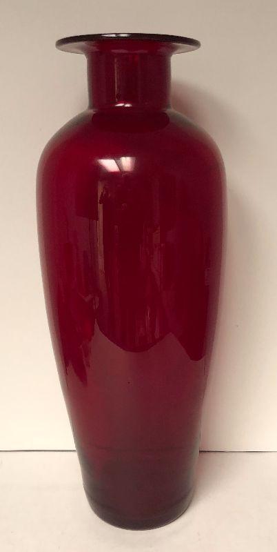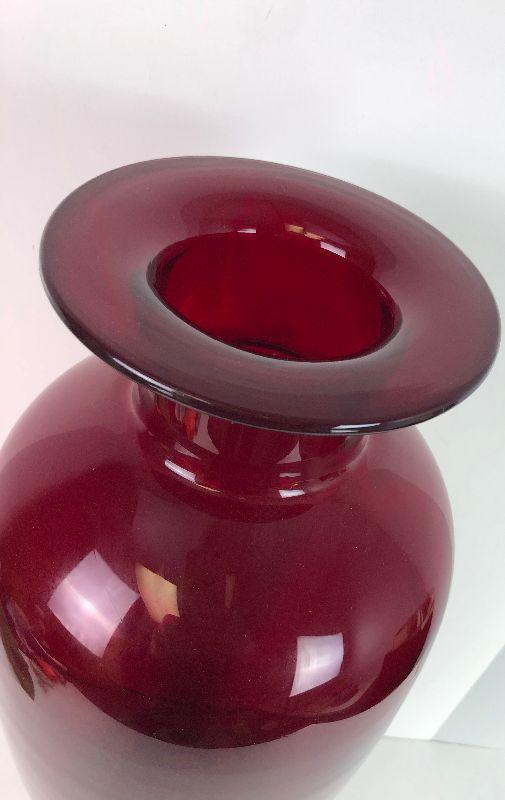 Beautiful condition, no chips cracks or flaws in this large 23" Blenko Ruby Red trumpet vase. Measures 23" tall, 5 12" at the base, 6" across the top and over 8" at its widest. Vase will be bubble wrapped and double box. This has been in a private collection for over 20 years!!! Lets make a deal