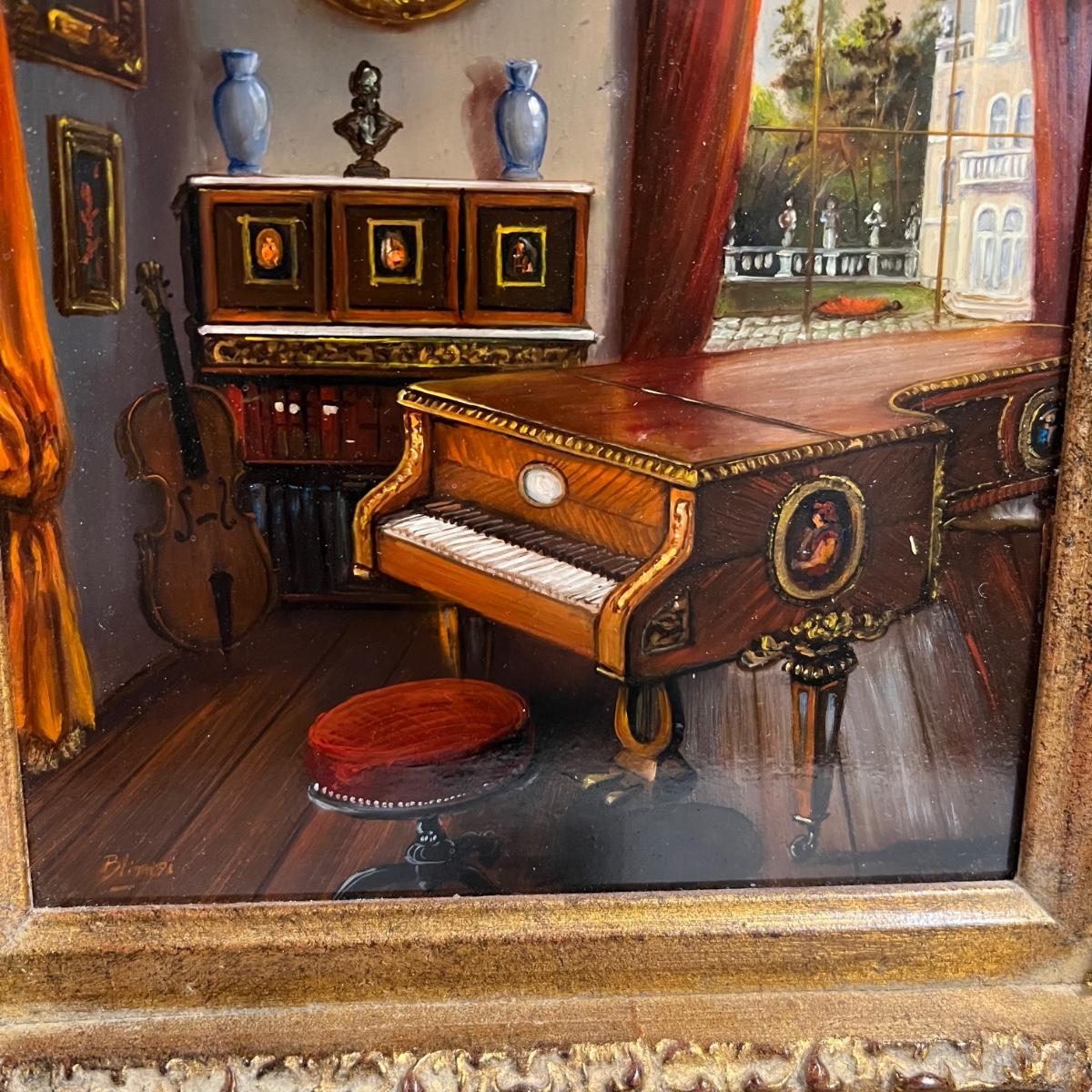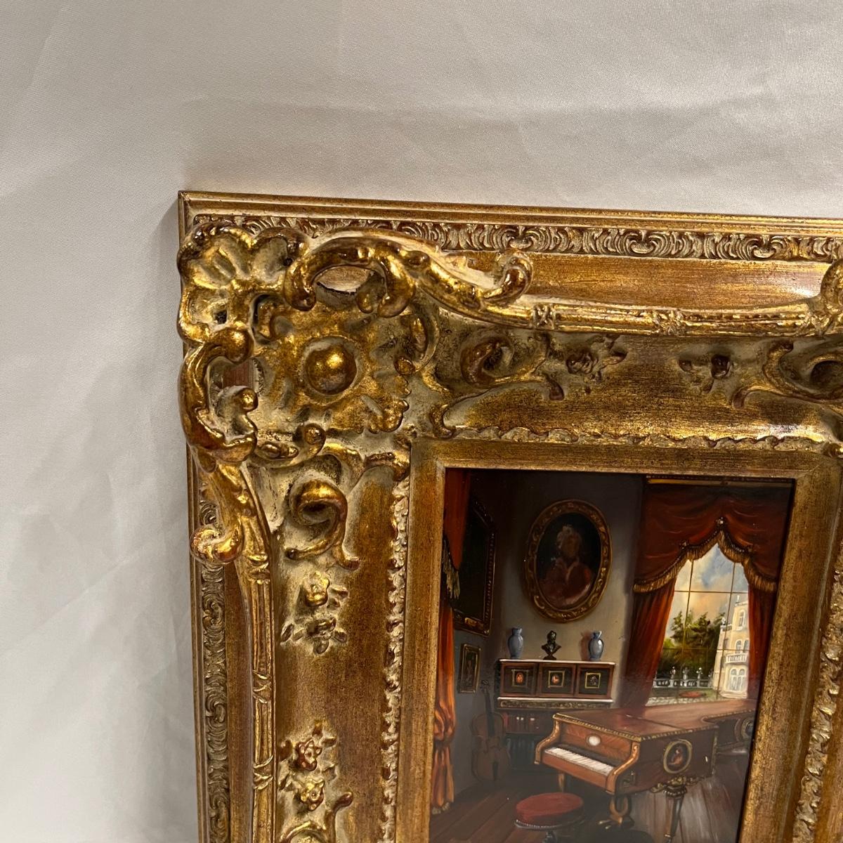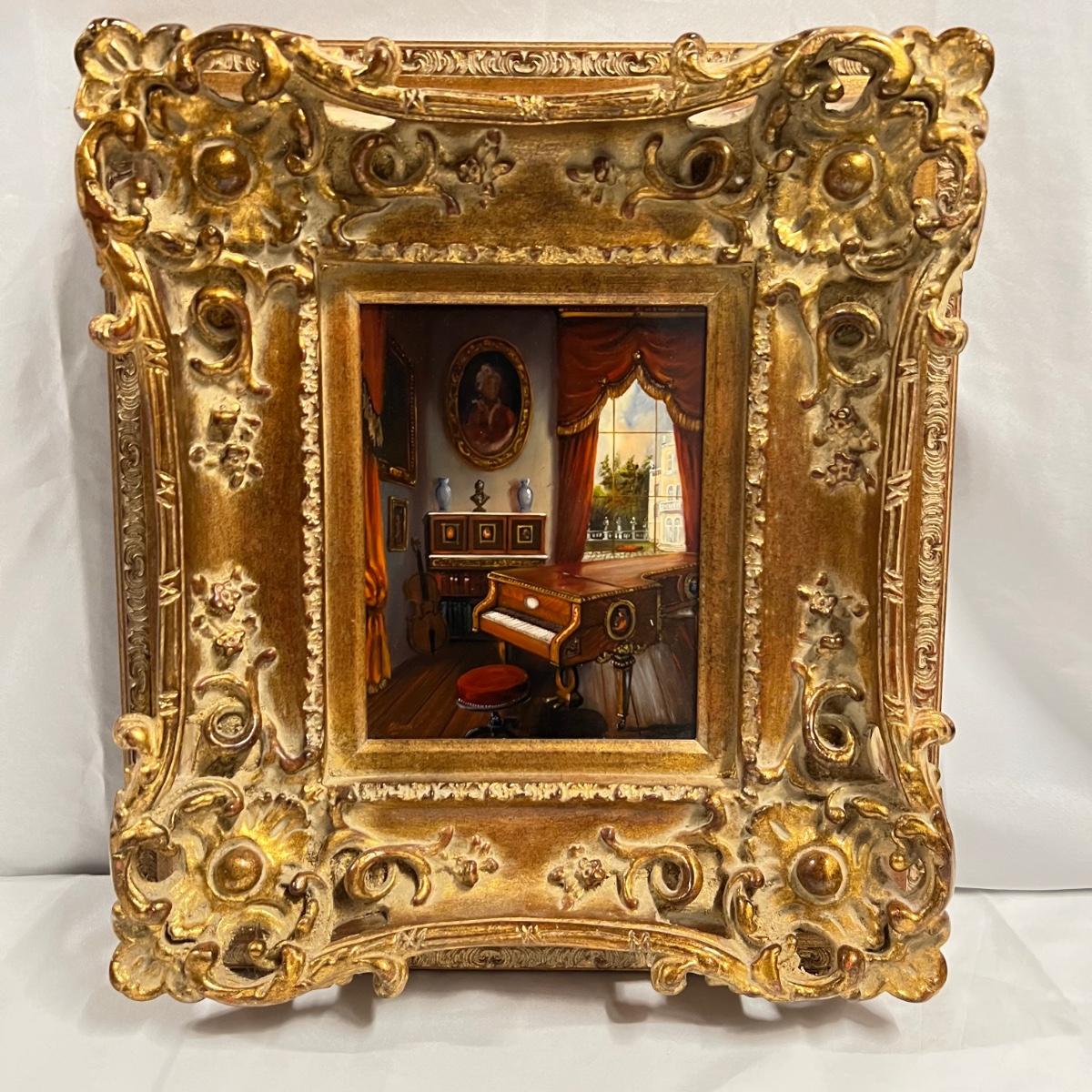 A music room scene is depicted in this oil on board painting that has the signature Blinczi. The board is mounted in an ornate gilt frame which measures 17.5” x 3.75” x 19.5”.