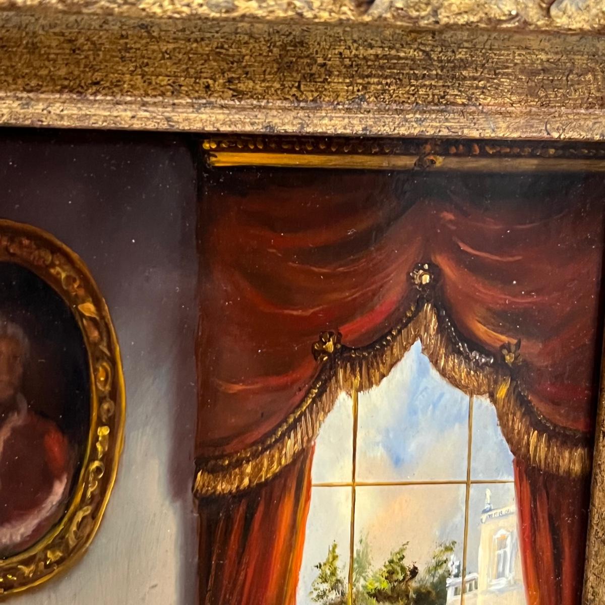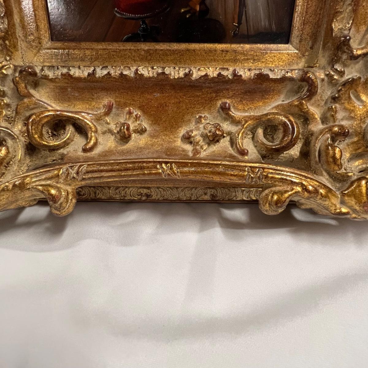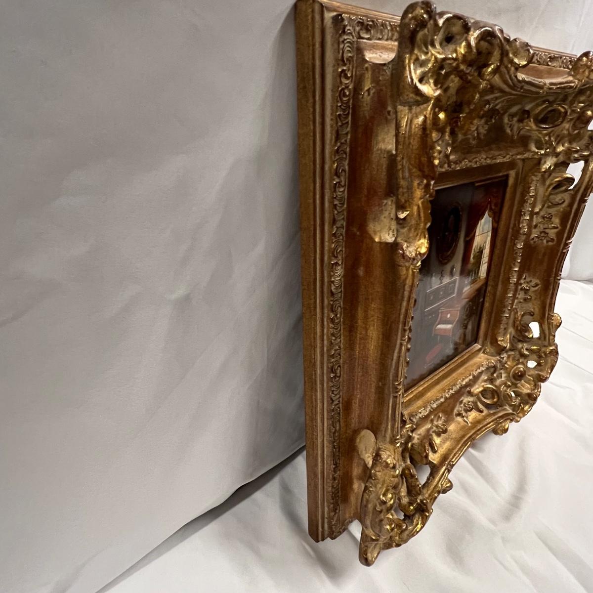 A music room scene is depicted in this oil on board painting that has the signature Blinczi. The board is mounted in an ornate gilt frame which measures 17.5” x 3.75” x 19.5”.