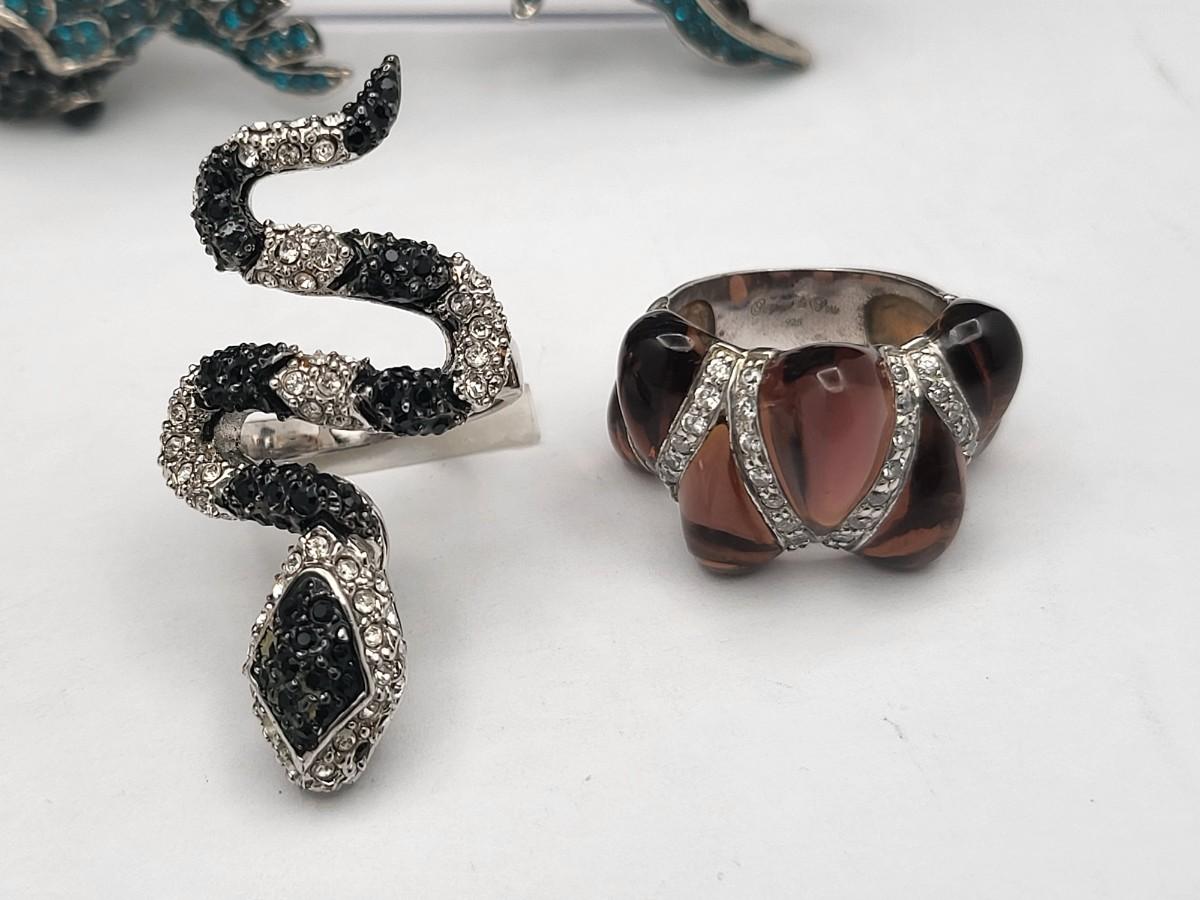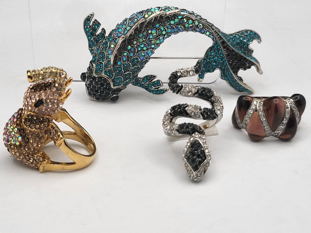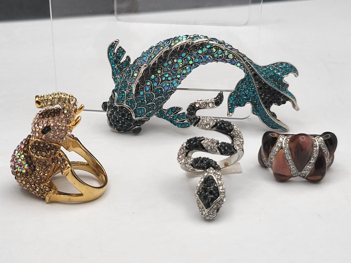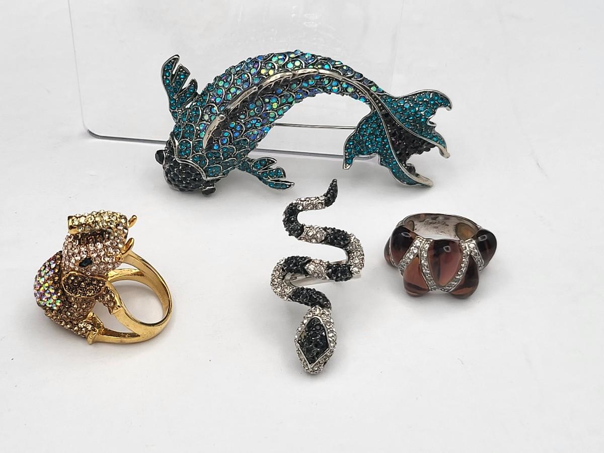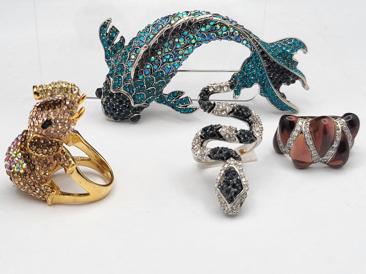 Figural rings and brooch: Gold tone metal, colorful crystal elephant ring (trunk up for good luck), size 5 (missing 3 tiny stones). Silver tone, curvy black & white rhinestone snake ring, size 7.5. Large koi fish brooch with teal, black & aurora borealis crystals, measuring 3" long x 1.5" wide. Angelique de Paris, 925 resin & rhinestone cocktail ring, size 5.