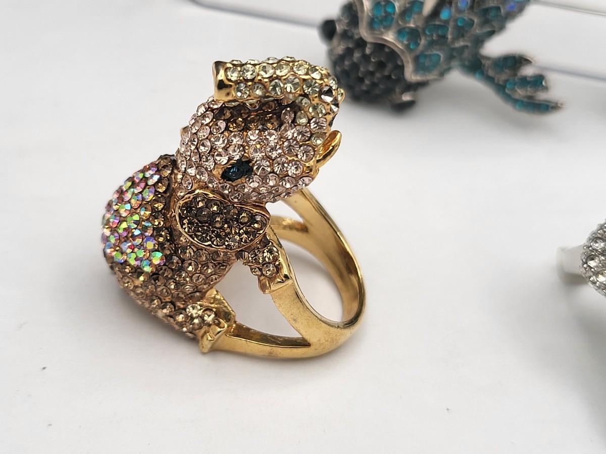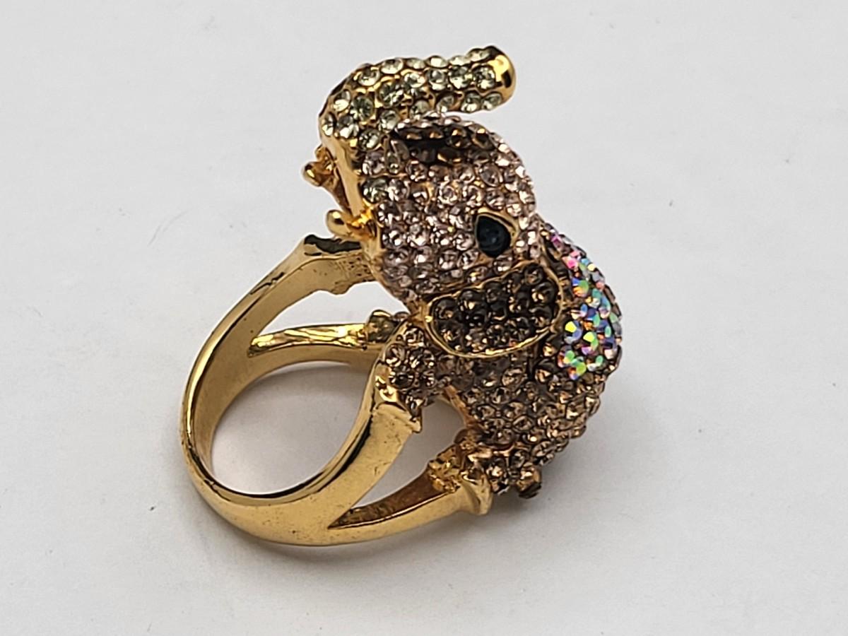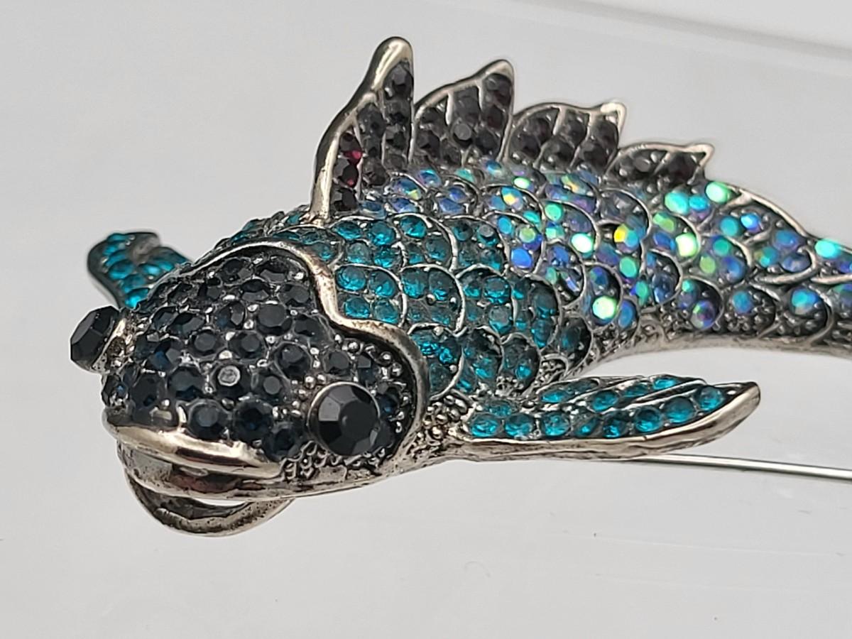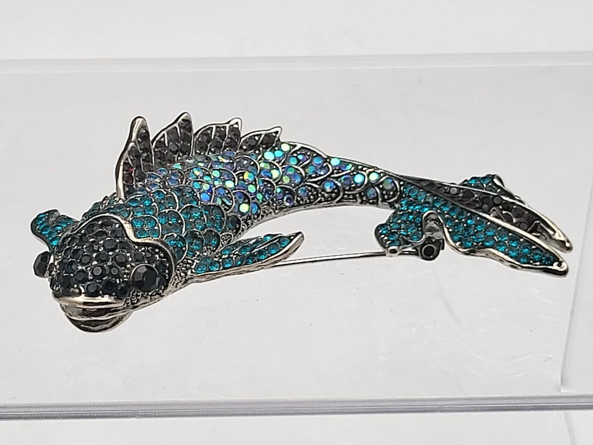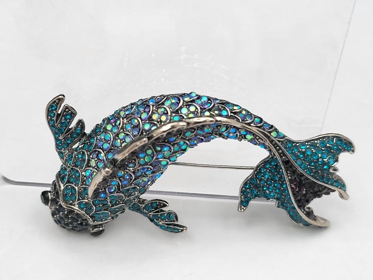 Figural rings and brooch: Gold tone metal, colorful crystal elephant ring (trunk up for good luck), size 5 (missing 3 tiny stones). Silver tone, curvy black & white rhinestone snake ring, size 7.5. Large koi fish brooch with teal, black & aurora borealis crystals, measuring 3" long x 1.5" wide. Angelique de Paris, 925 resin & rhinestone cocktail ring, size 5.
