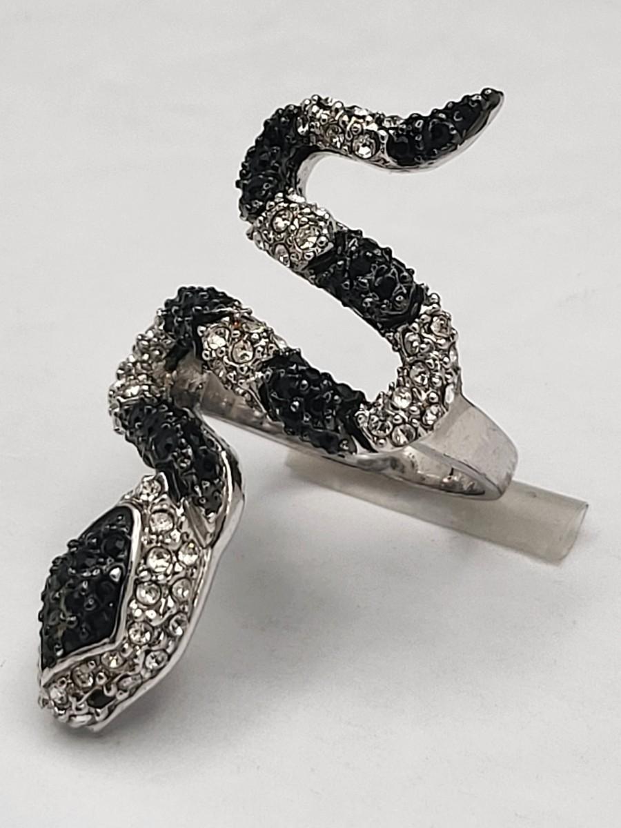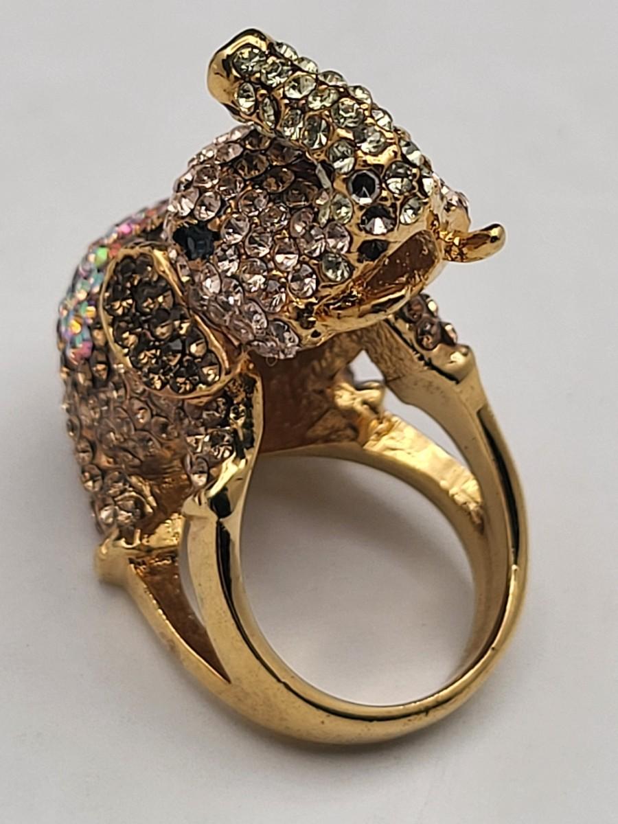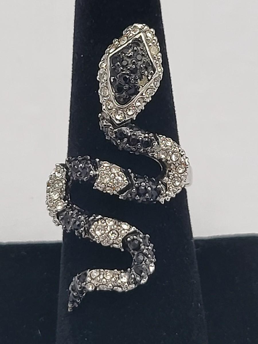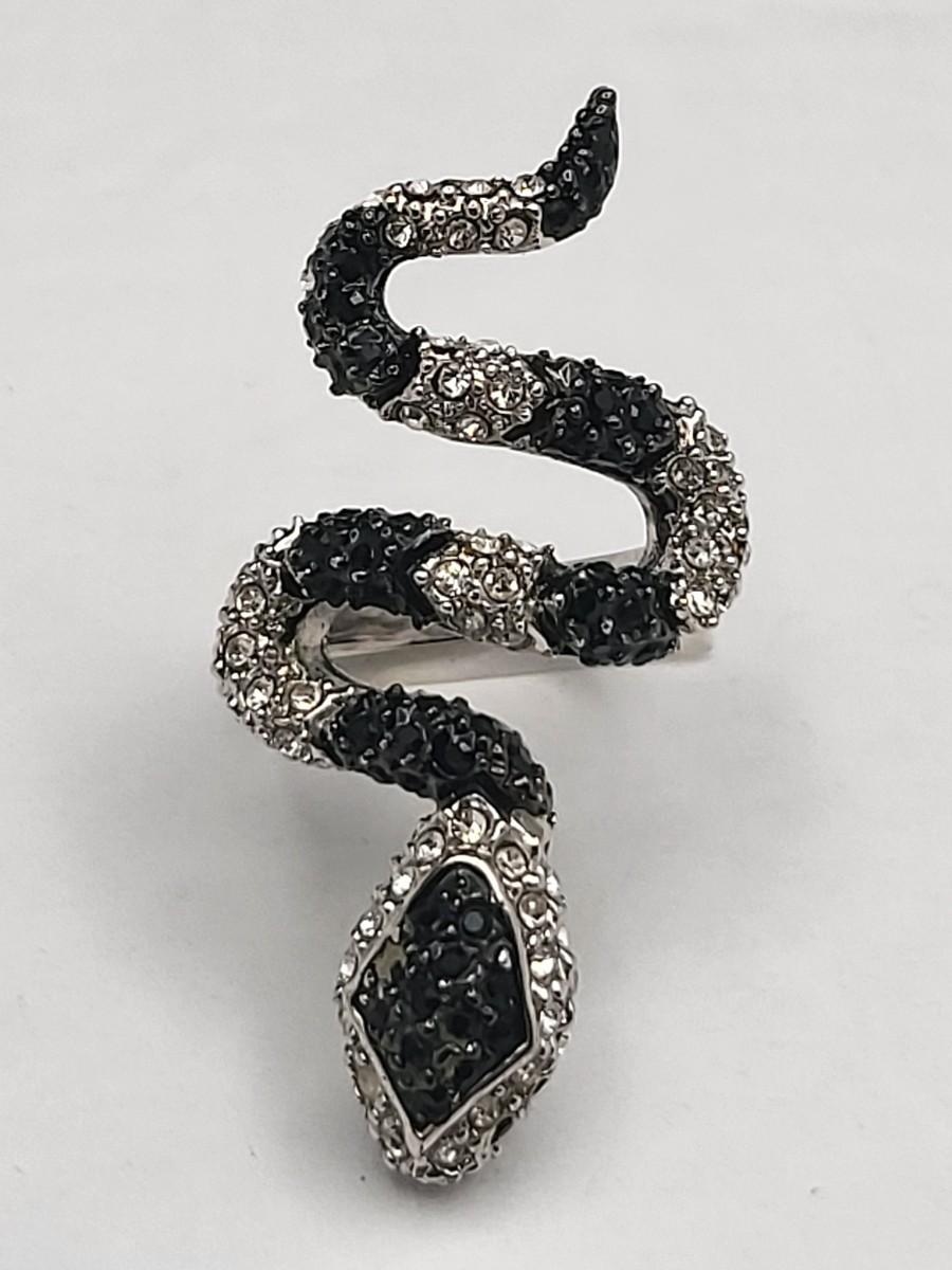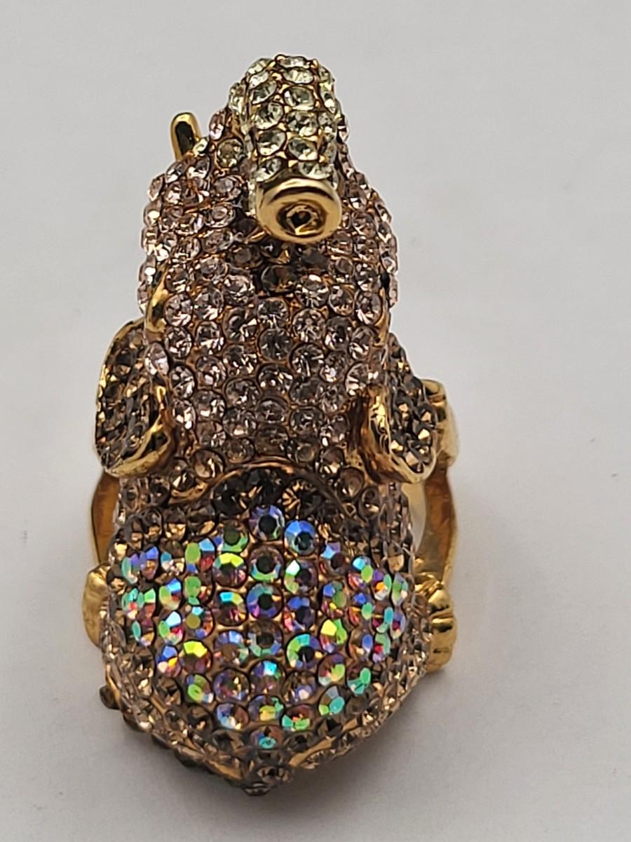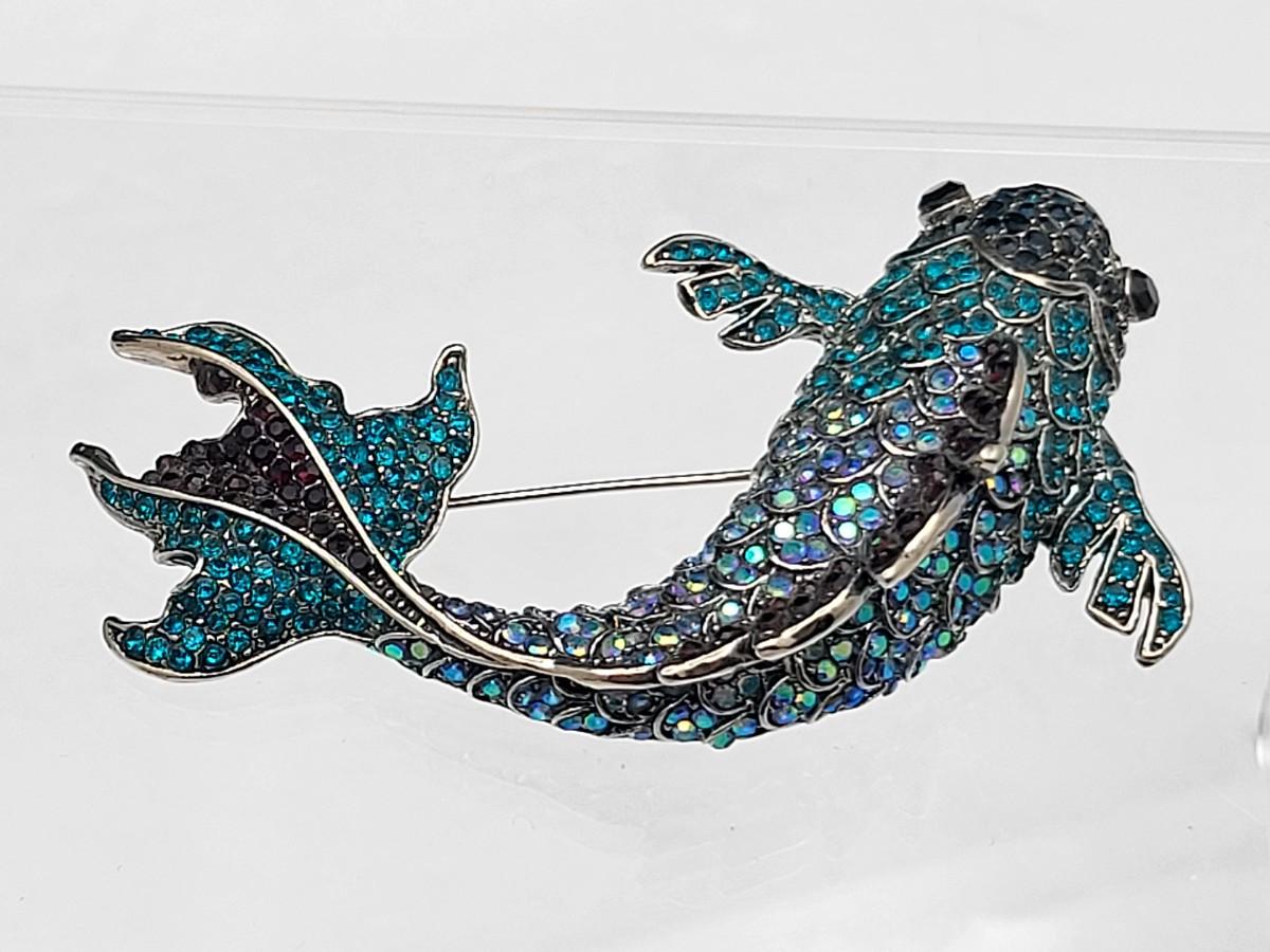 Figural rings and brooch: Gold tone metal, colorful crystal elephant ring (trunk up for good luck), size 5 (missing 3 tiny stones). Silver tone, curvy black & white rhinestone snake ring, size 7.5. Large koi fish brooch with teal, black & aurora borealis crystals, measuring 3" long x 1.5" wide. Angelique de Paris, 925 resin & rhinestone cocktail ring, size 5.