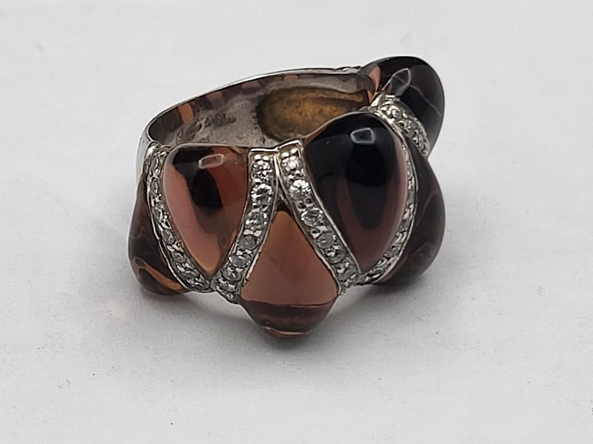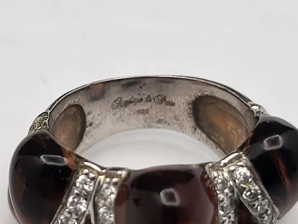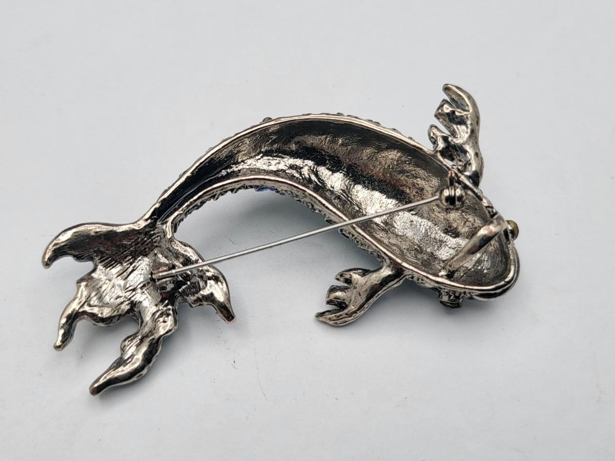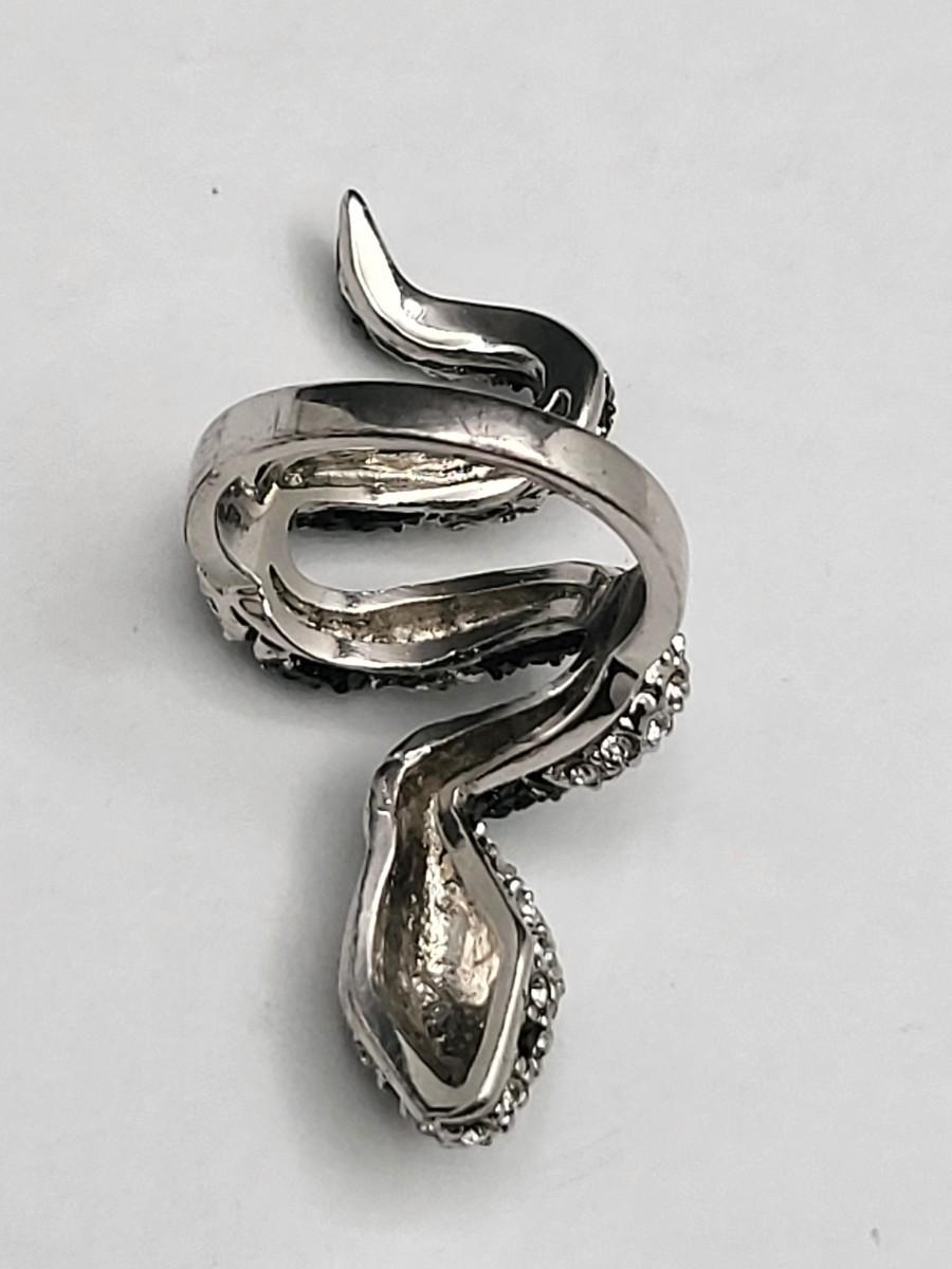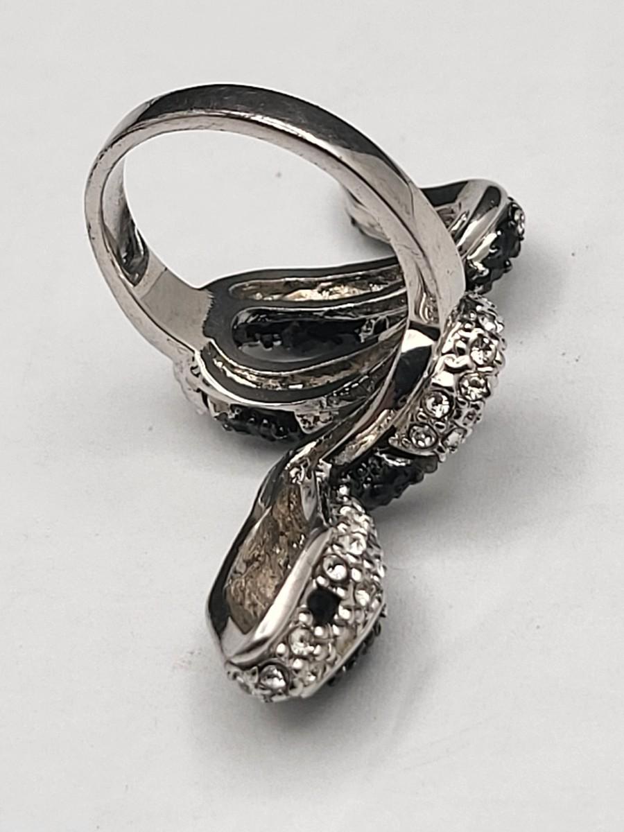 Figural rings and brooch: Gold tone metal, colorful crystal elephant ring (trunk up for good luck), size 5 (missing 3 tiny stones). Silver tone, curvy black & white rhinestone snake ring, size 7.5. Large koi fish brooch with teal, black & aurora borealis crystals, measuring 3" long x 1.5" wide. Angelique de Paris, 925 resin & rhinestone cocktail ring, size 5.