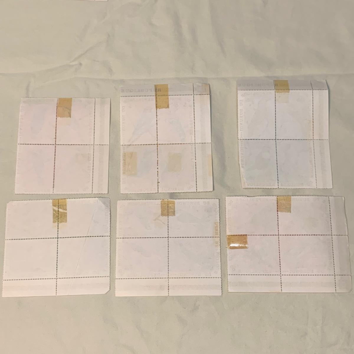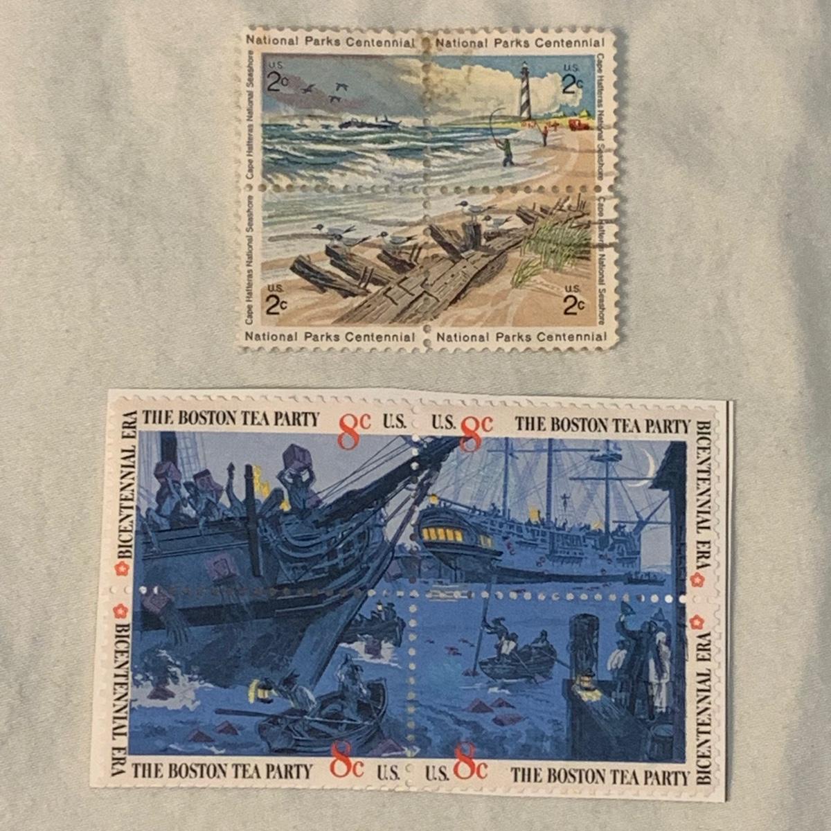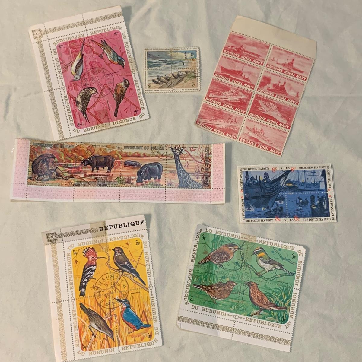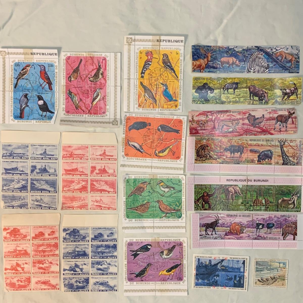 18 sets of block and plate block stamps. Included are: 8¢ US Boston Tea Party, 2¢ US National Parks Centennial, twelve blocks from the Republique Du Burundi, two Britain’s Royal Navy, and two Tanks of the Allies.