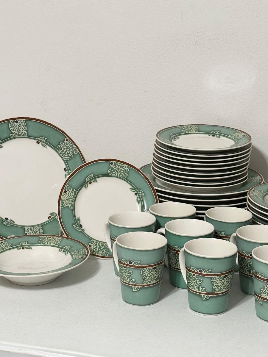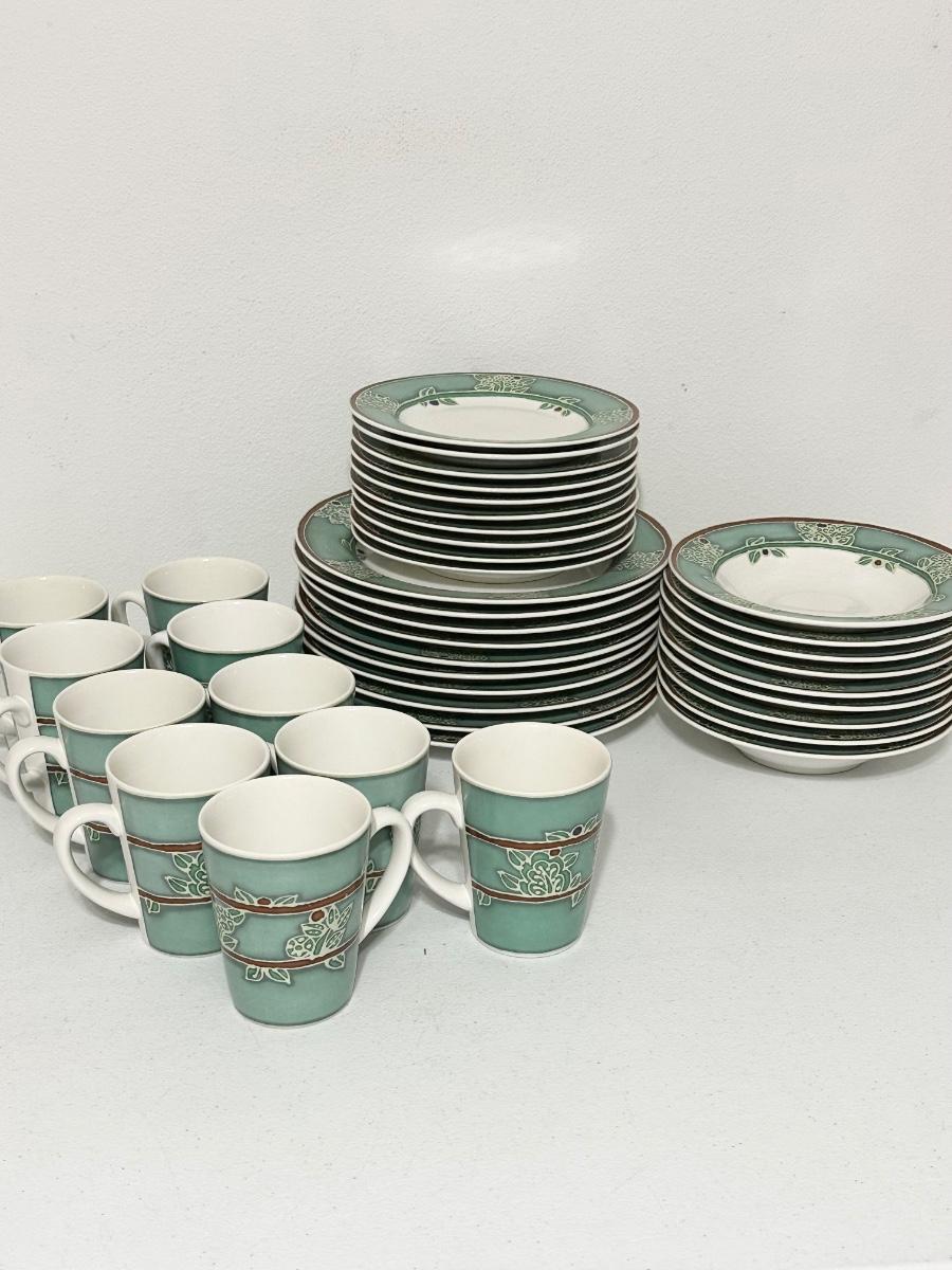 Each = Dinner plate, salad plate. Soup. Bowl and mugs