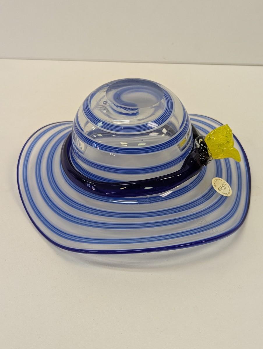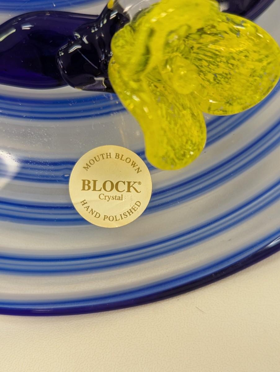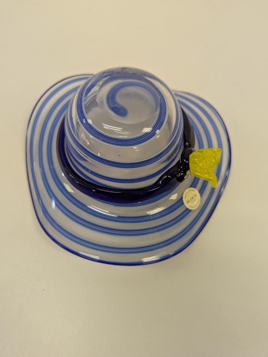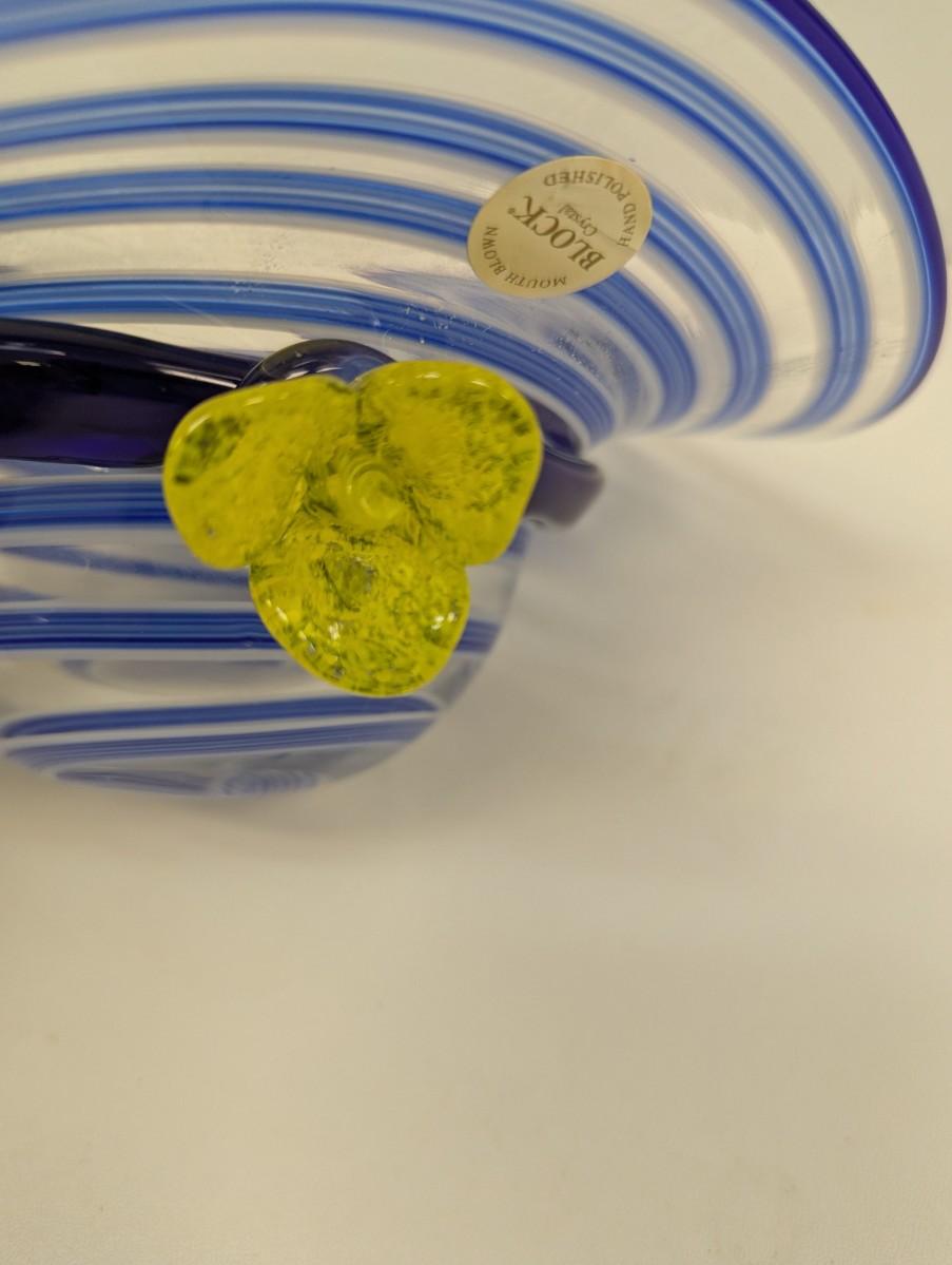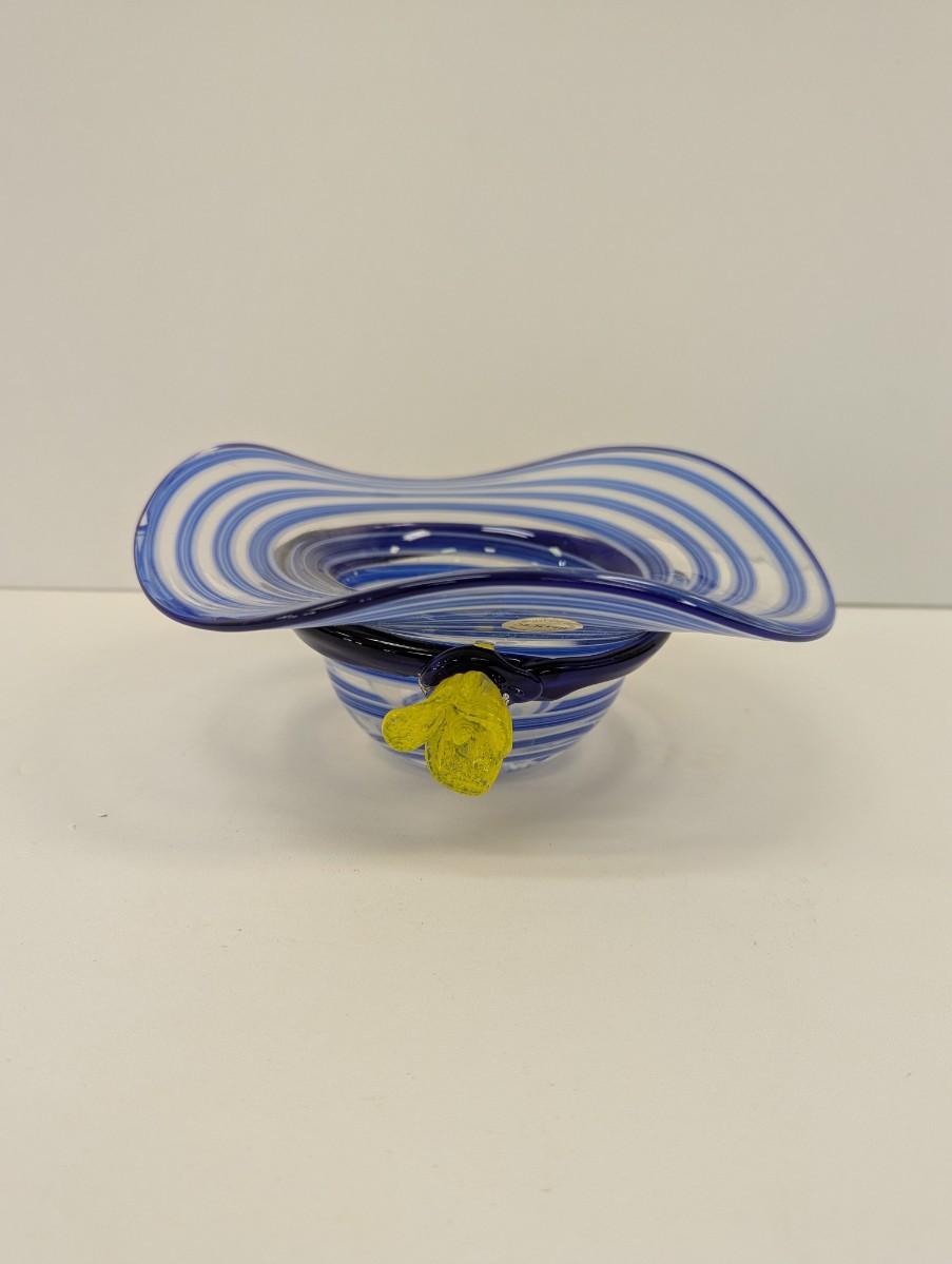 Block Mouth Blown Crystal Hand Polished Blue Swirl Hat Candy Bowl Yellow Flower #69
