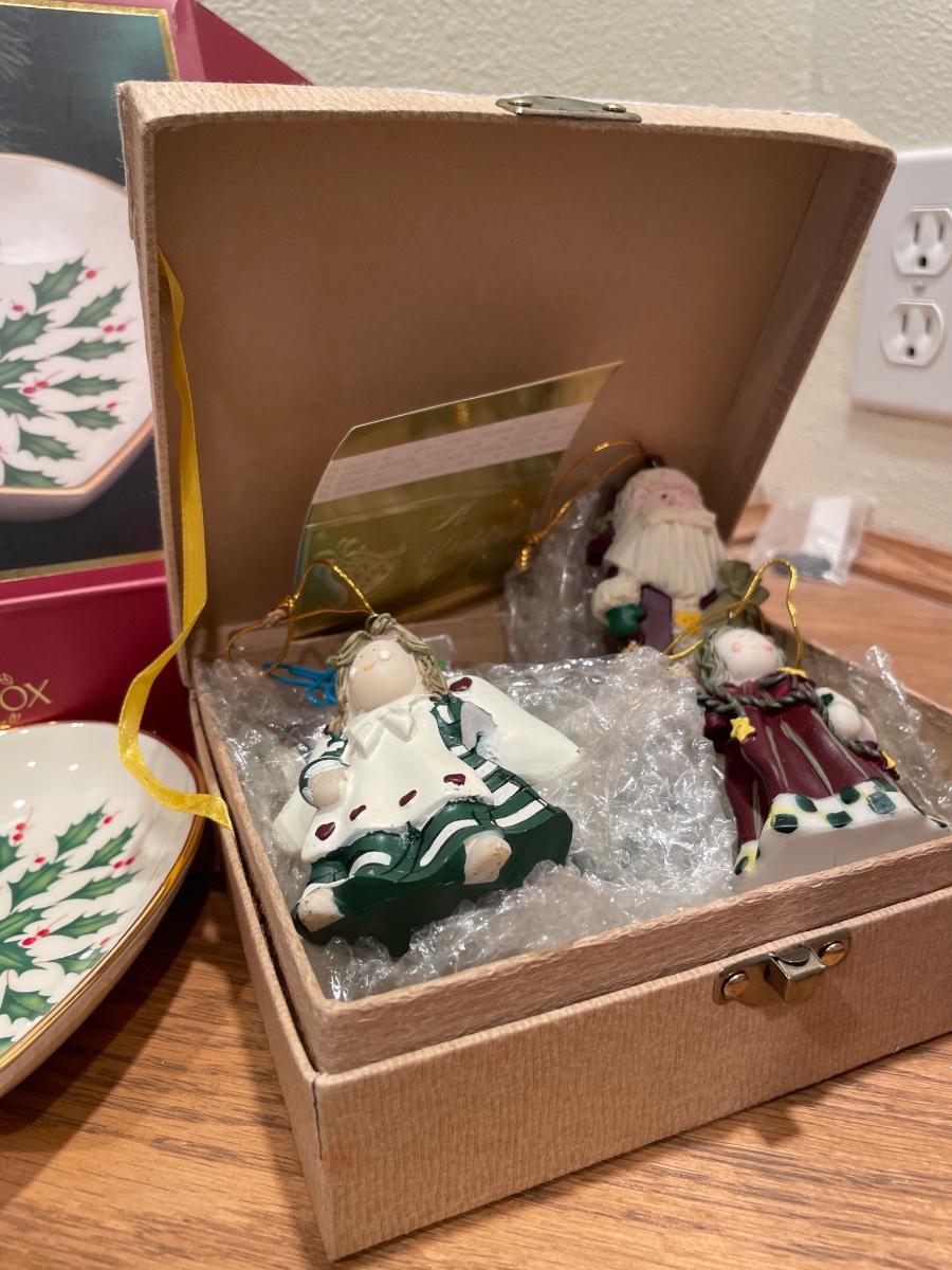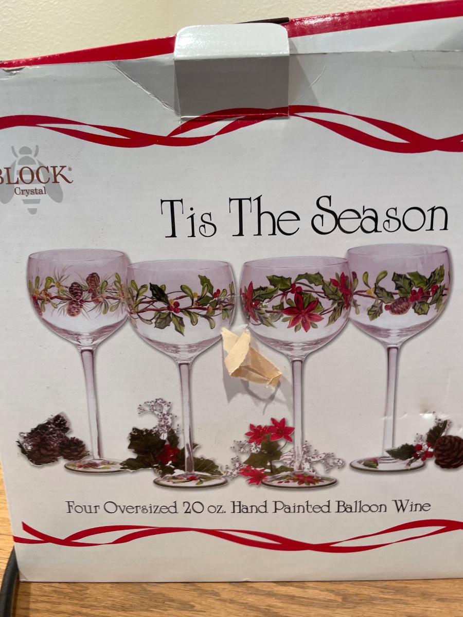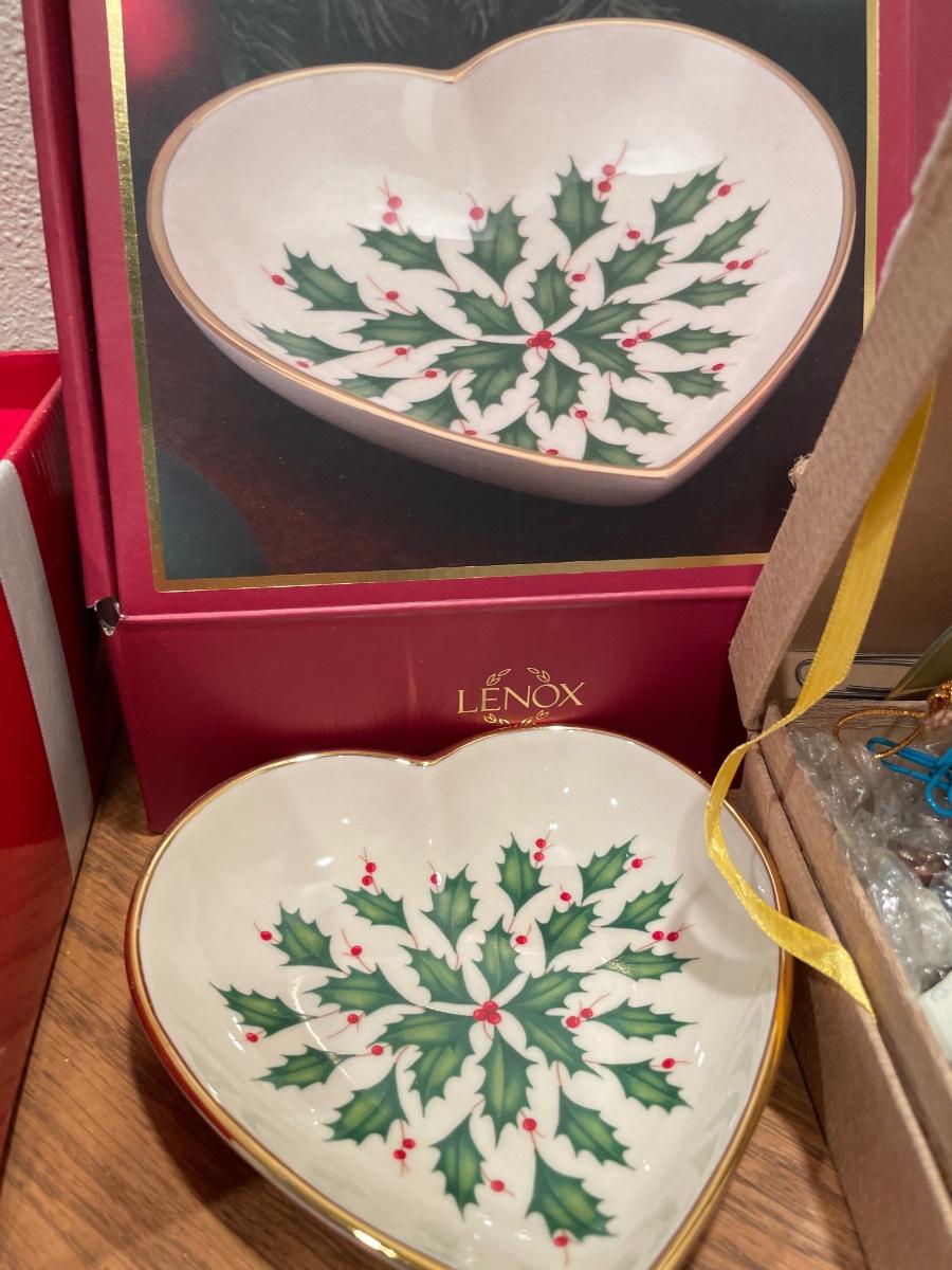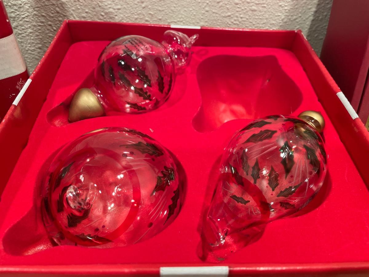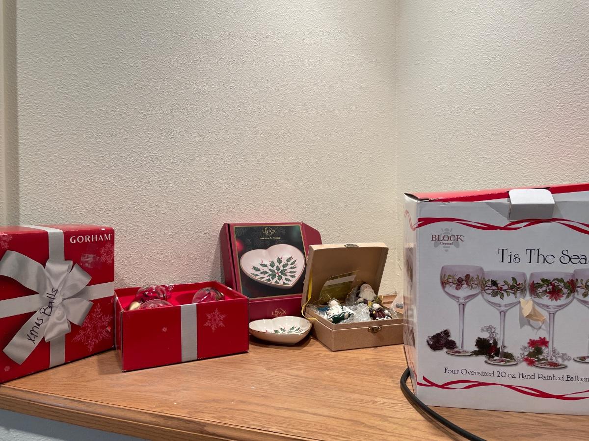 Block tall stem wine glasses, ornaments, Lenox heart, and three Gorham Christmas balls