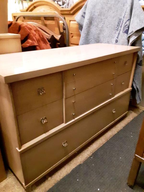 Vintage 8 drawer dresser with original knobs. Has matching wood bed frame sold seperately.