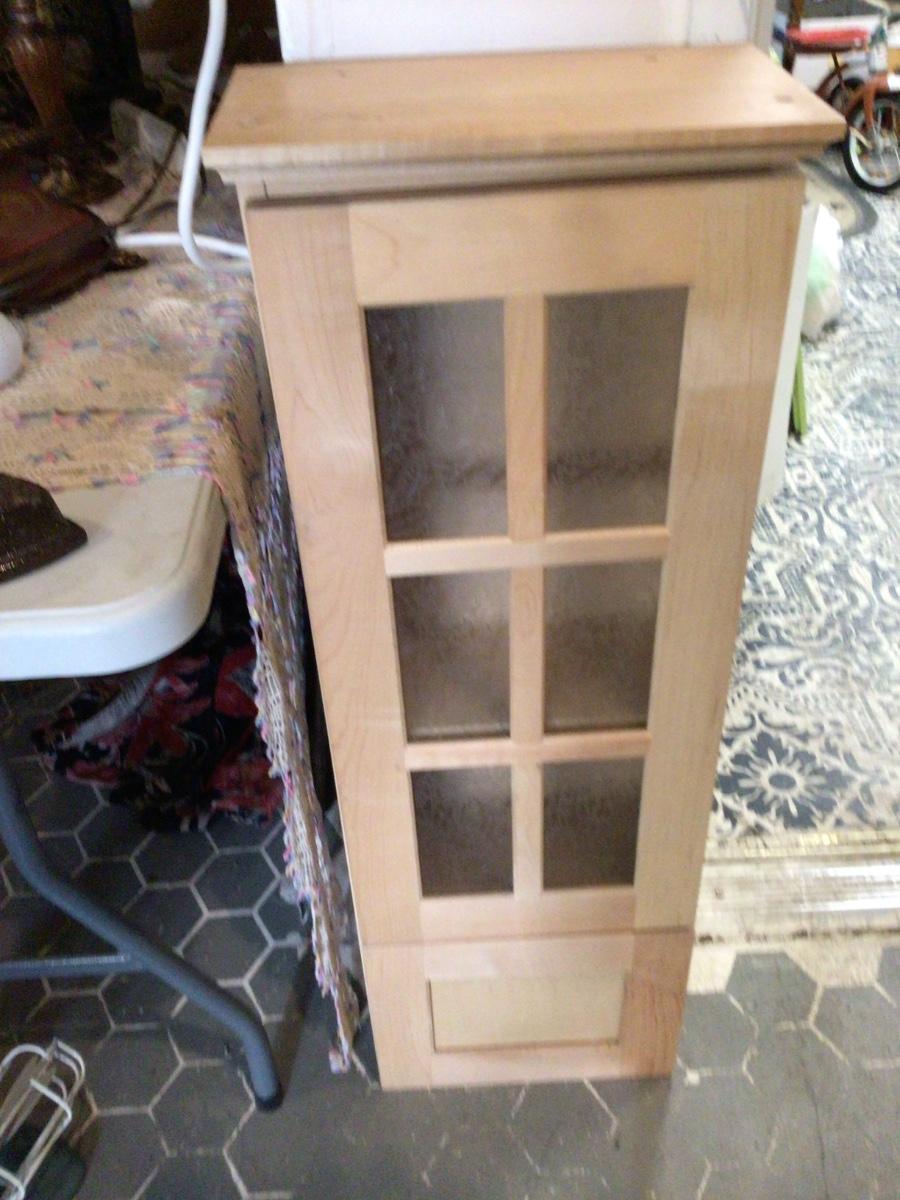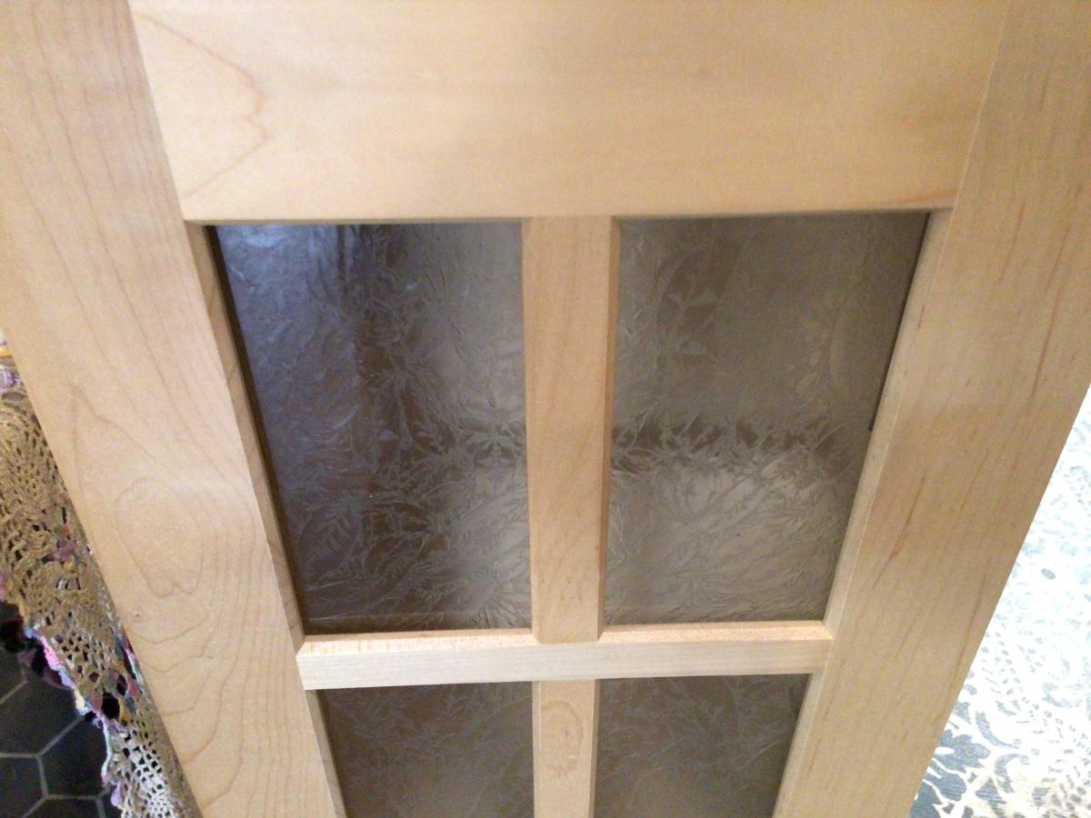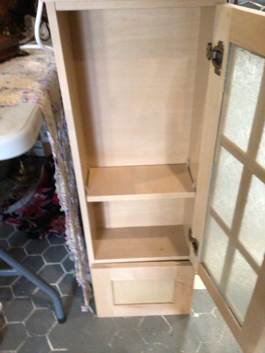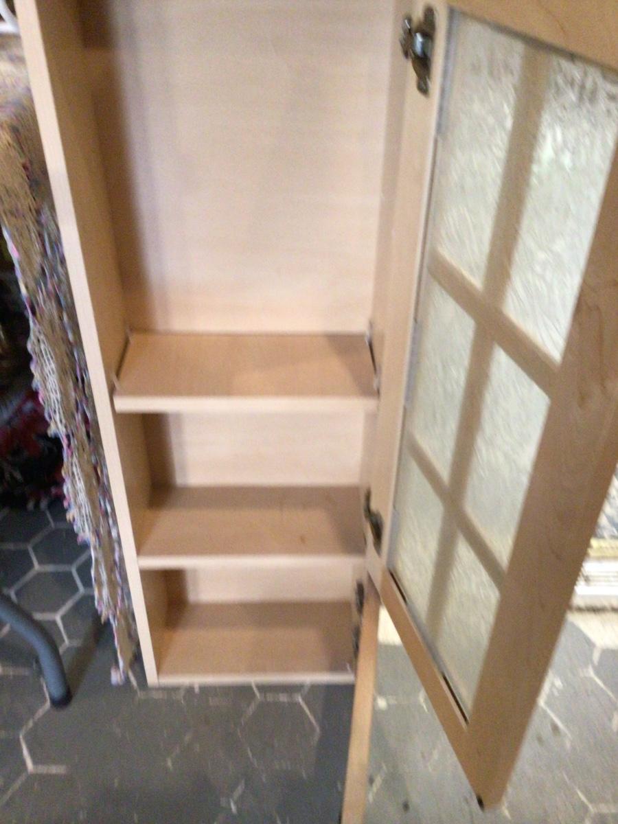 Three shelf with one adjustible. Blonde cabinet with frosted front glass and flower embossed pattern.