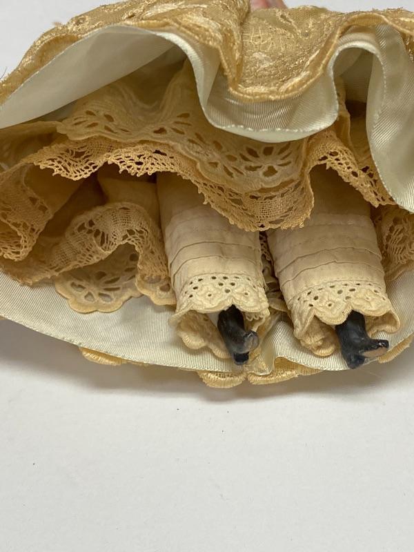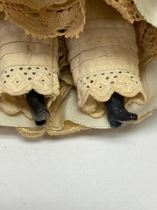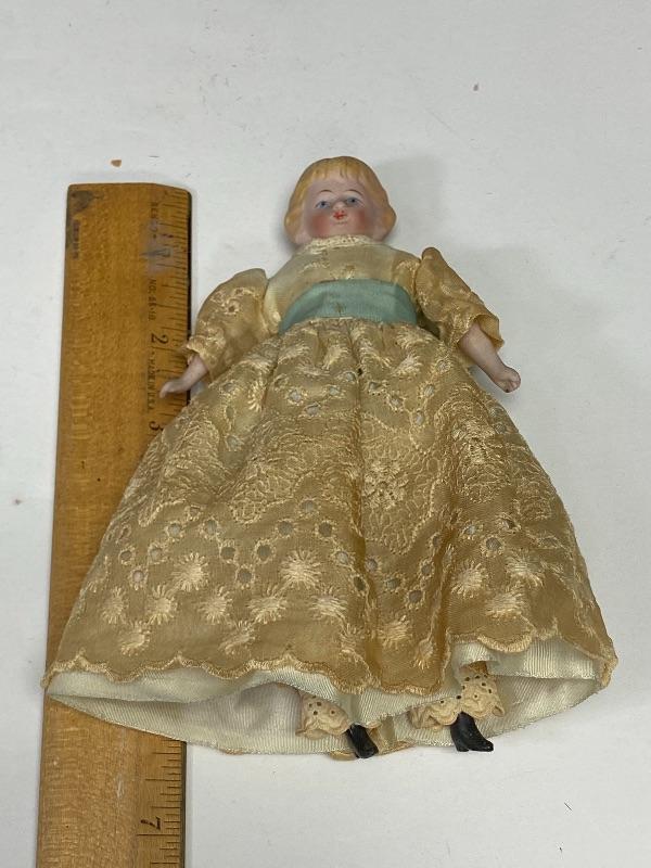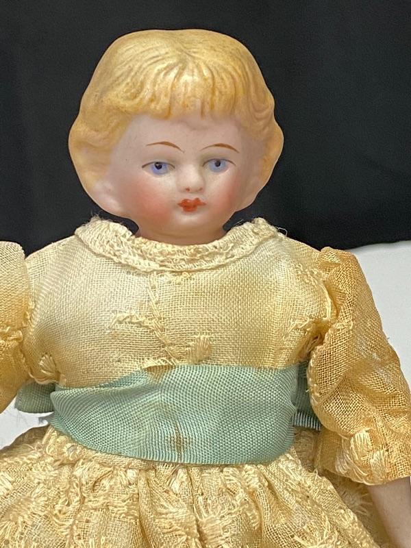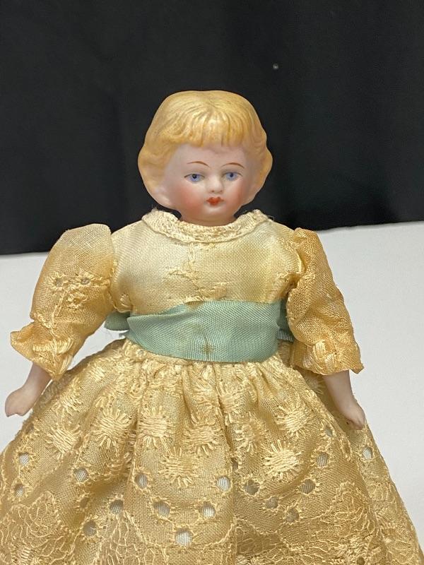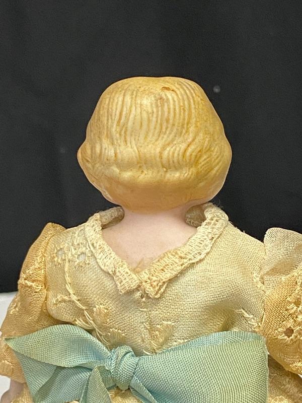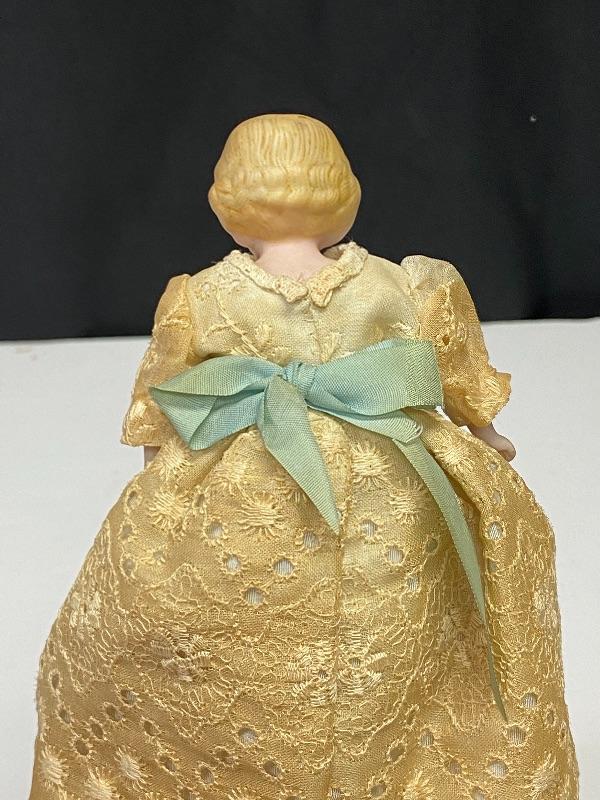 Blonde china head dollhouse doll. 6" size. Multi layer eyelet dress with blue ribbon, discolored, ribbon is brittle. Face is more flesh tone then white like most china head dolls. Good condition other then discolor to clothes.