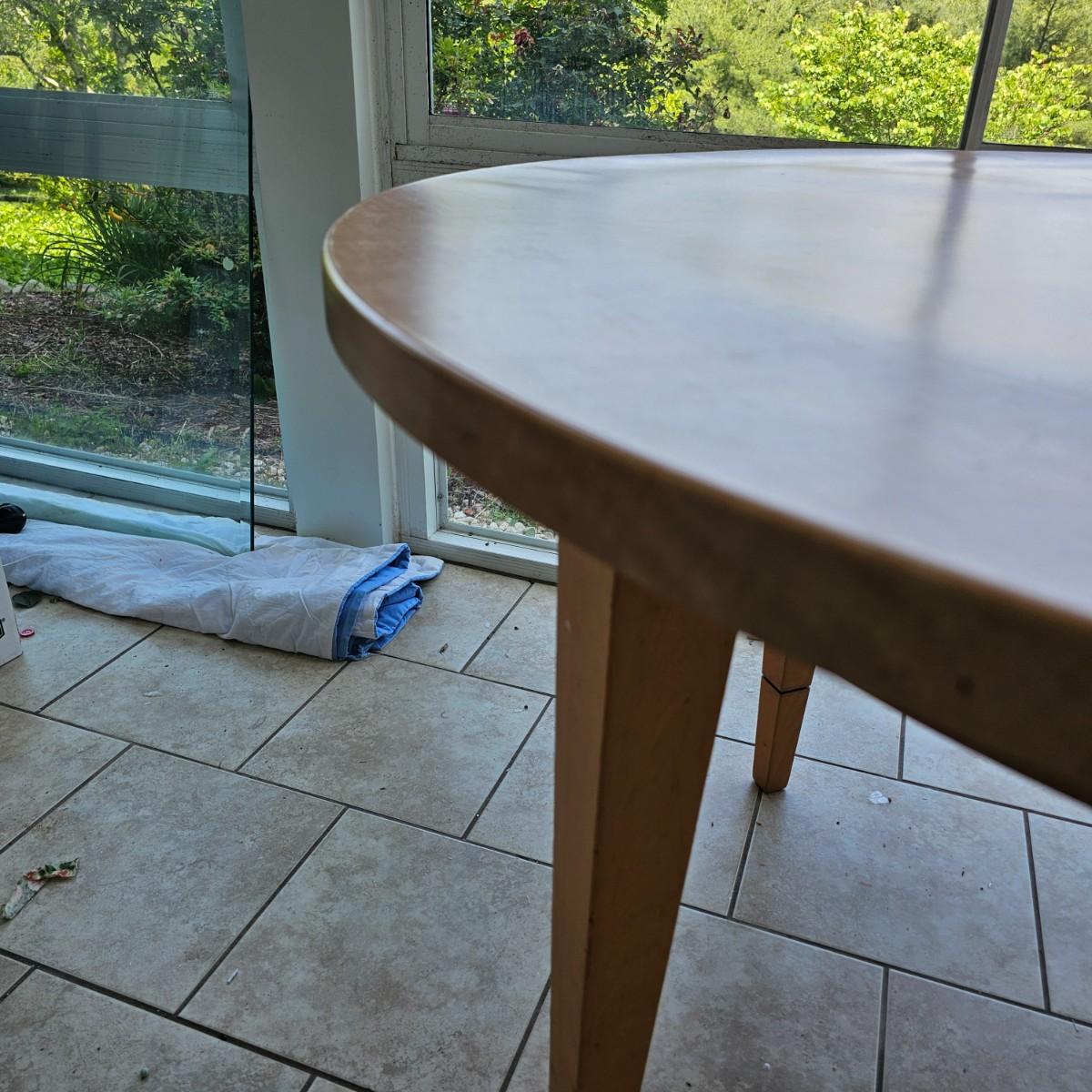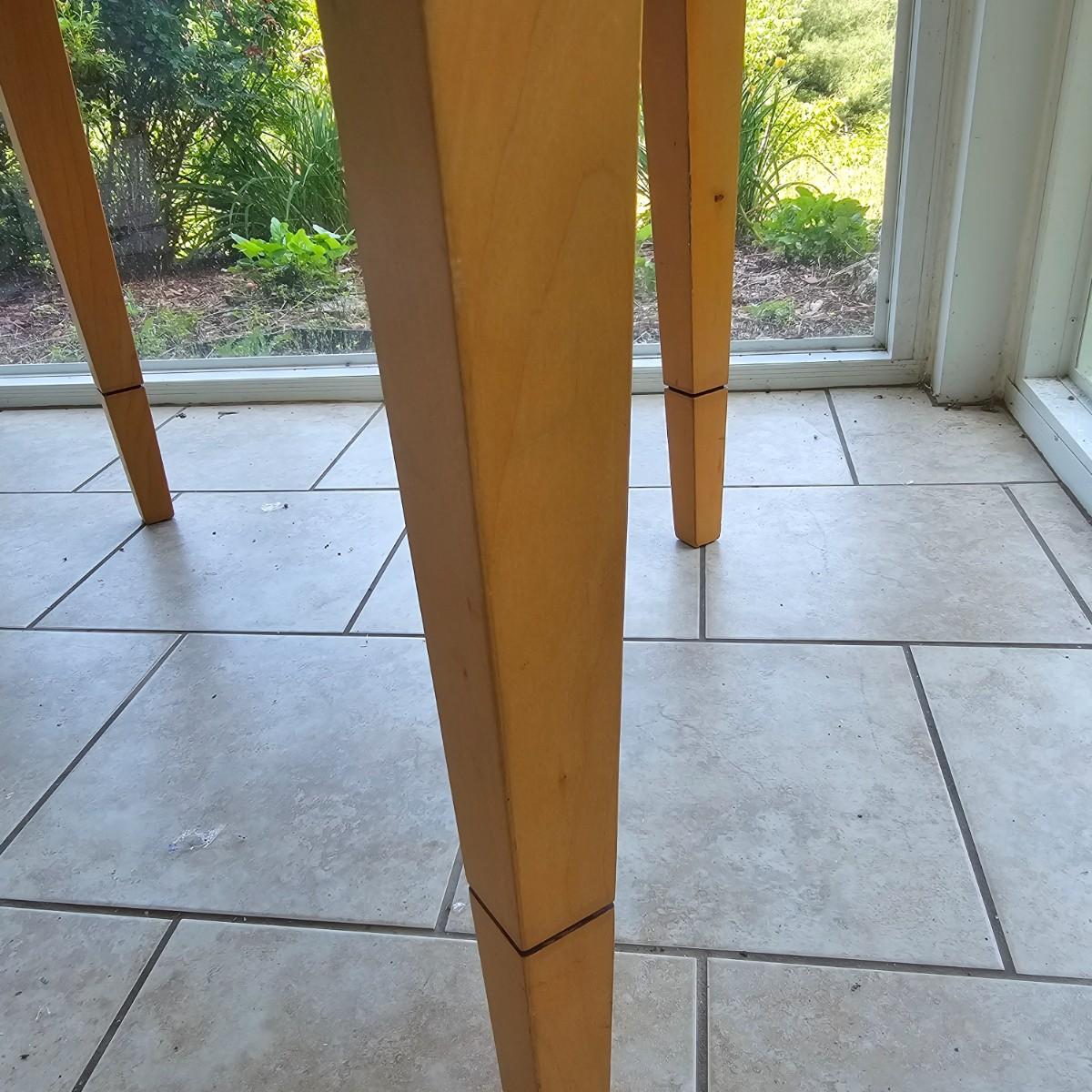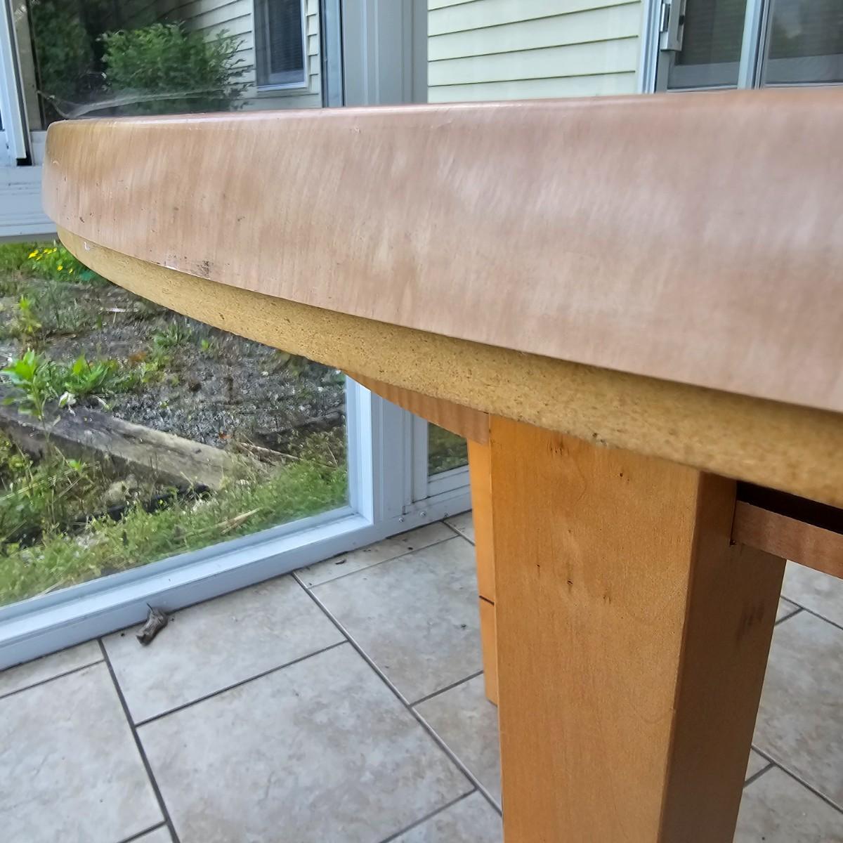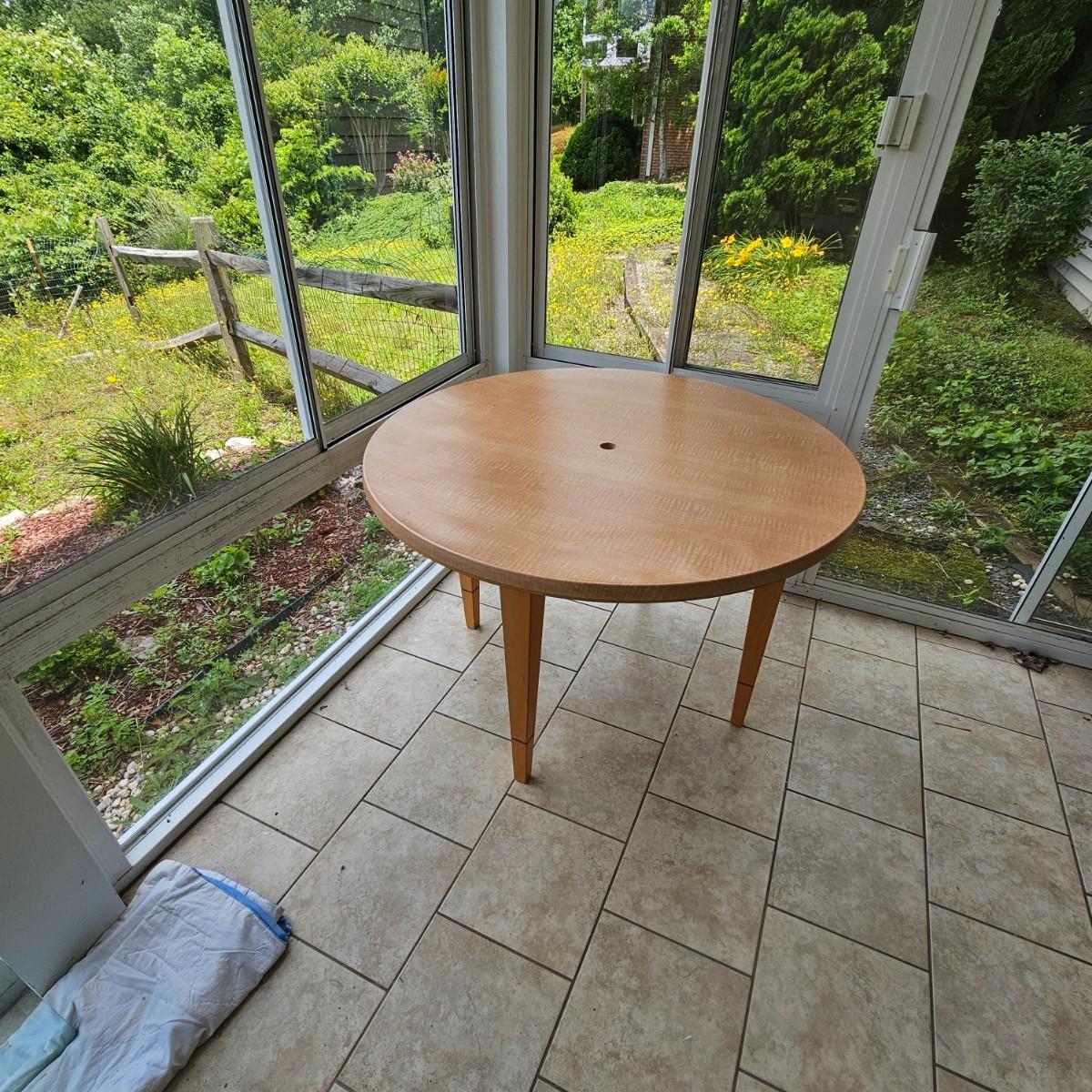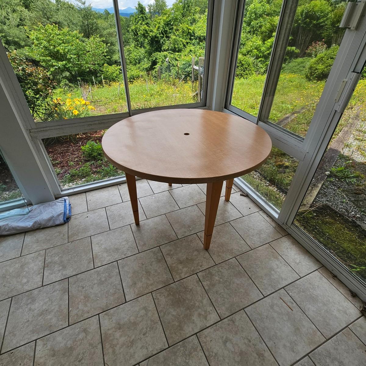 One 44"D patio table with center hole and 42"D plexiglass top. Square tapered legs and decorative edges, this table stands 28"H. There is some delamination on the top center and around the edges. See photos for details. Local pickup only.