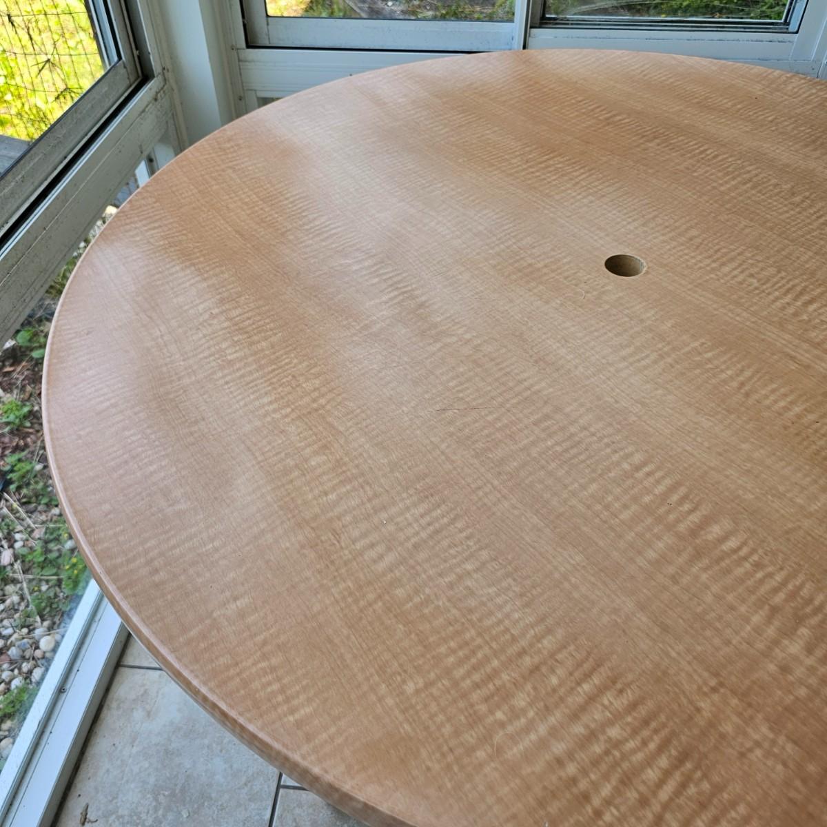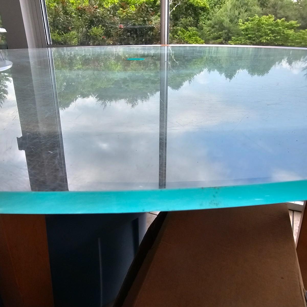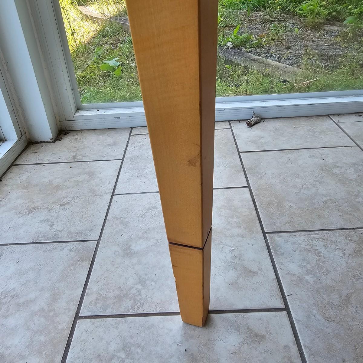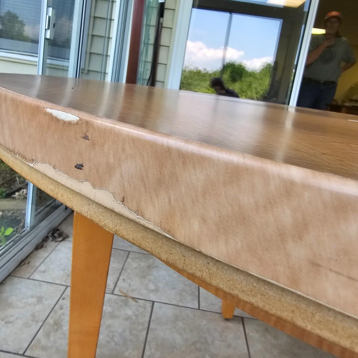 One 44"D patio table with center hole and 42"D plexiglass top. Square tapered legs and decorative edges, this table stands 28"H. There is some delamination on the top center and around the edges. See photos for details. Local pickup only.
