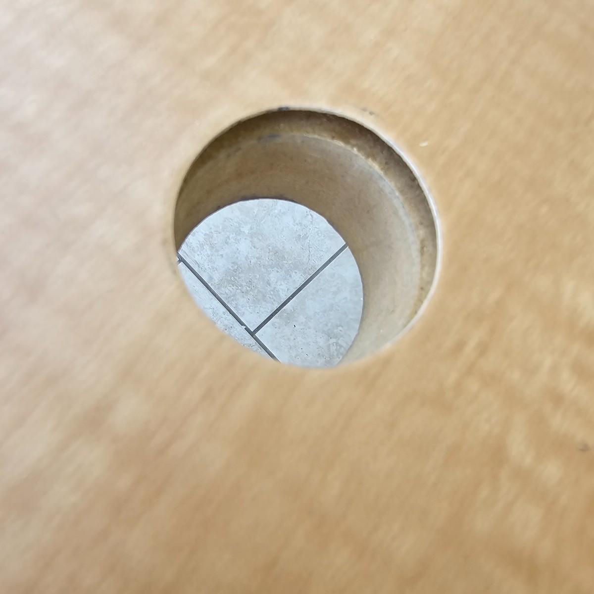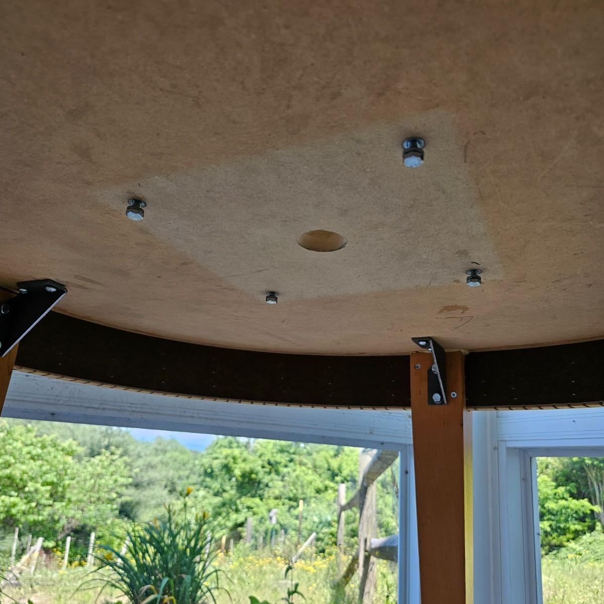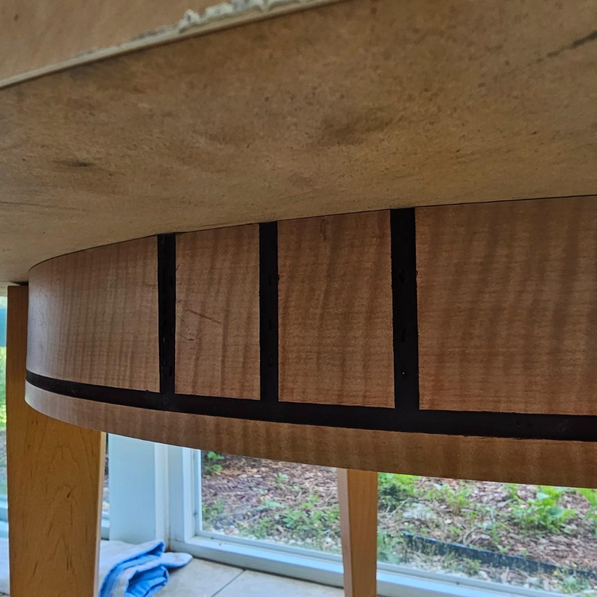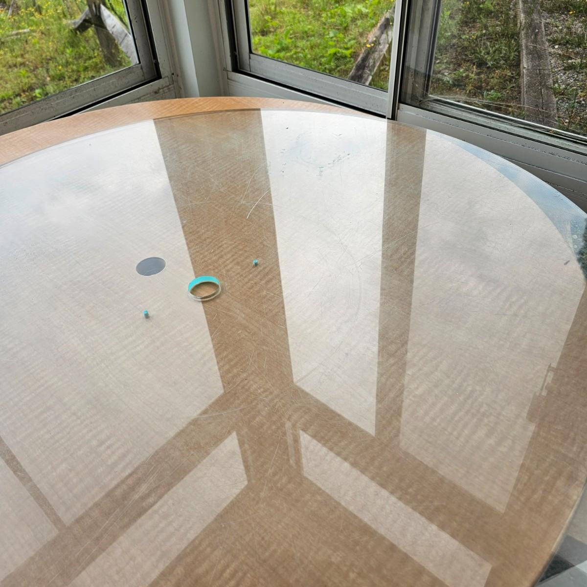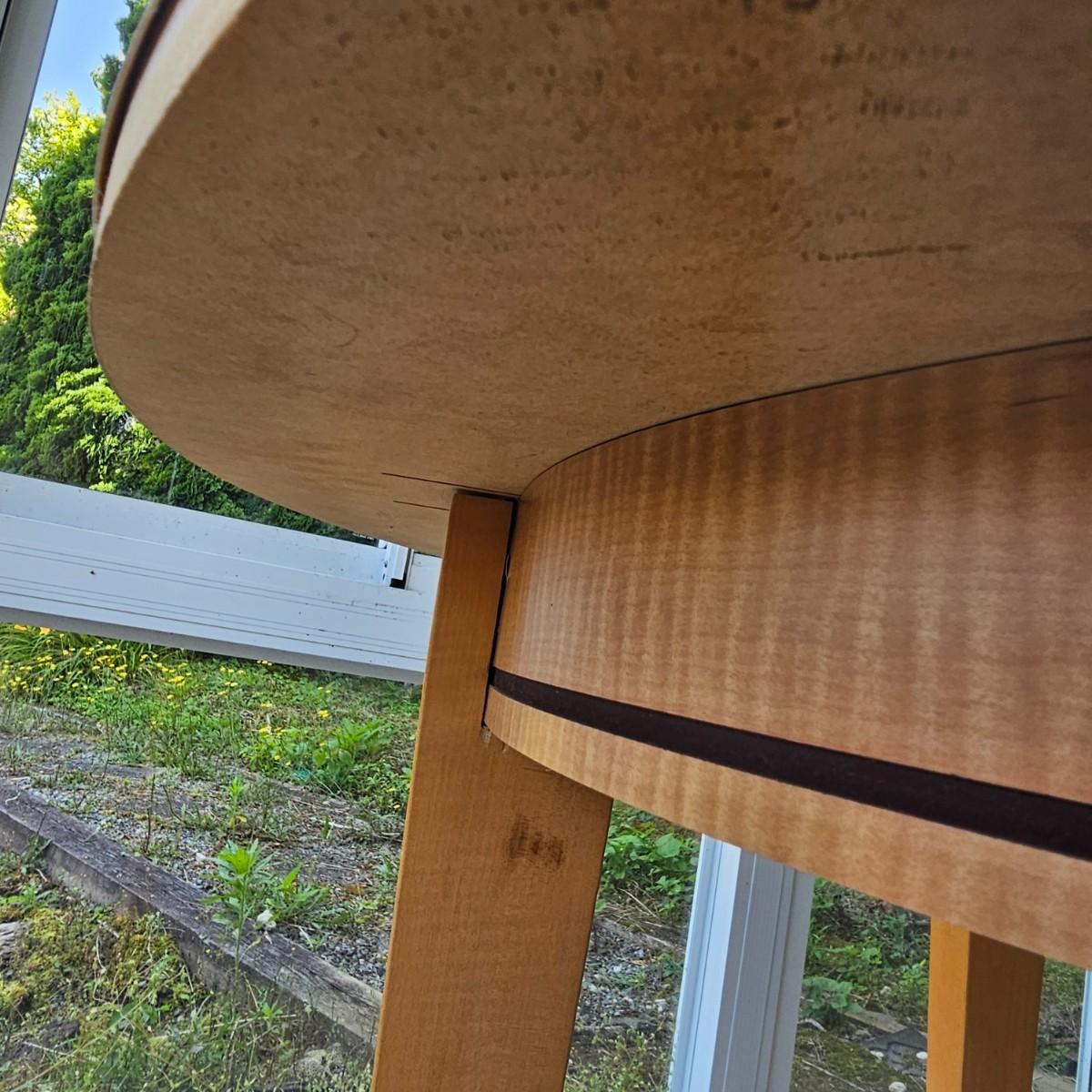 One 44"D patio table with center hole and 42"D plexiglass top. Square tapered legs and decorative edges, this table stands 28"H. There is some delamination on the top center and around the edges. See photos for details. Local pickup only.