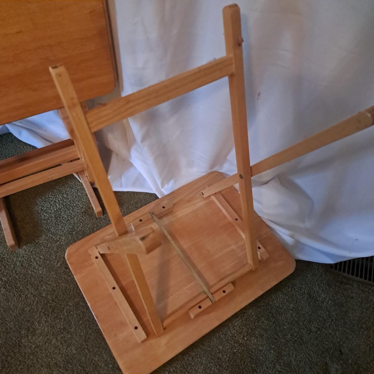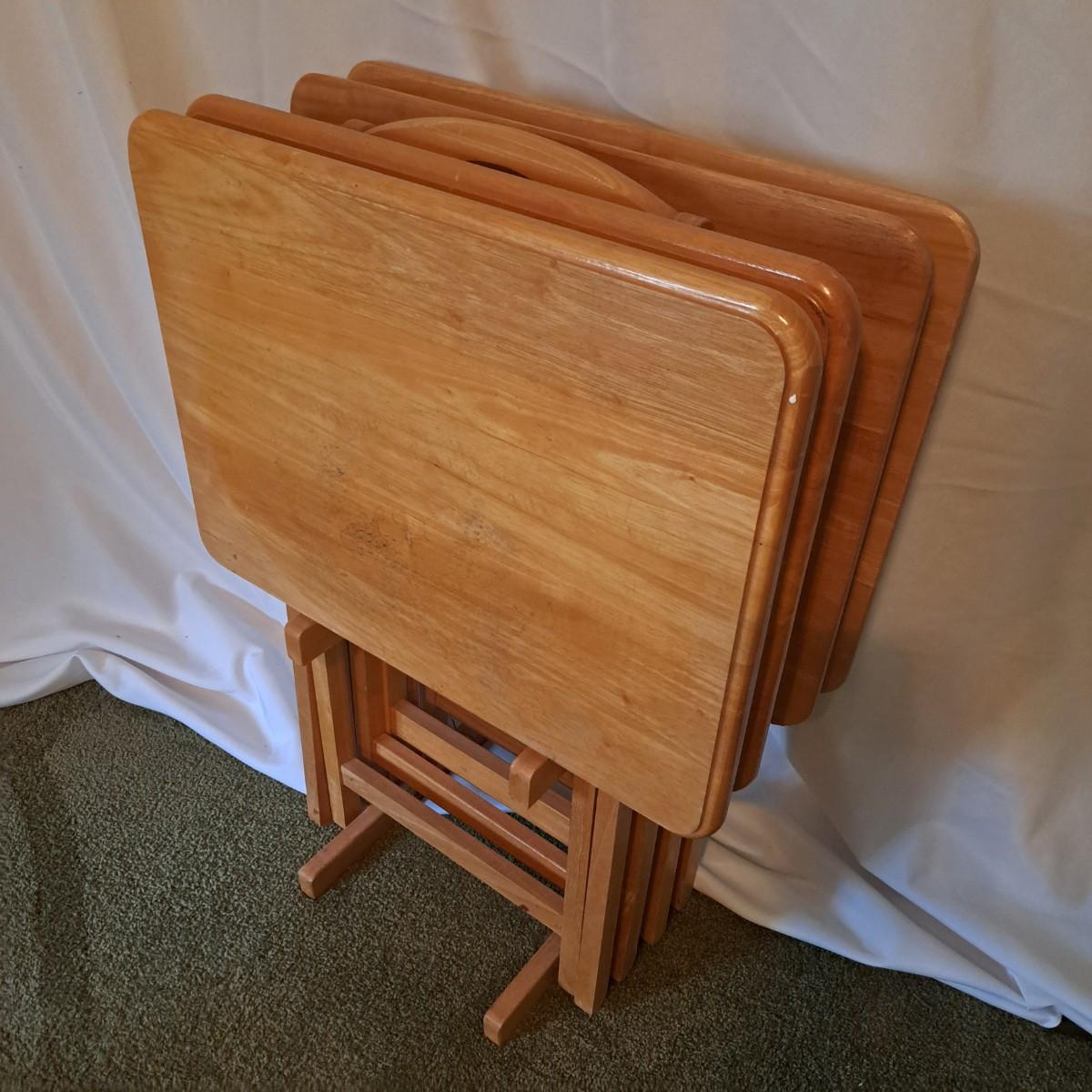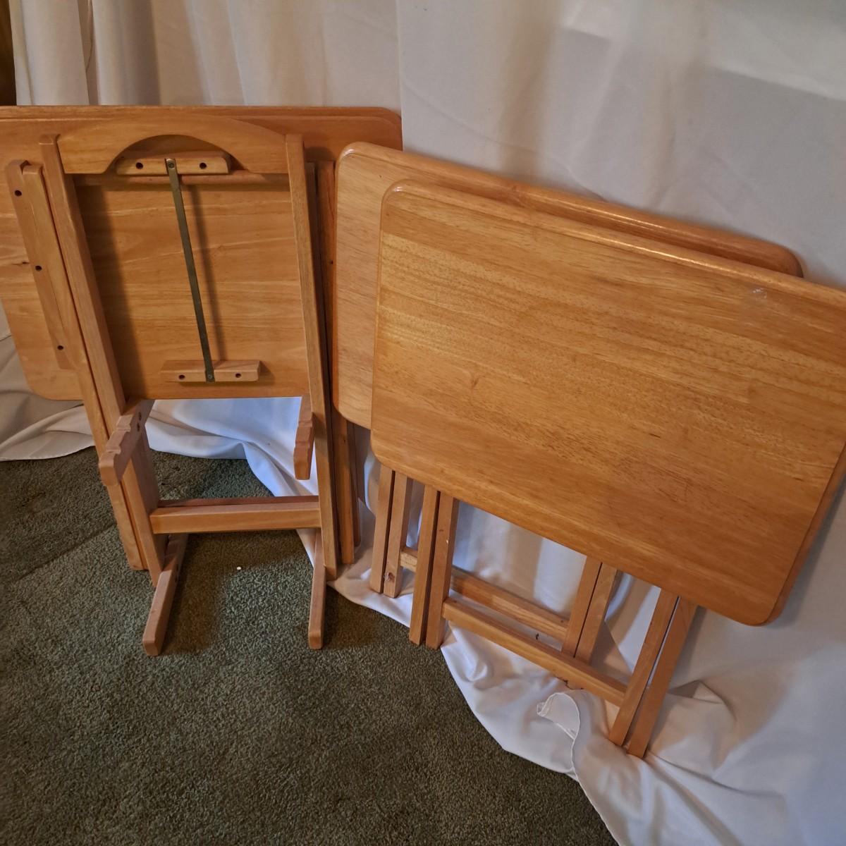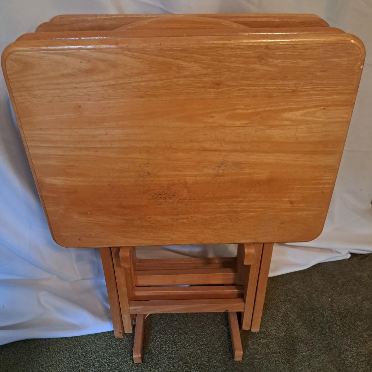Four sturdy wooden blonde TV trays with stand. Stamp on bottom reads "Thailand." Very nice set; a few with very faint black surface blemishes as shown. Each tray measures 22” x 16” x 26”H. Local pickup only.