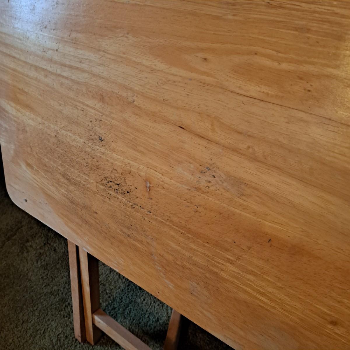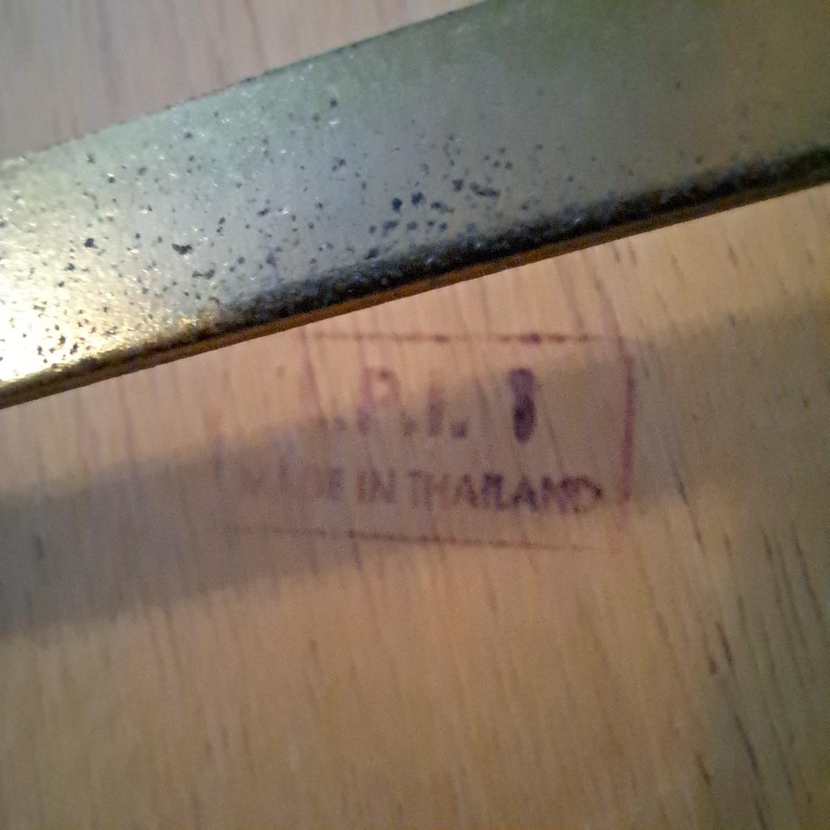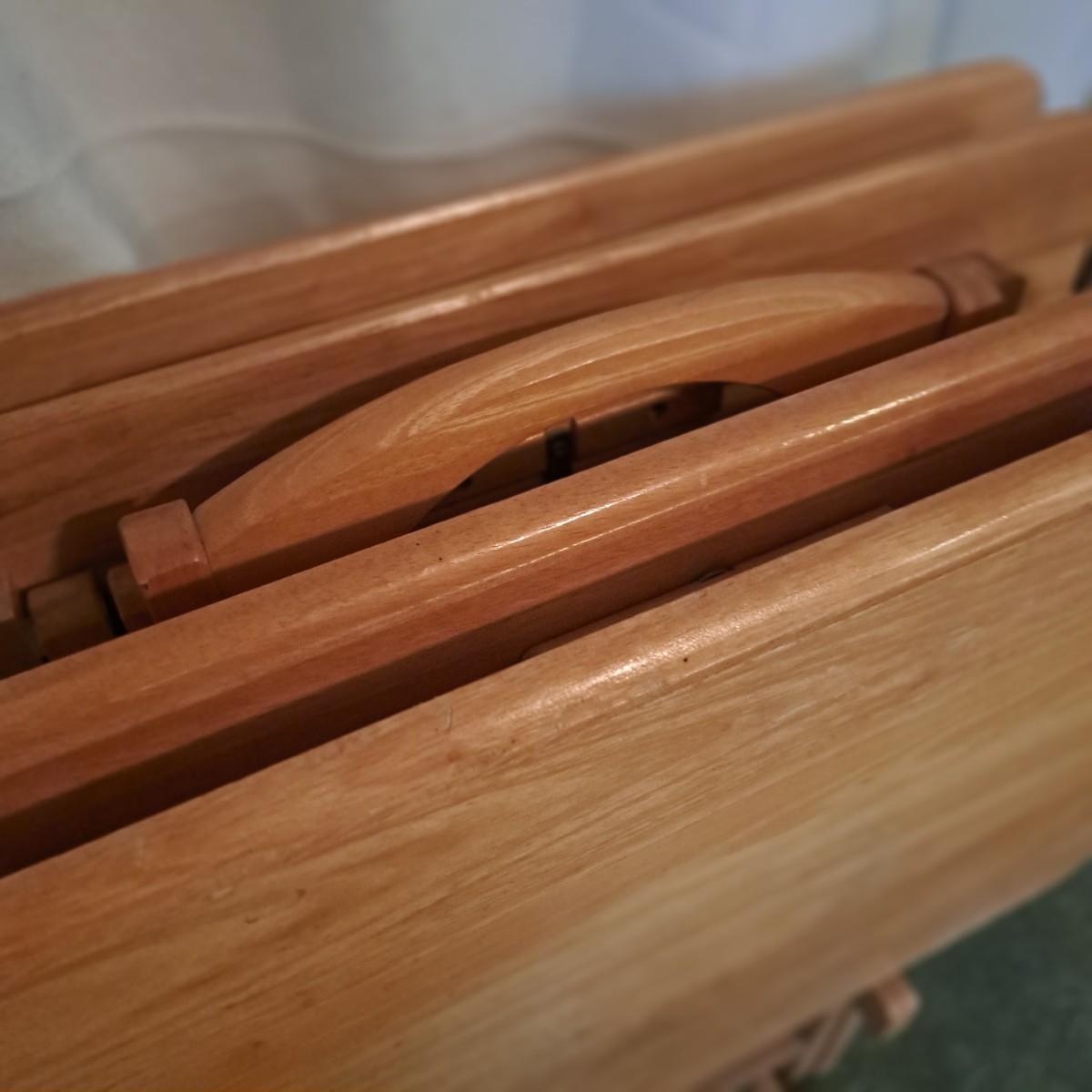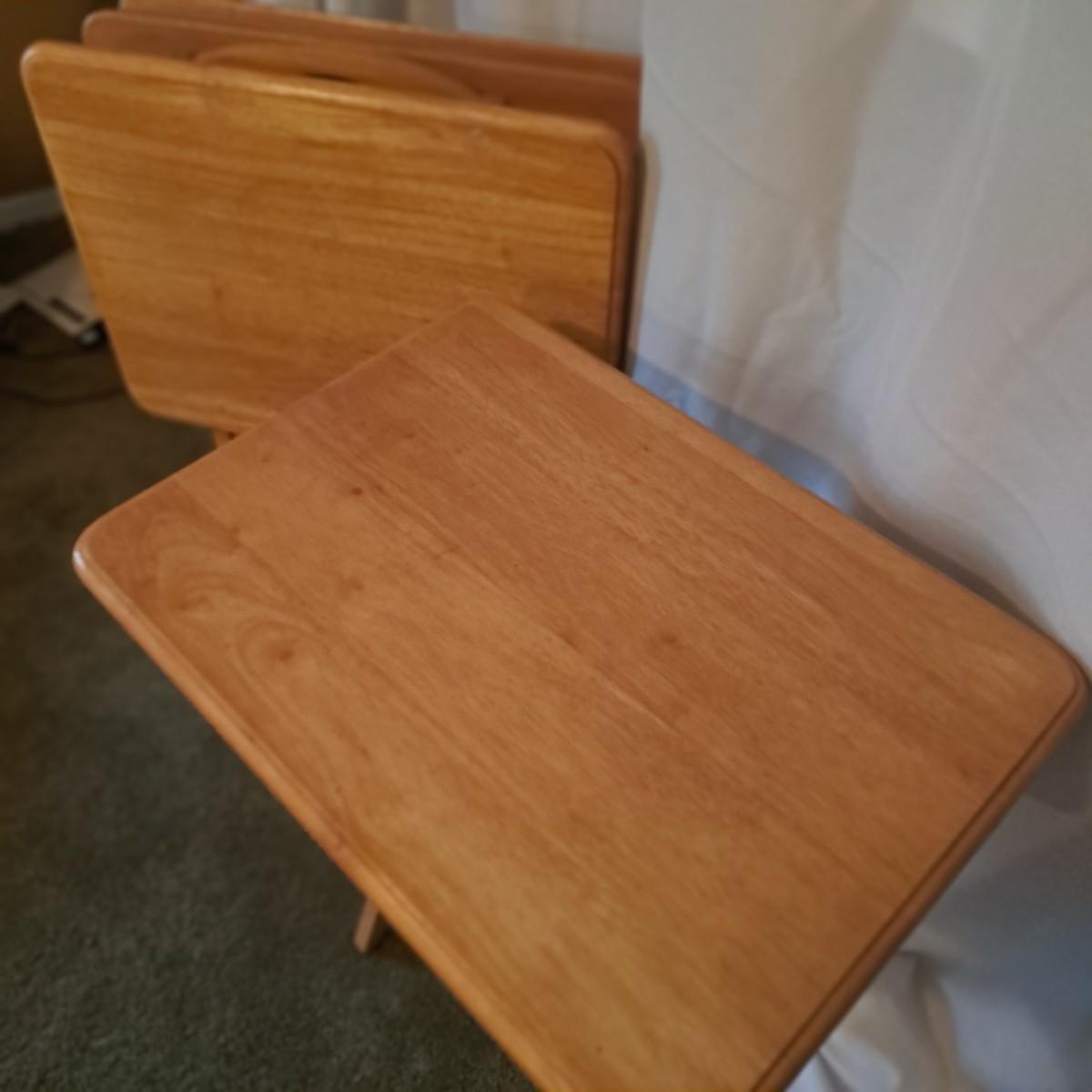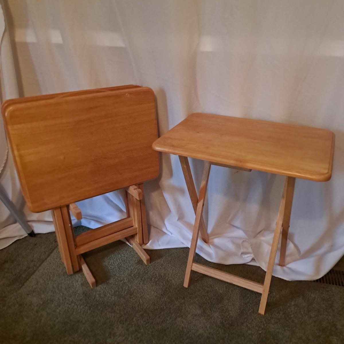 Four sturdy wooden blonde TV trays with stand. Stamp on bottom reads "Thailand." Very nice set; a few with very faint black surface blemishes as shown. Each tray measures 22” x 16” x 26”H. Local pickup only.