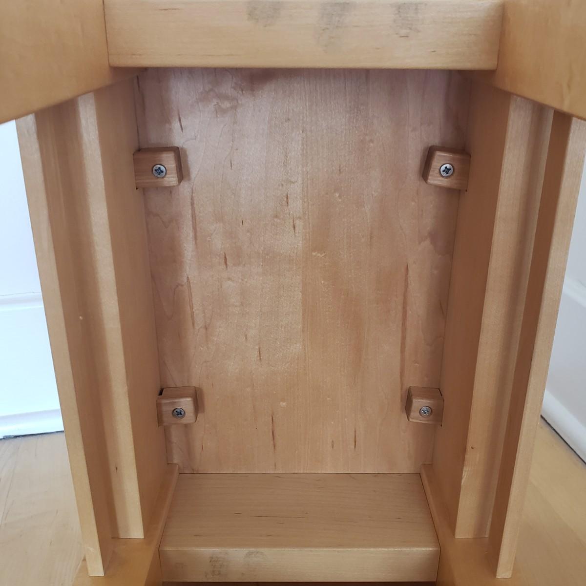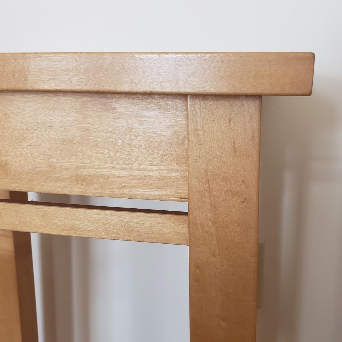 This blonde wooden display table has a sleek, elegant design. The table measures 17" x 13" x 31"H. The top has what appears to be a sun-bleached oval on the top, see picture.