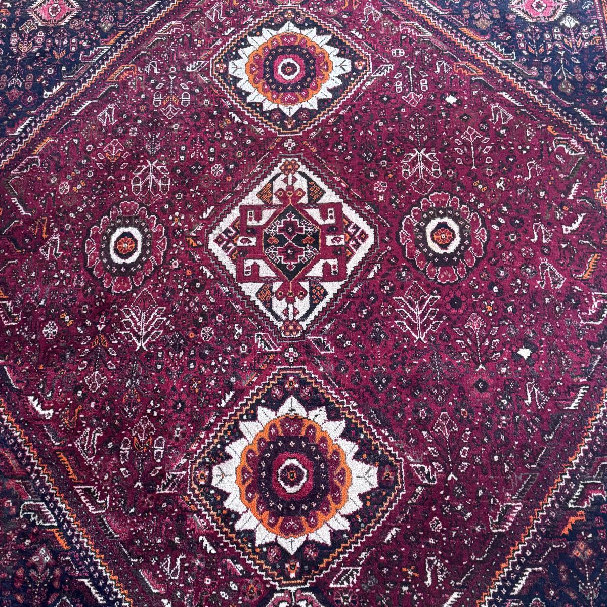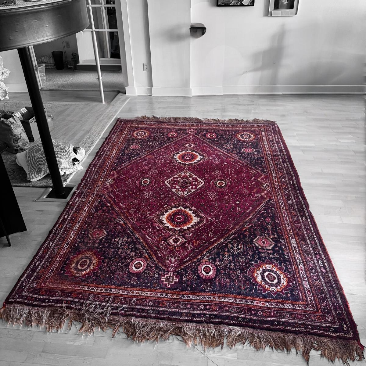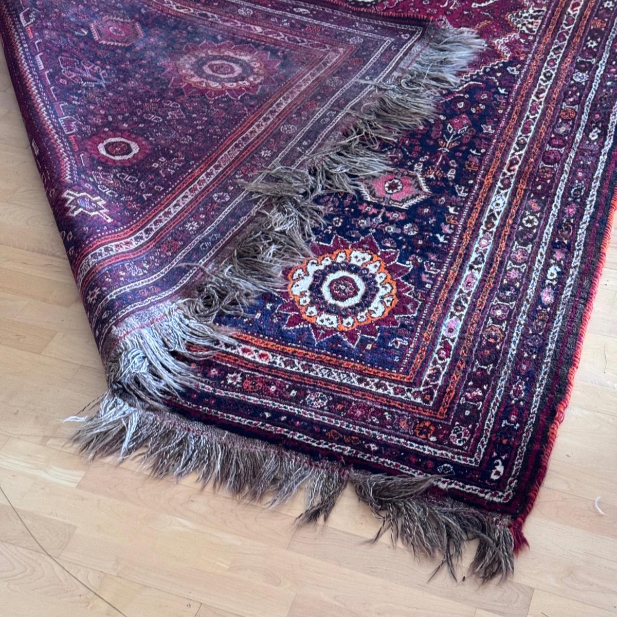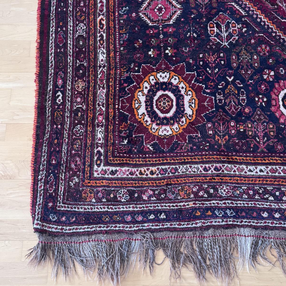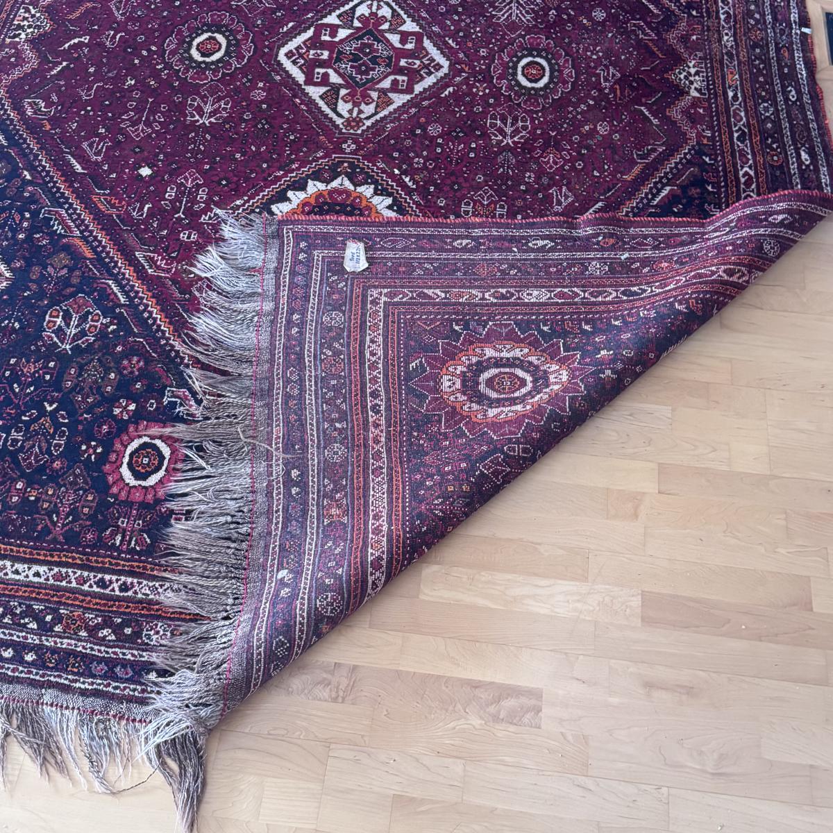 This lot includes one vibrant Shiraz-style rug. You’ll find shades of blood orange, maroon, and several other hues of orange. The rug measures 7’4” x 11’ 2”H. It has super long fringe at the end. Local pickup only.