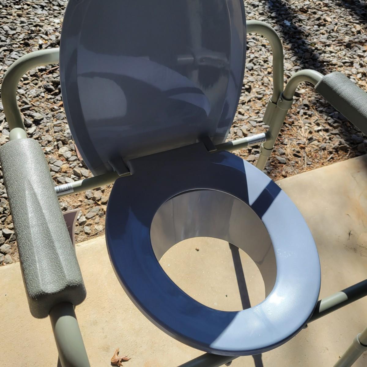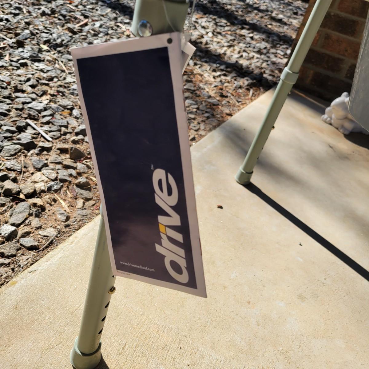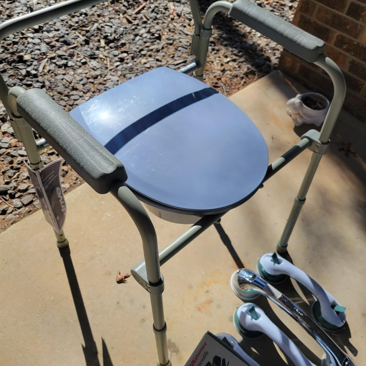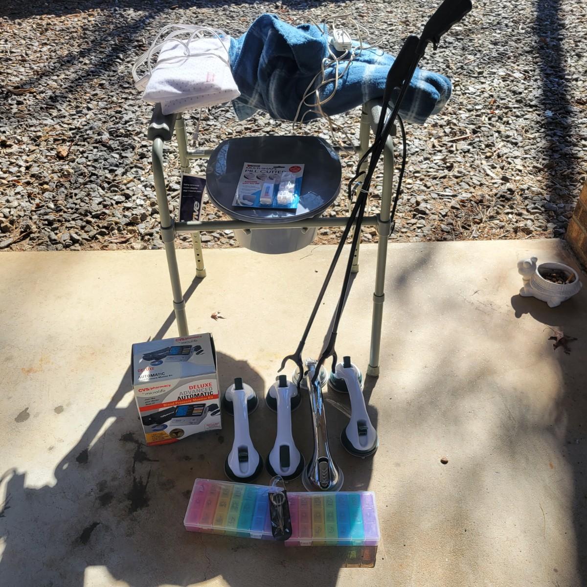 An assortment of medical and ambulatory equipment that includes a Drive portable toilet, a CVS blood pressure monitor, a heated blanket and heating pad, pill cases, suction safety bars and more. Blanket and pad were plugged in and powered on. Drive portable toilet measures approximately 21" x 18" x 27.5"H and has adjustable legs. It appears to be unused with its tag still attached. Local pickup only