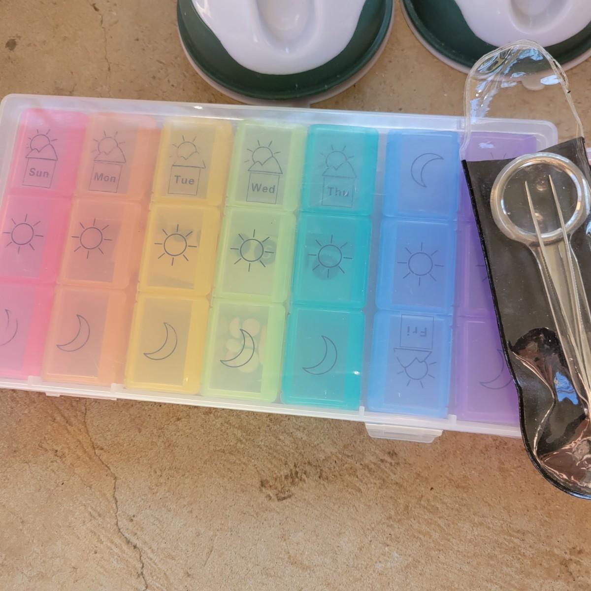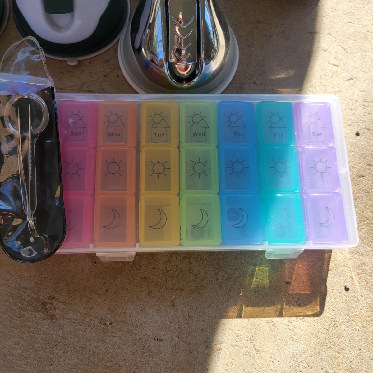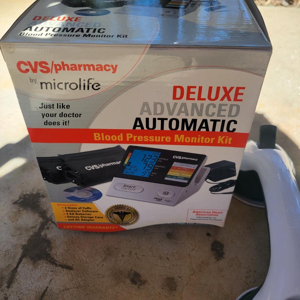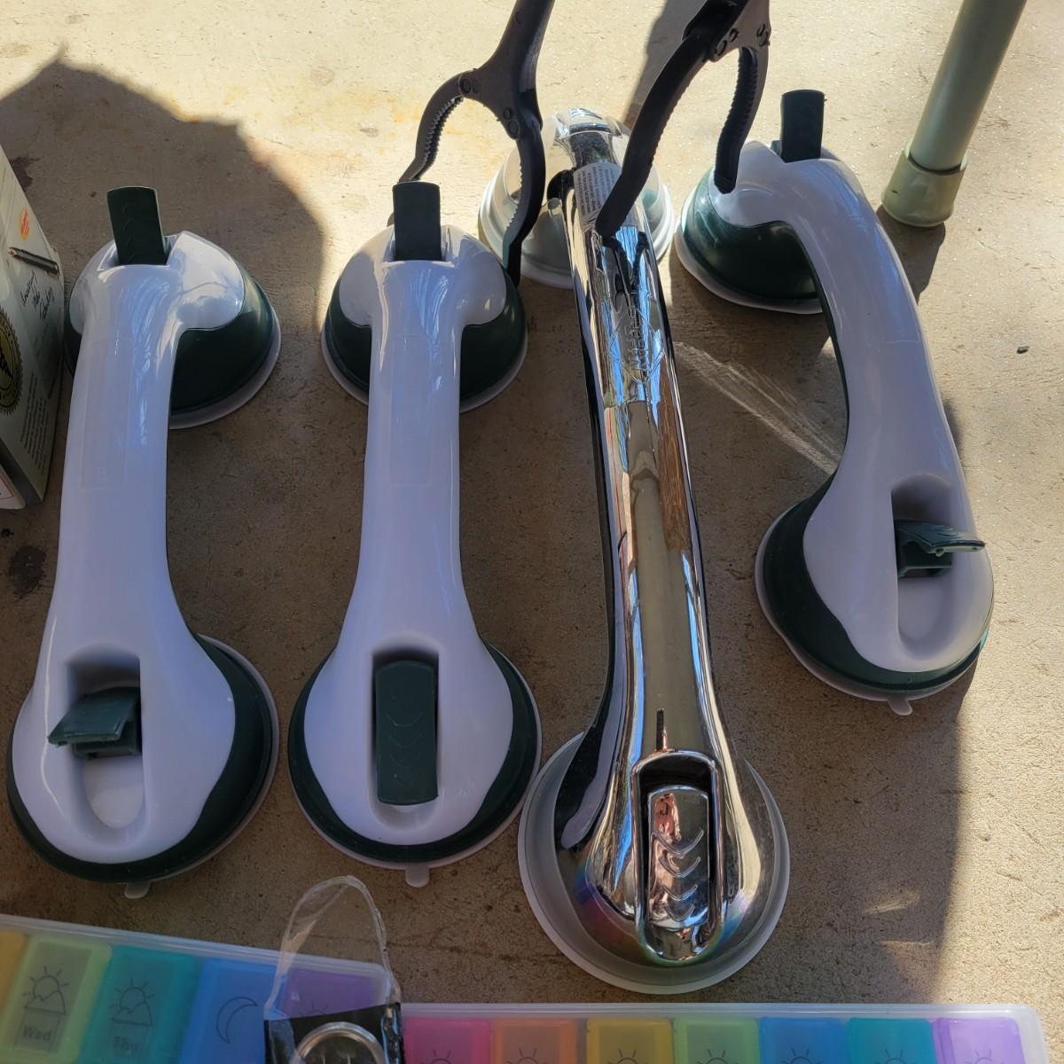 An assortment of medical and ambulatory equipment that includes a Drive portable toilet, a CVS blood pressure monitor, a heated blanket and heating pad, pill cases, suction safety bars and more. Blanket and pad were plugged in and powered on. Drive portable toilet measures approximately 21" x 18" x 27.5"H and has adjustable legs. It appears to be unused with its tag still attached. Local pickup only