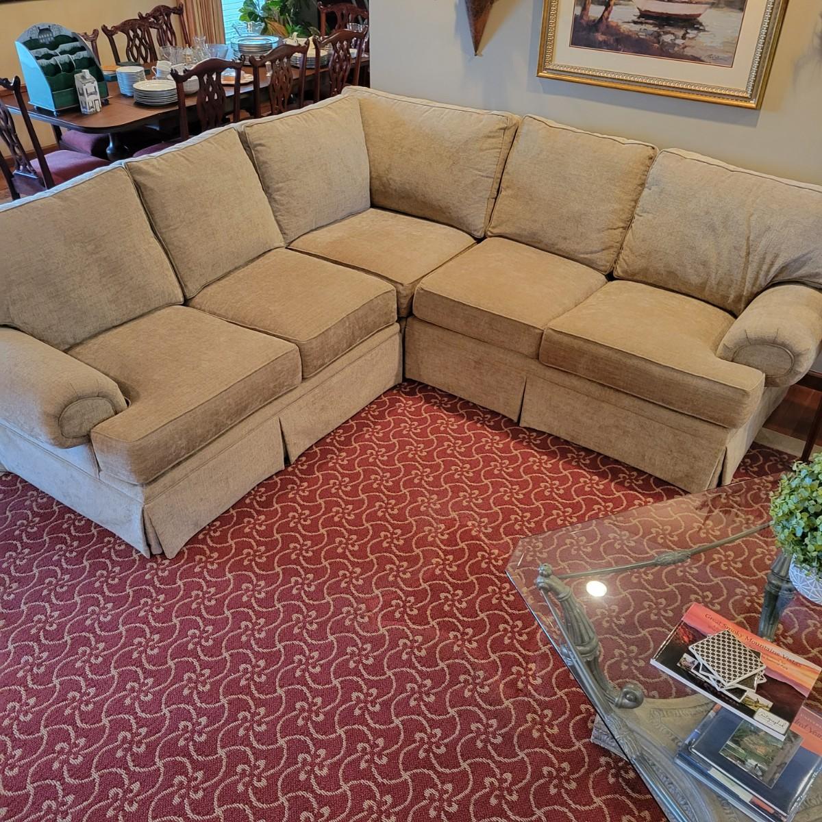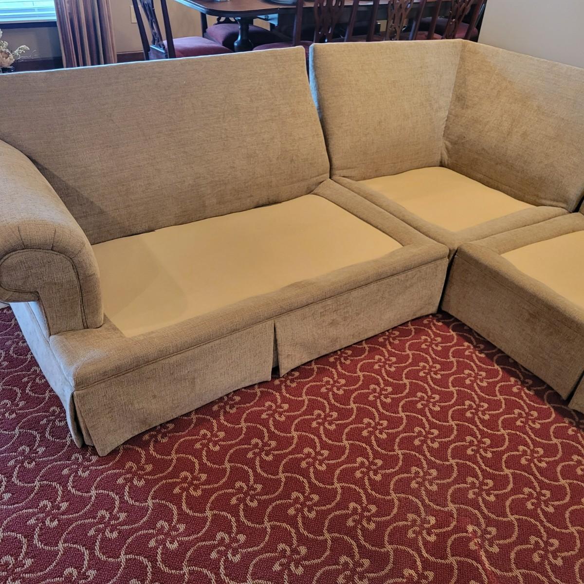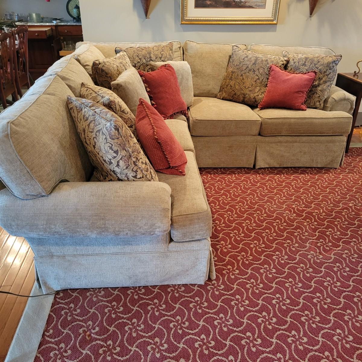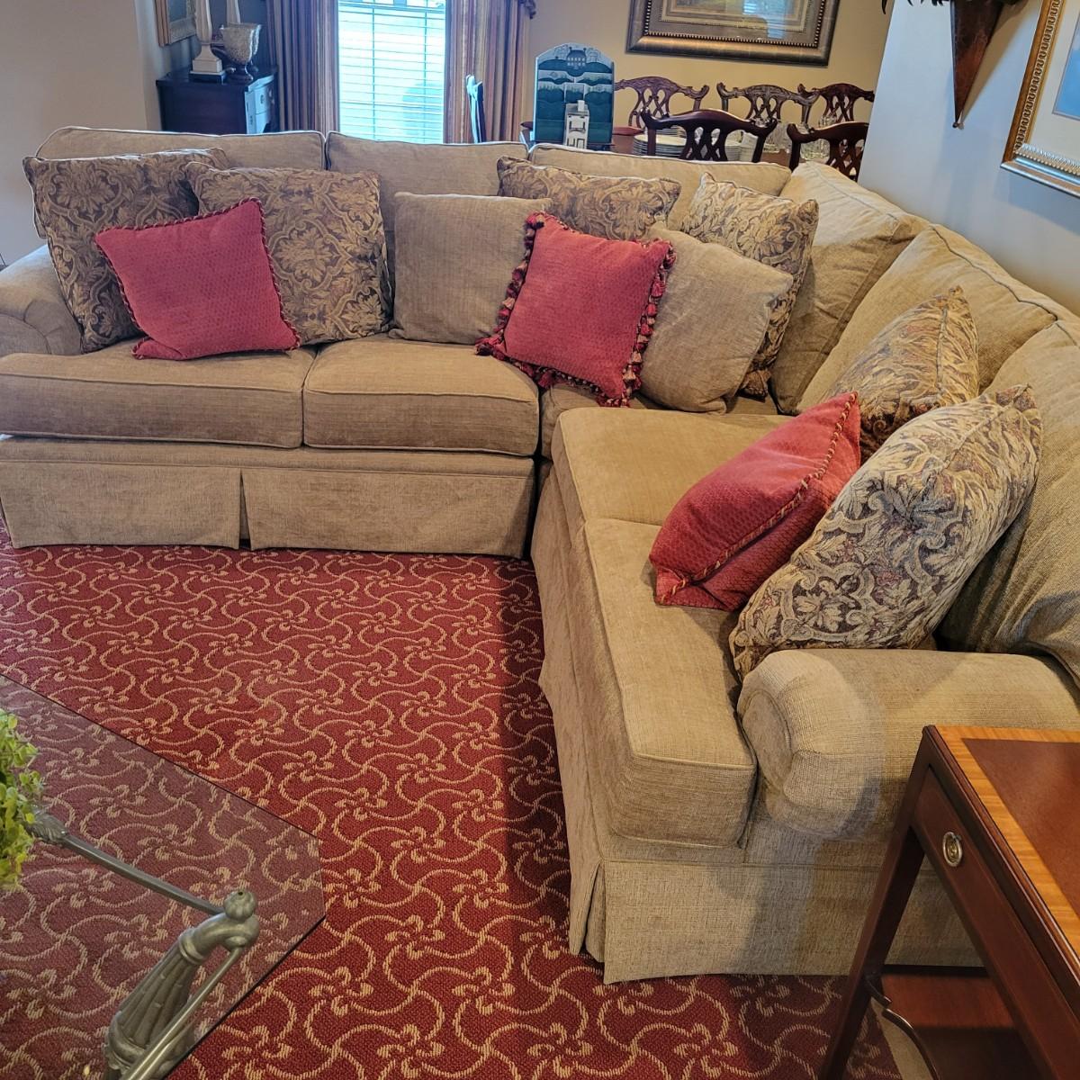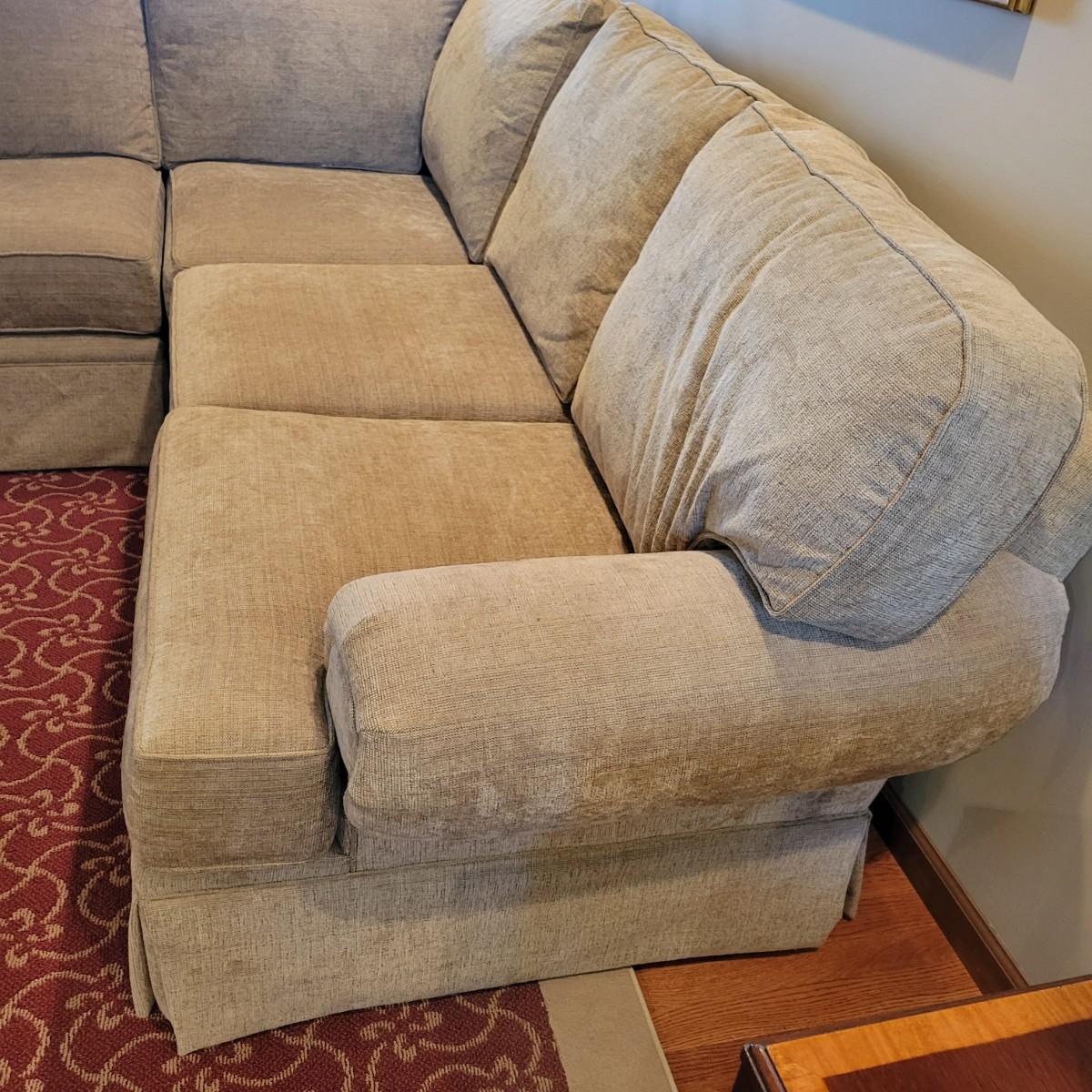 A Bloomfield three piece, sectional sofa in a putty grey fabric that also includes eleven accent pillows. This sectional does not appear to have any stains or odors and is exceptionally clean. This couch separates into three pieces for easy transportation. The end pieces measure approximately 60" x 40" x 38" and the center piece measures 40" x 40" x 38"H. The 11 accent pillows have three different designs. Local pickup only. Winning bidder must bring assistance to help move and load this item due to its weight and/or size.