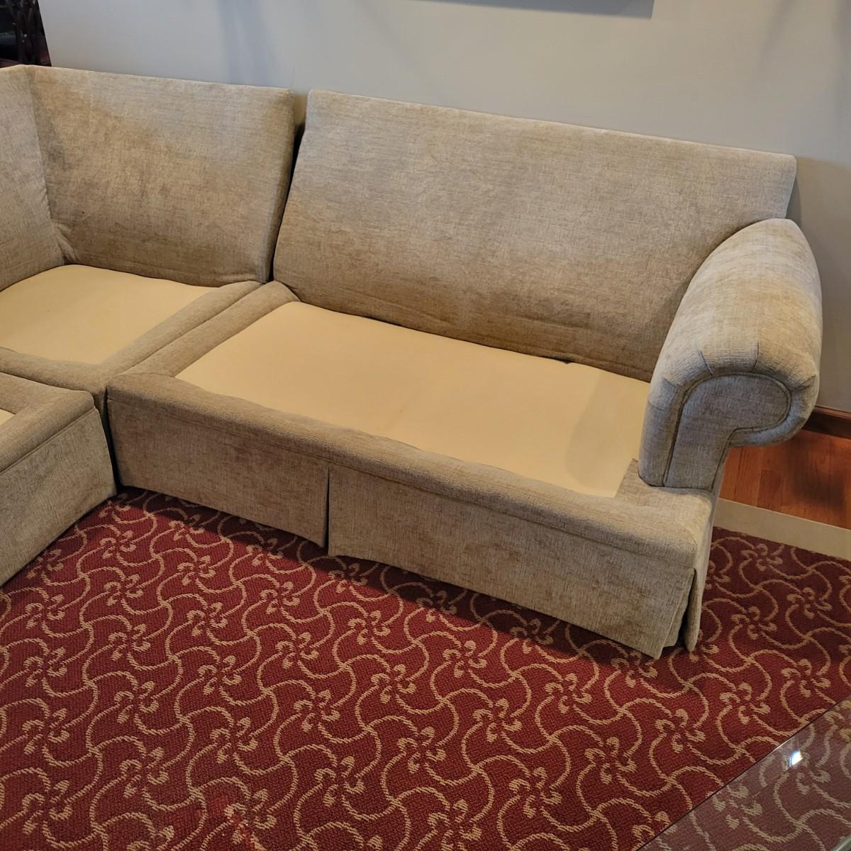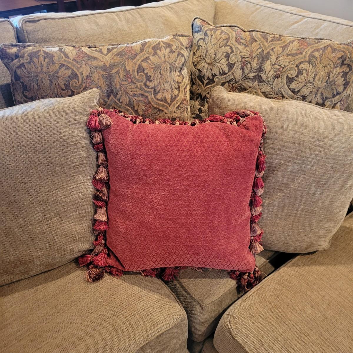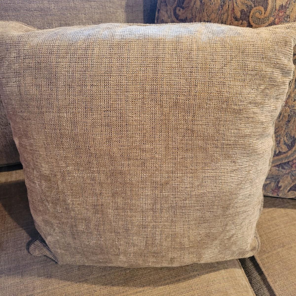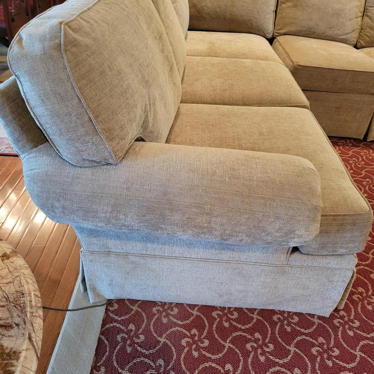 A Bloomfield three piece, sectional sofa in a putty grey fabric that also includes eleven accent pillows. This sectional does not appear to have any stains or odors and is exceptionally clean. This couch separates into three pieces for easy transportation. The end pieces measure approximately 60" x 40" x 38" and the center piece measures 40" x 40" x 38"H. The 11 accent pillows have three different designs. Local pickup only. Winning bidder must bring assistance to help move and load this item due to its weight and/or size.
