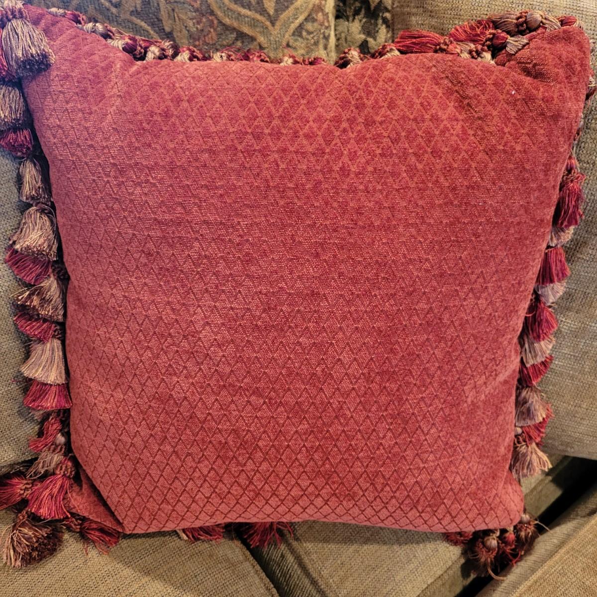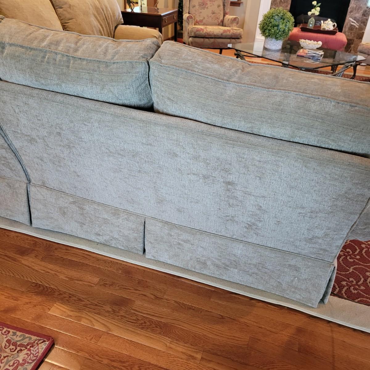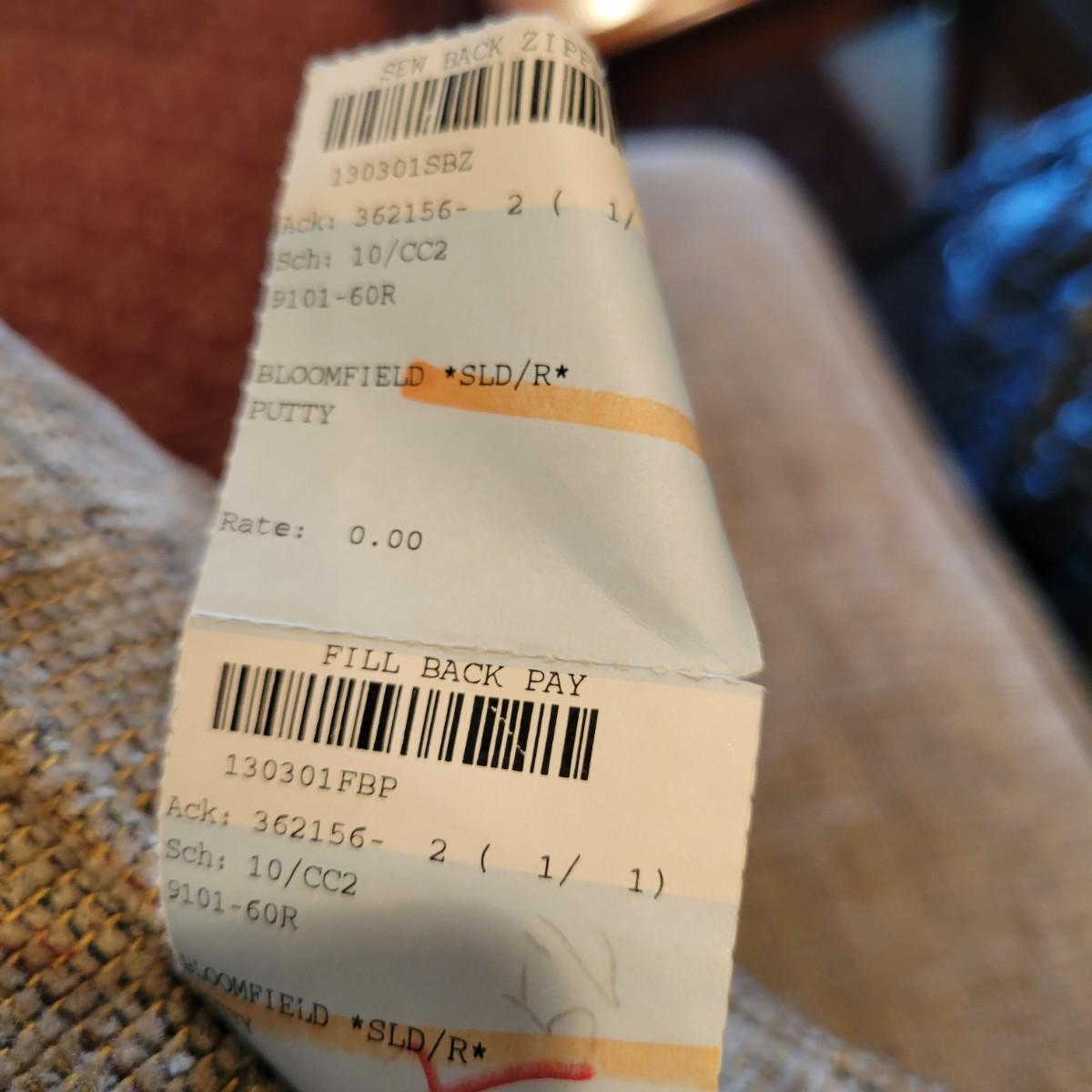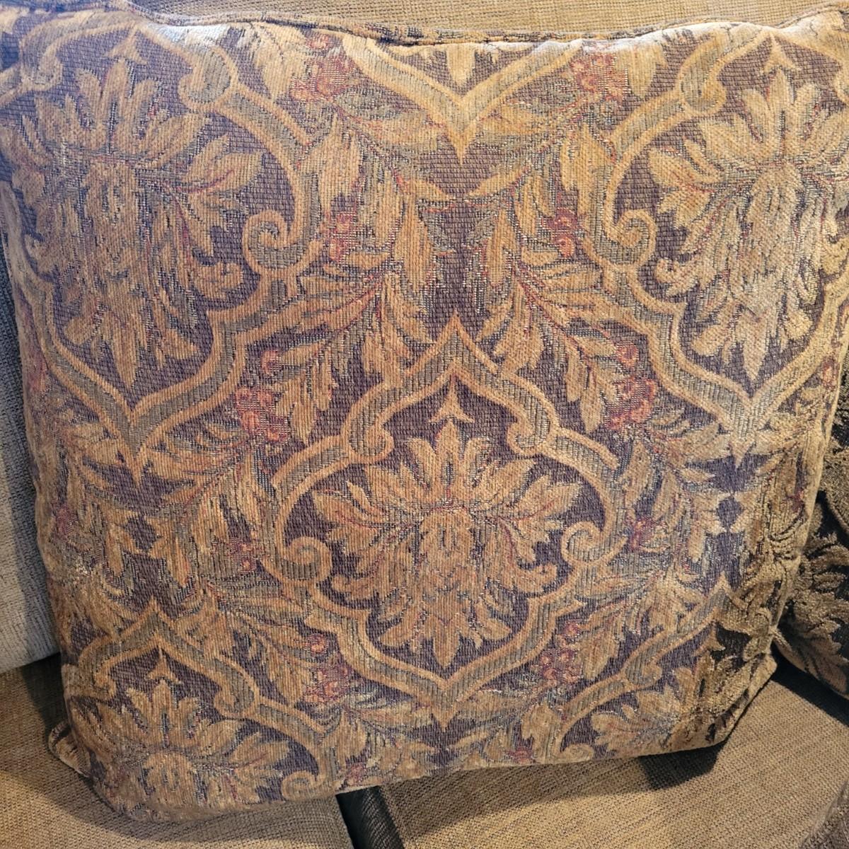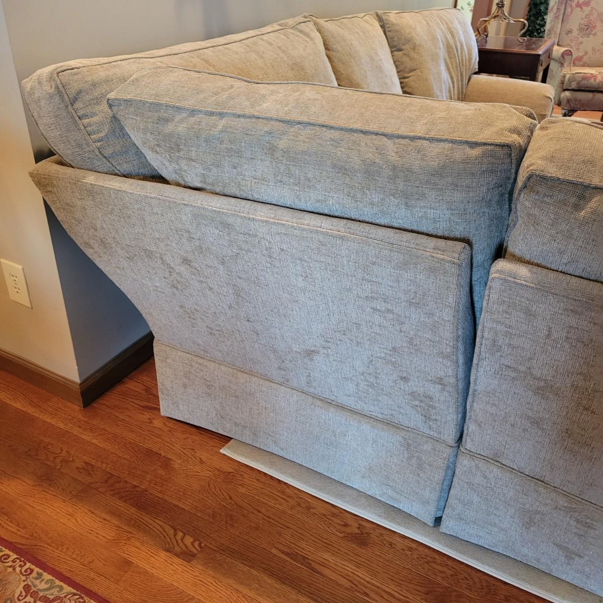 A Bloomfield three piece, sectional sofa in a putty grey fabric that also includes eleven accent pillows. This sectional does not appear to have any stains or odors and is exceptionally clean. This couch separates into three pieces for easy transportation. The end pieces measure approximately 60" x 40" x 38" and the center piece measures 40" x 40" x 38"H. The 11 accent pillows have three different designs. Local pickup only. Winning bidder must bring assistance to help move and load this item due to its weight and/or size.