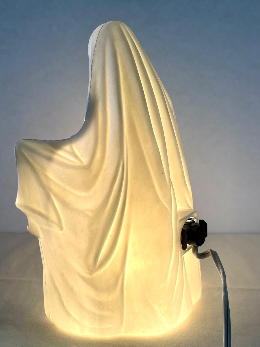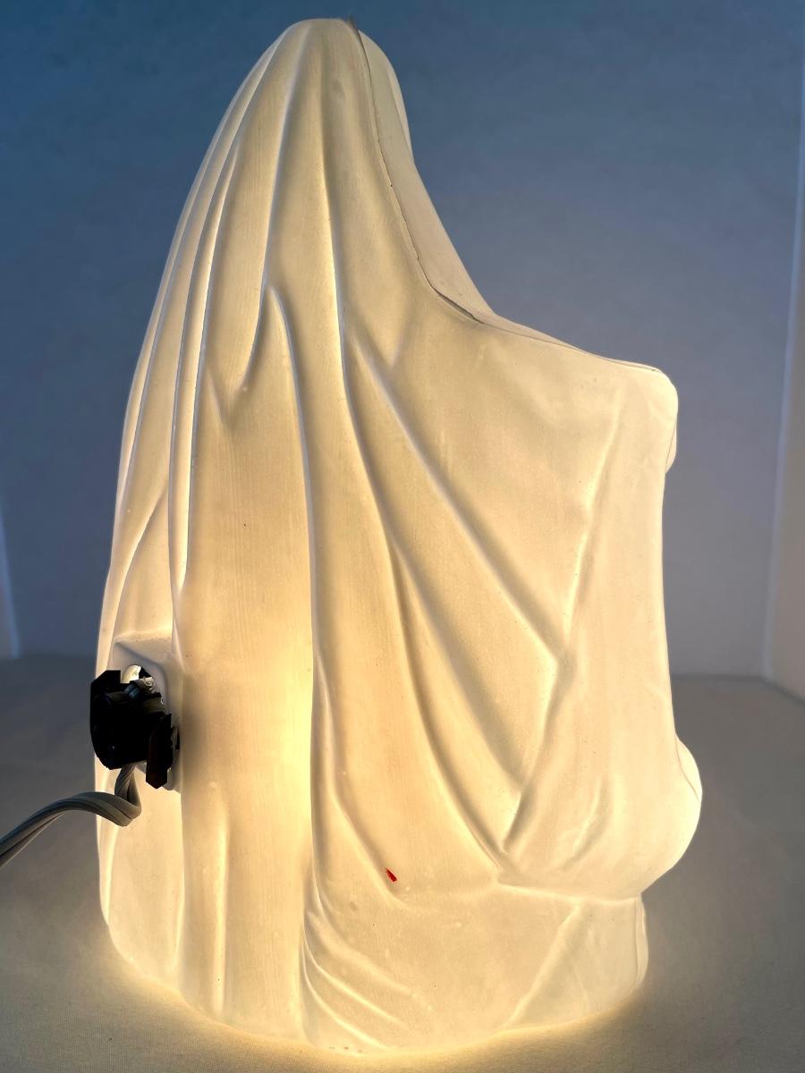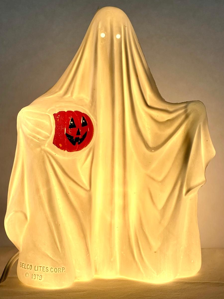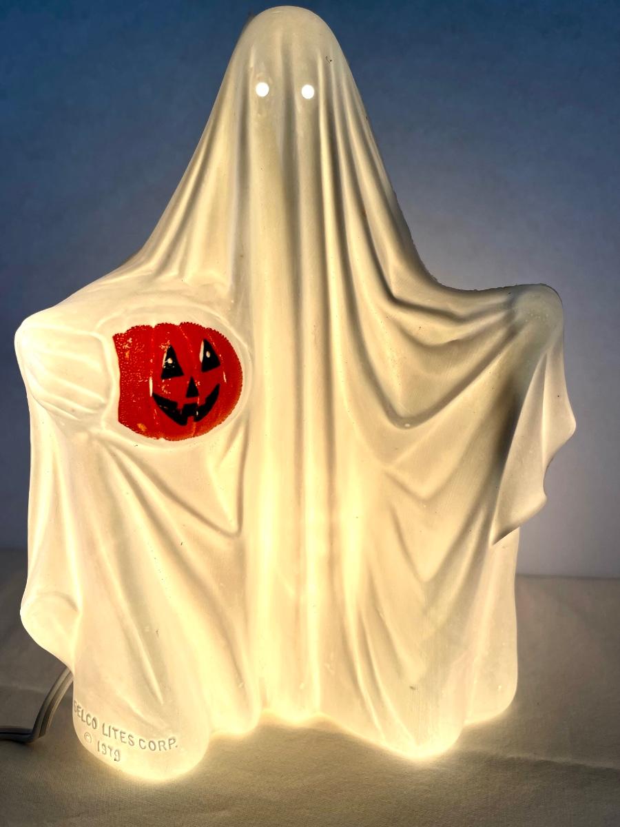 Vintage tabletop ghost blow mold would make cute decor for the fall months. Comes with the bulb and cord. Classic ghost is super cute. 9” tall. Great table top piece.