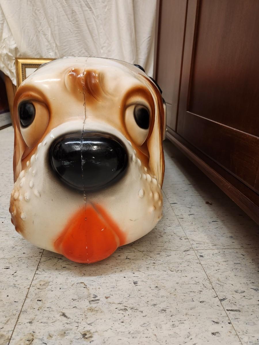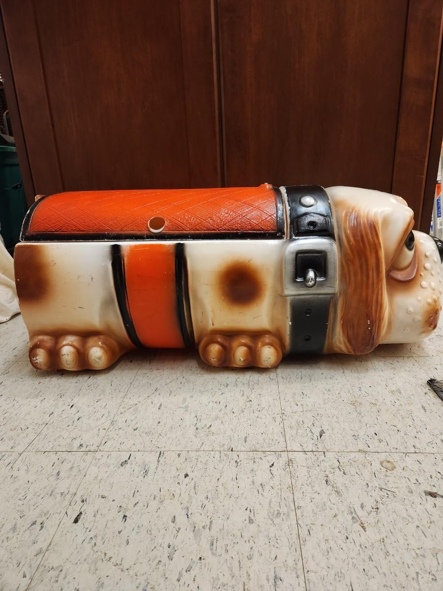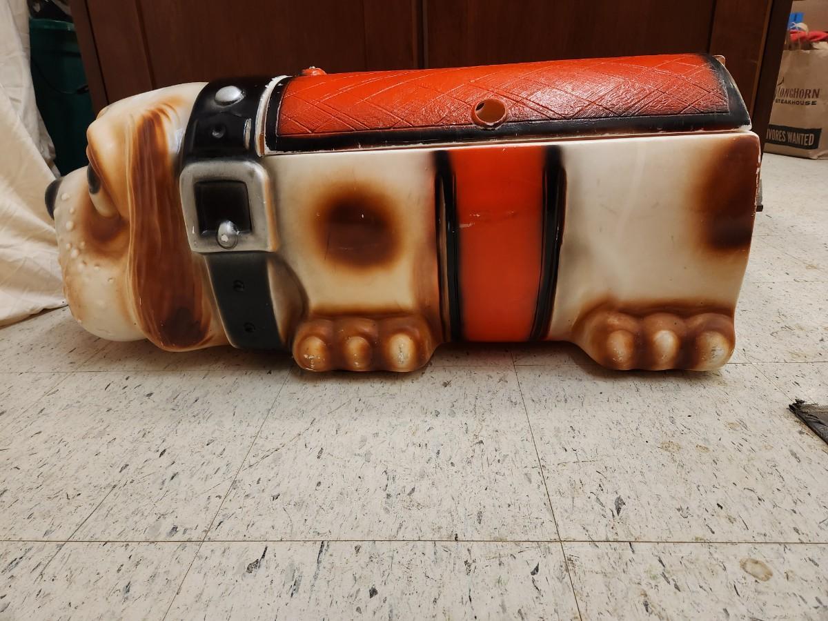 Fantastic vintage blowmold puppy toy box. This fantastic toy box is extremely unusual, I could only find this mold in a small desk lamp. Really great example of blow mold! This is available to touch and see at the shop.