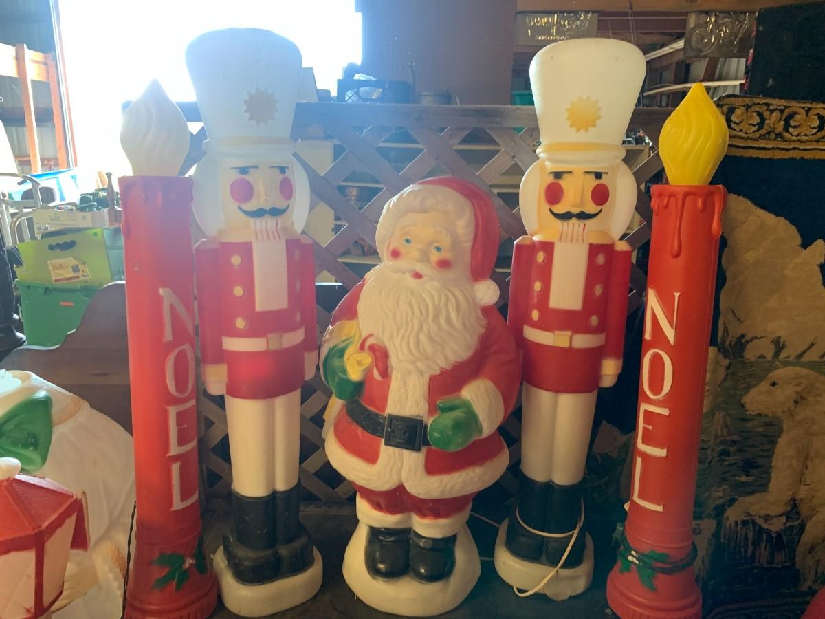 Listed are vintage Blow Mold Santa with 2 nut crackers and 2 noel candles. All seem to be in very good vintage condition.