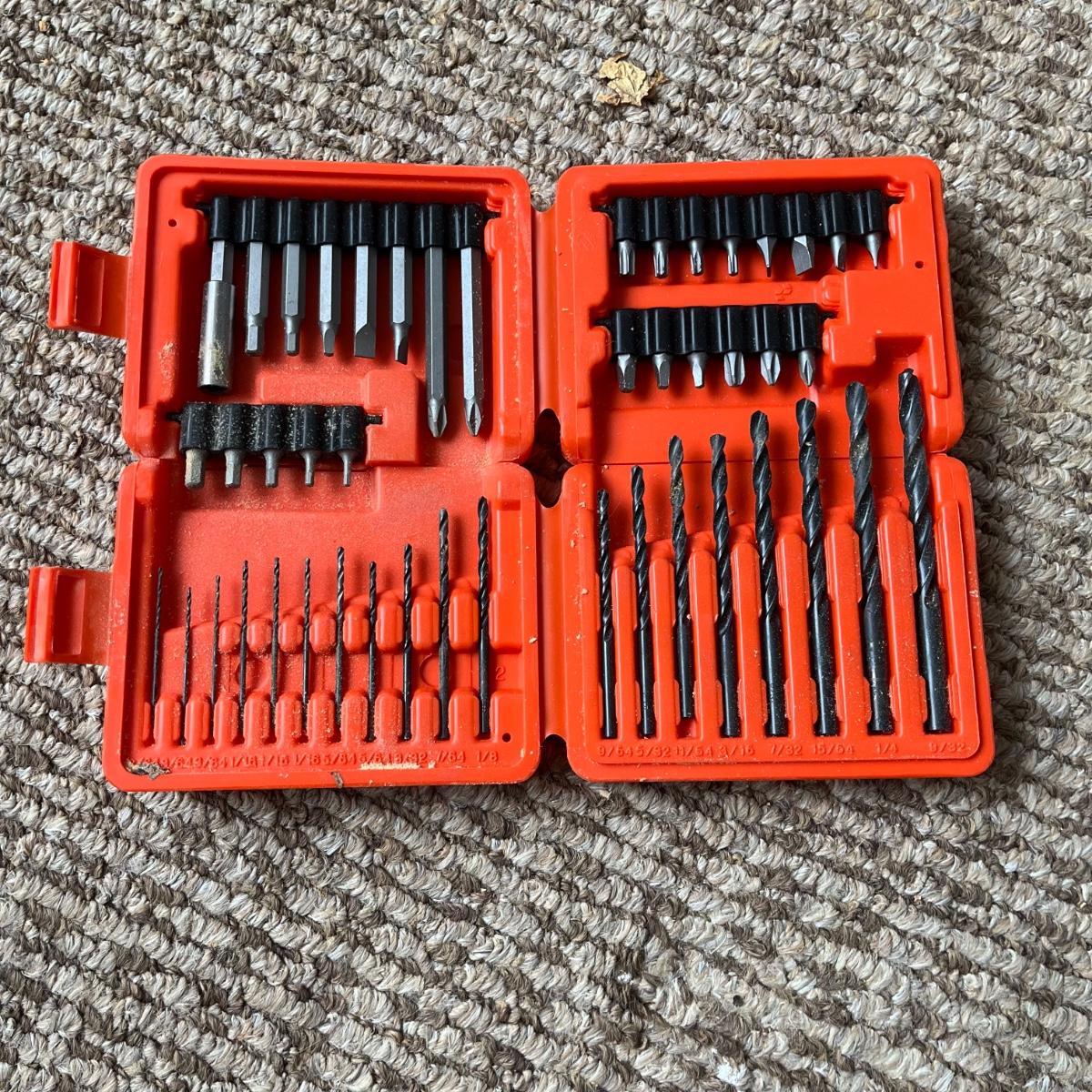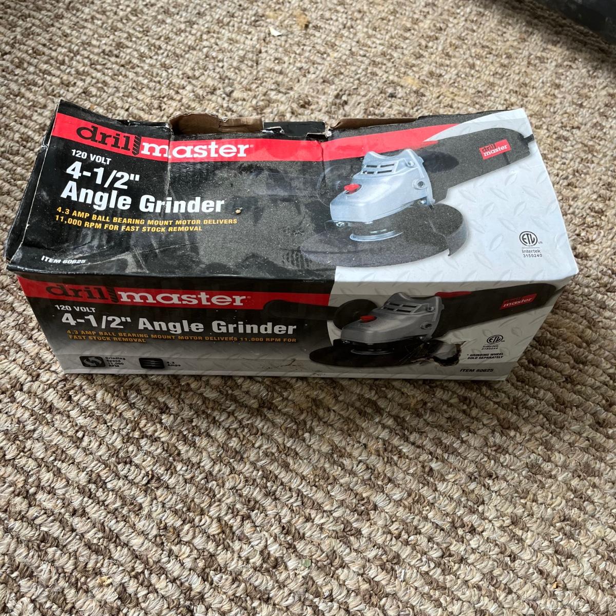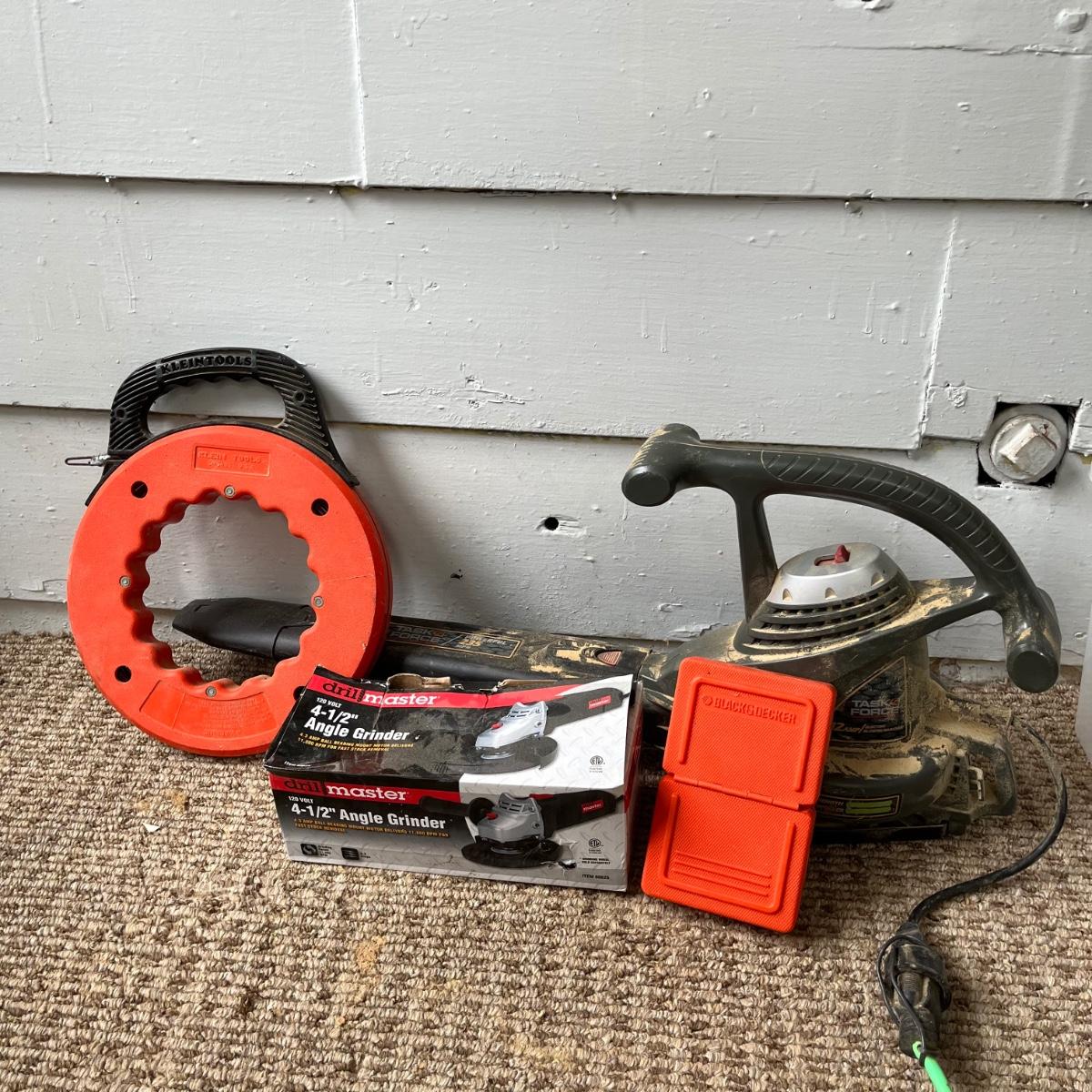 Lot includes a Task Force model # 4106 electric blower, Drill Master 4 1/2” angle grinder NIB, Klein Tools flat steel fish tape, Black and Decker drill bits and more. Grinder and blower worked when tested.