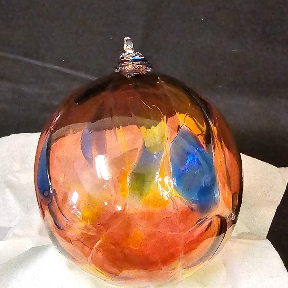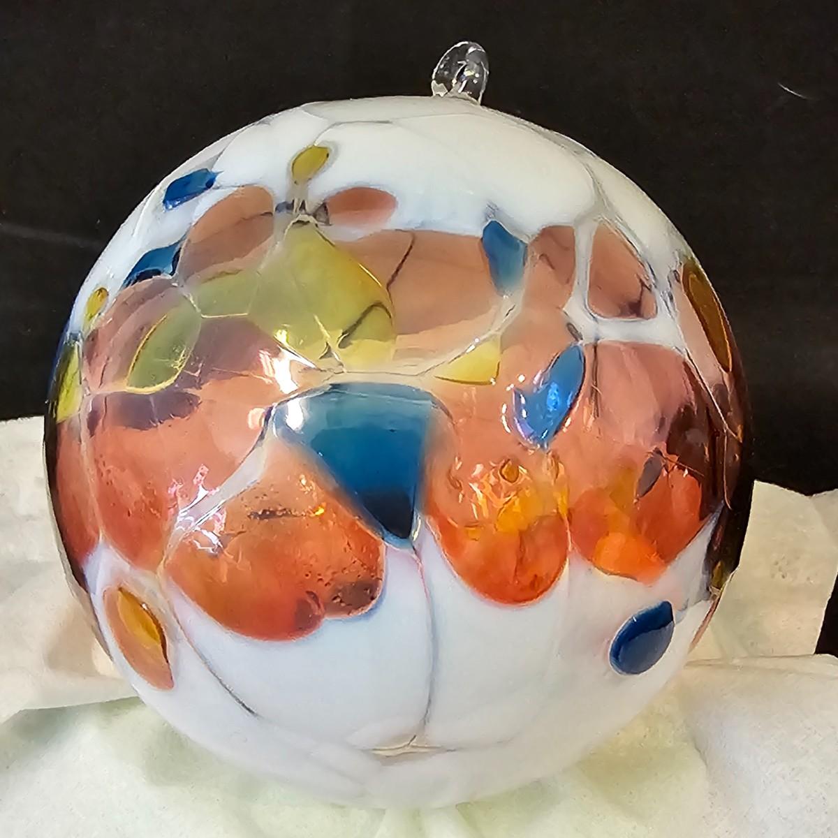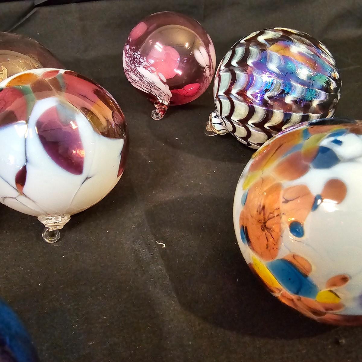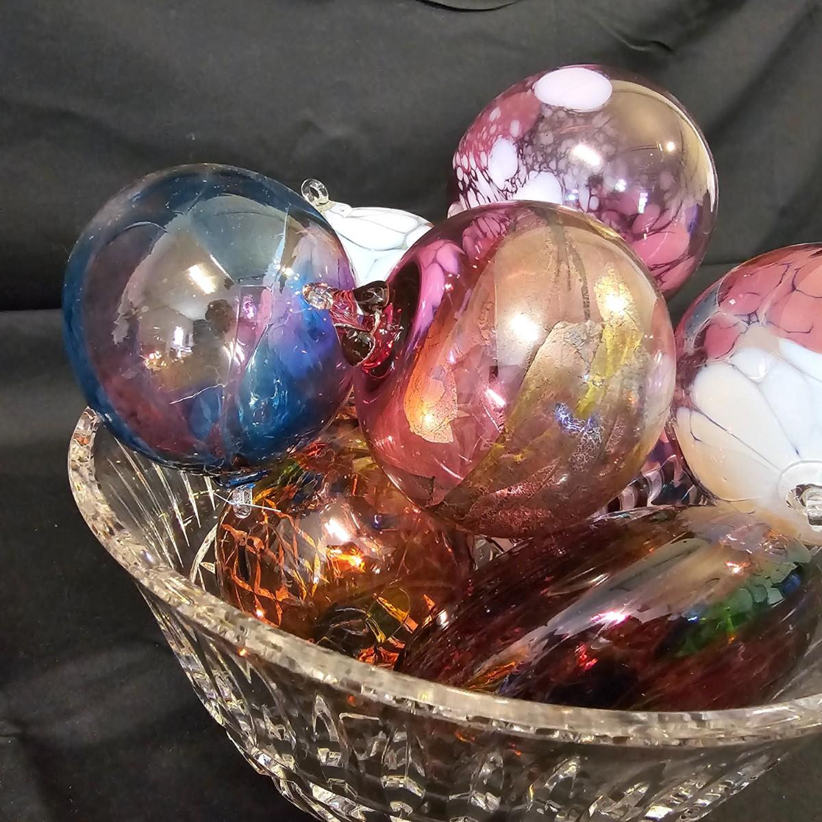 Eight unique and different blown glass ornaments, along with a Waterford crystal bowl for a beautiful display. Ornaments are 3" to 4.5"D, have rolled hanging loops at top. Wide range of colors and designs. Waterford bowl is 9"D x 4"H, has ribbed design. See photos for details. Shipping available.