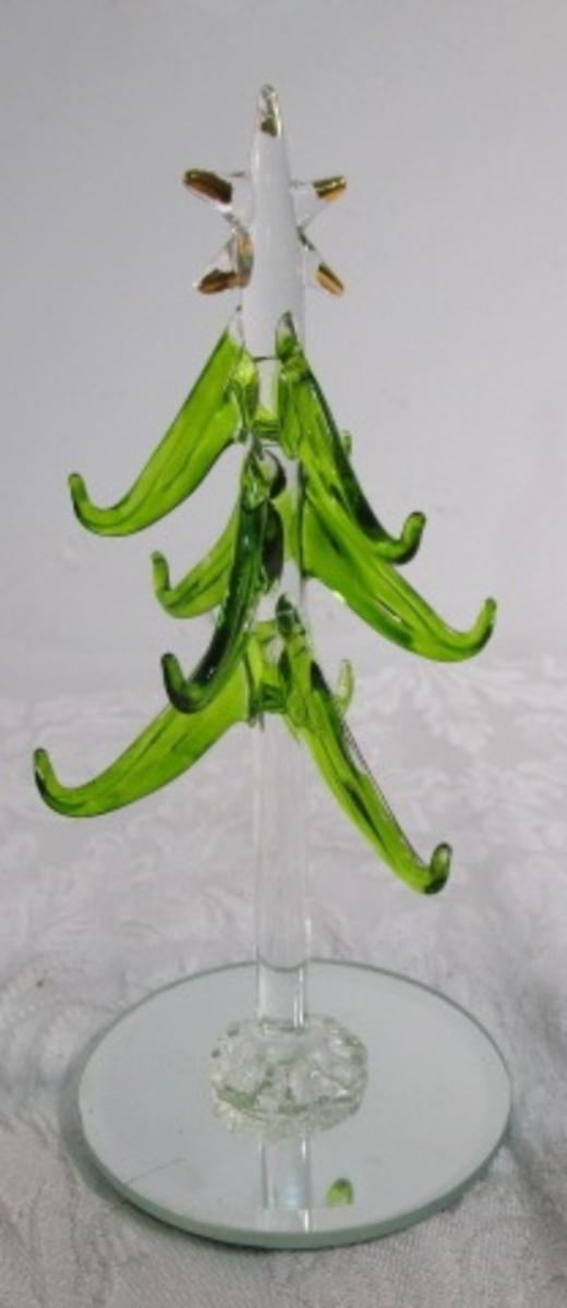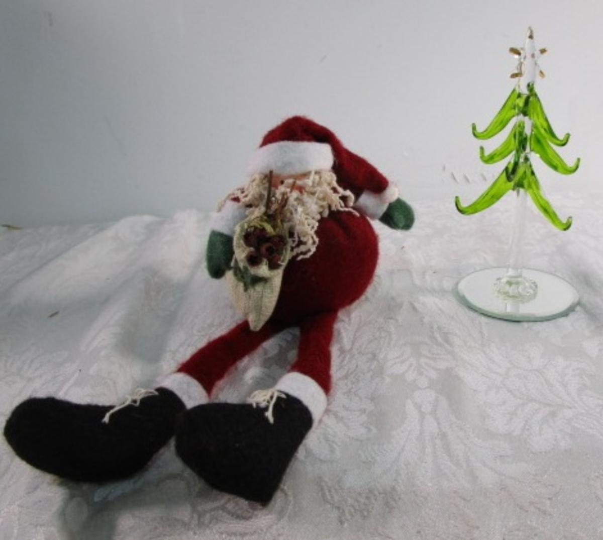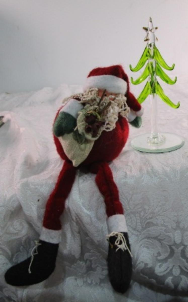 Blown glass Christmas tree on a mirrored base, Shelf Santa