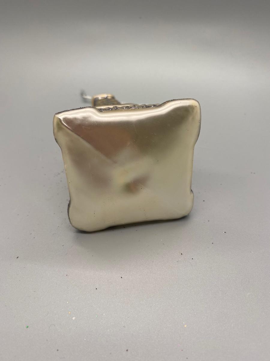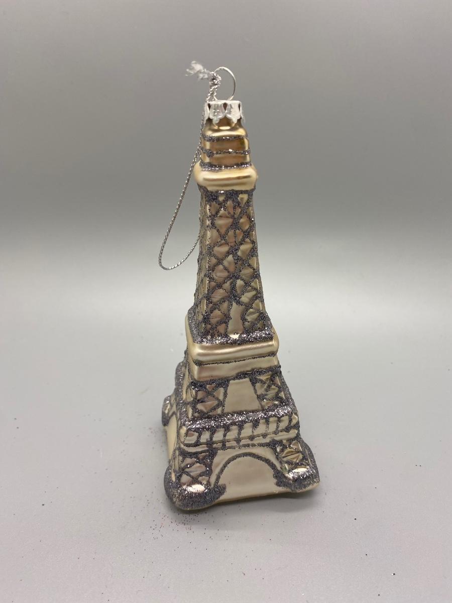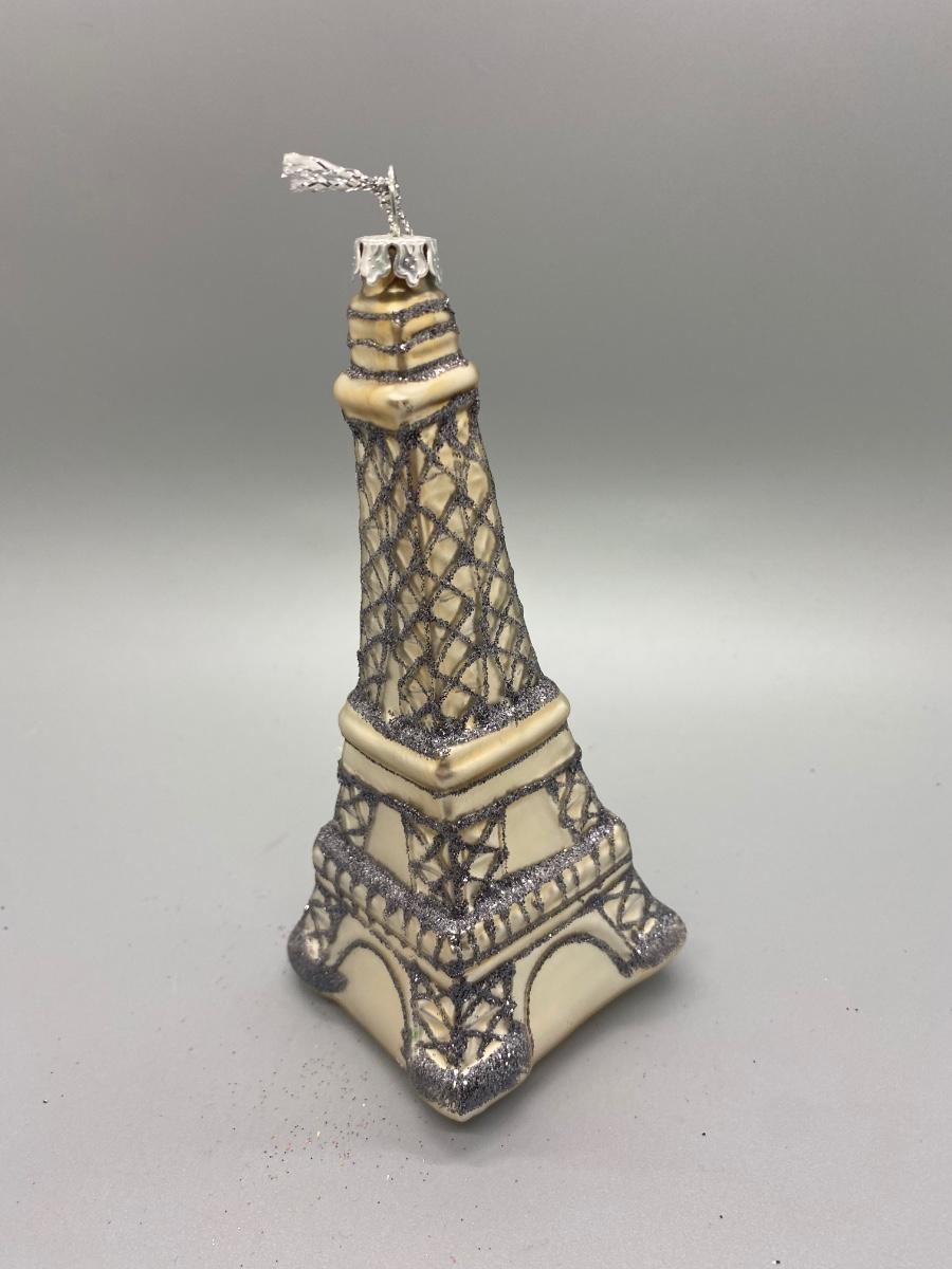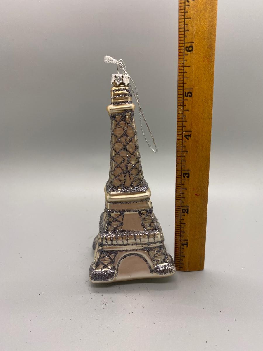 Blown glass holiday ornament of the Eiffel Tower. In good condition. Can be displayed year-round. A little over 5" size.