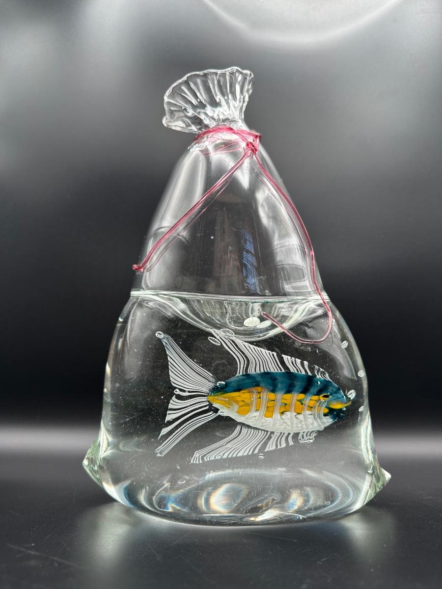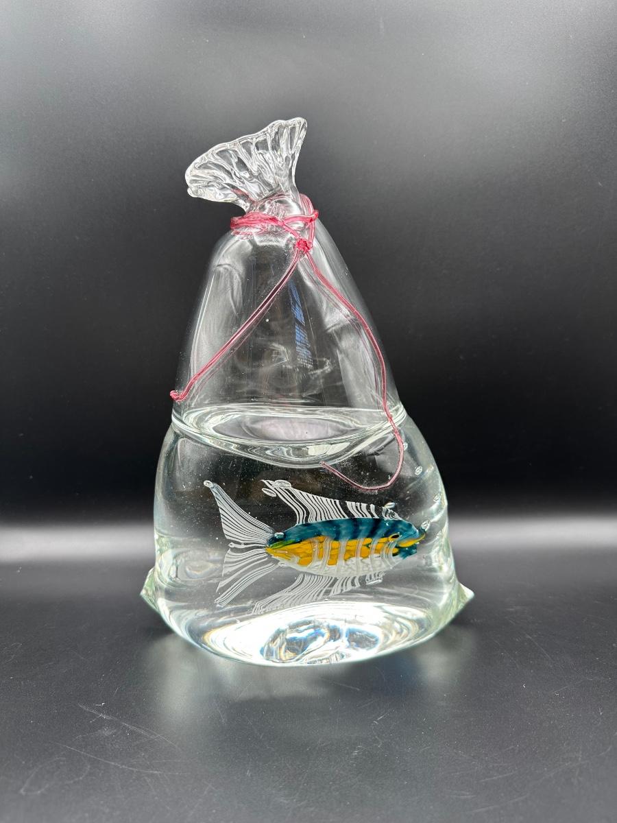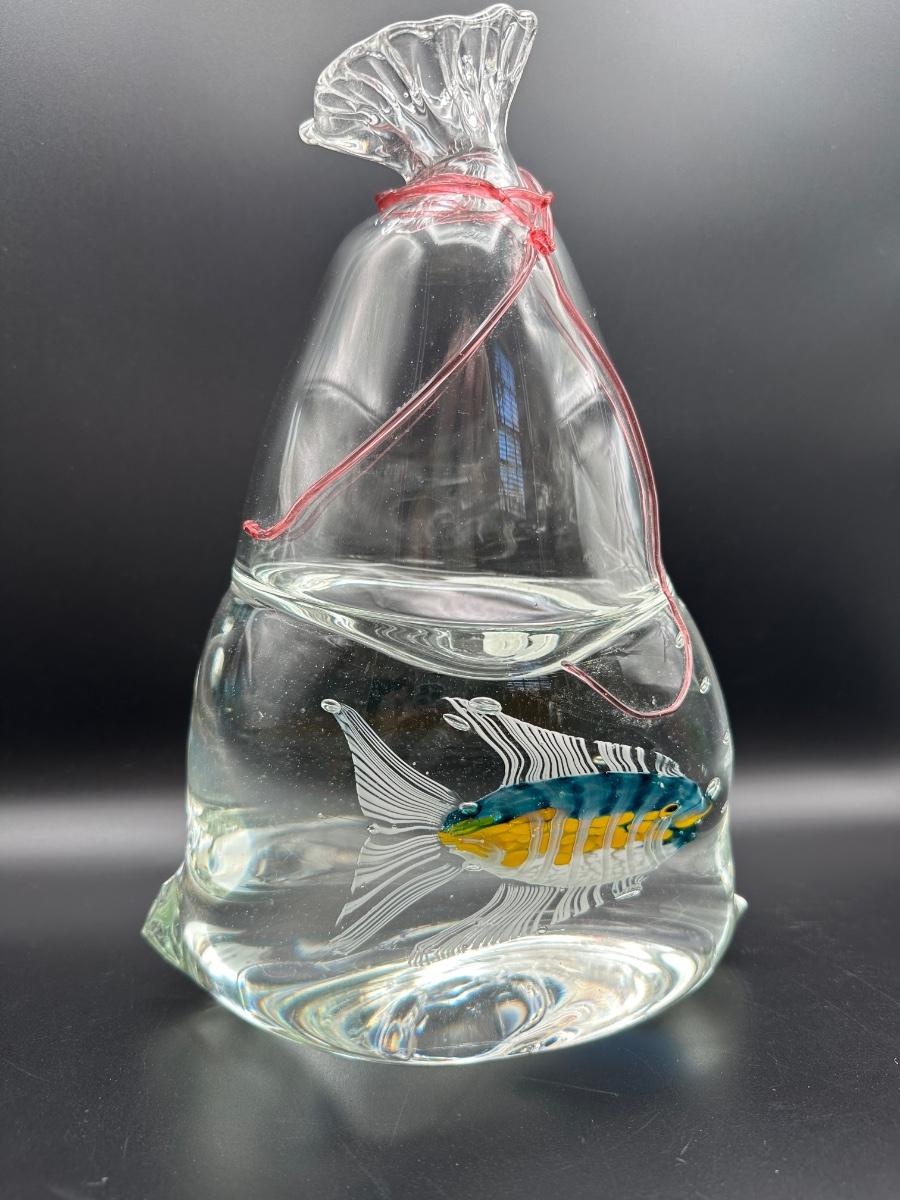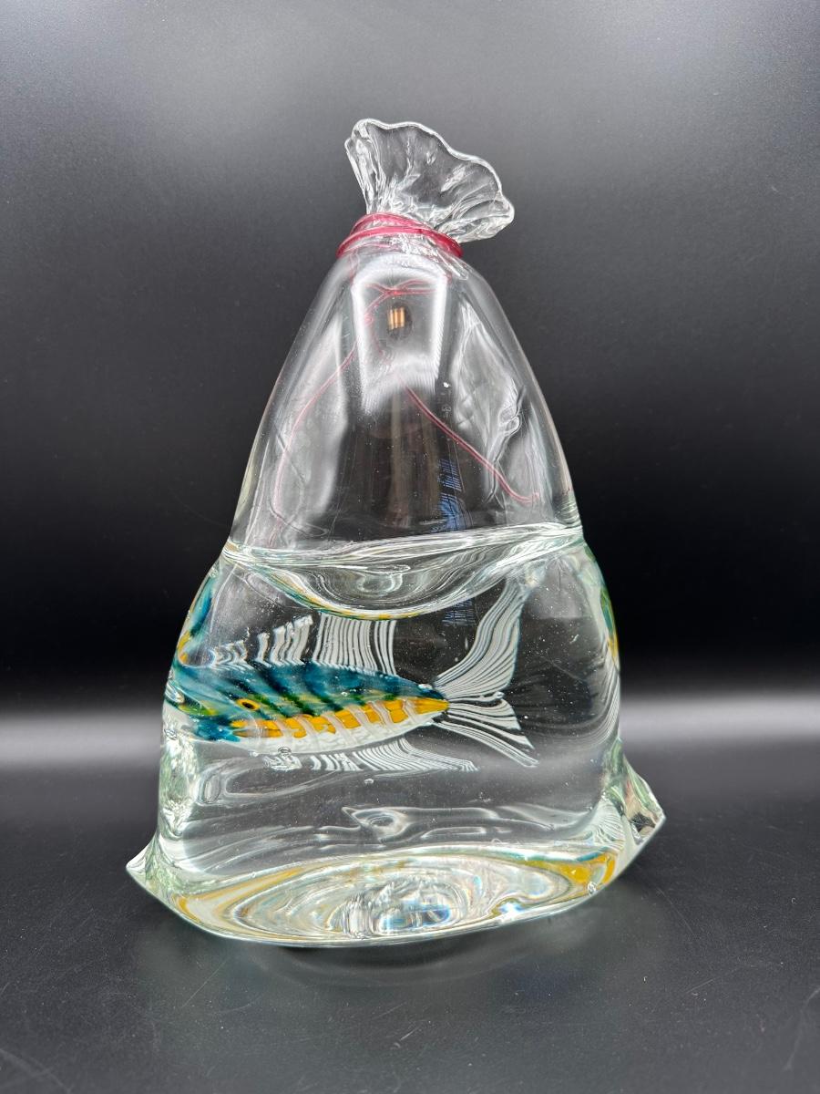 Blown glass “fish bag”. It has an opening in the top that could hold something.