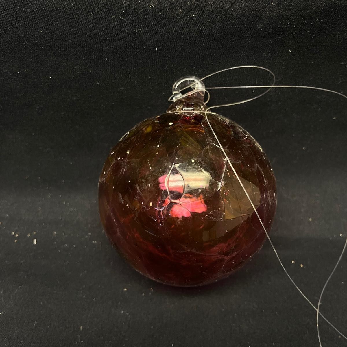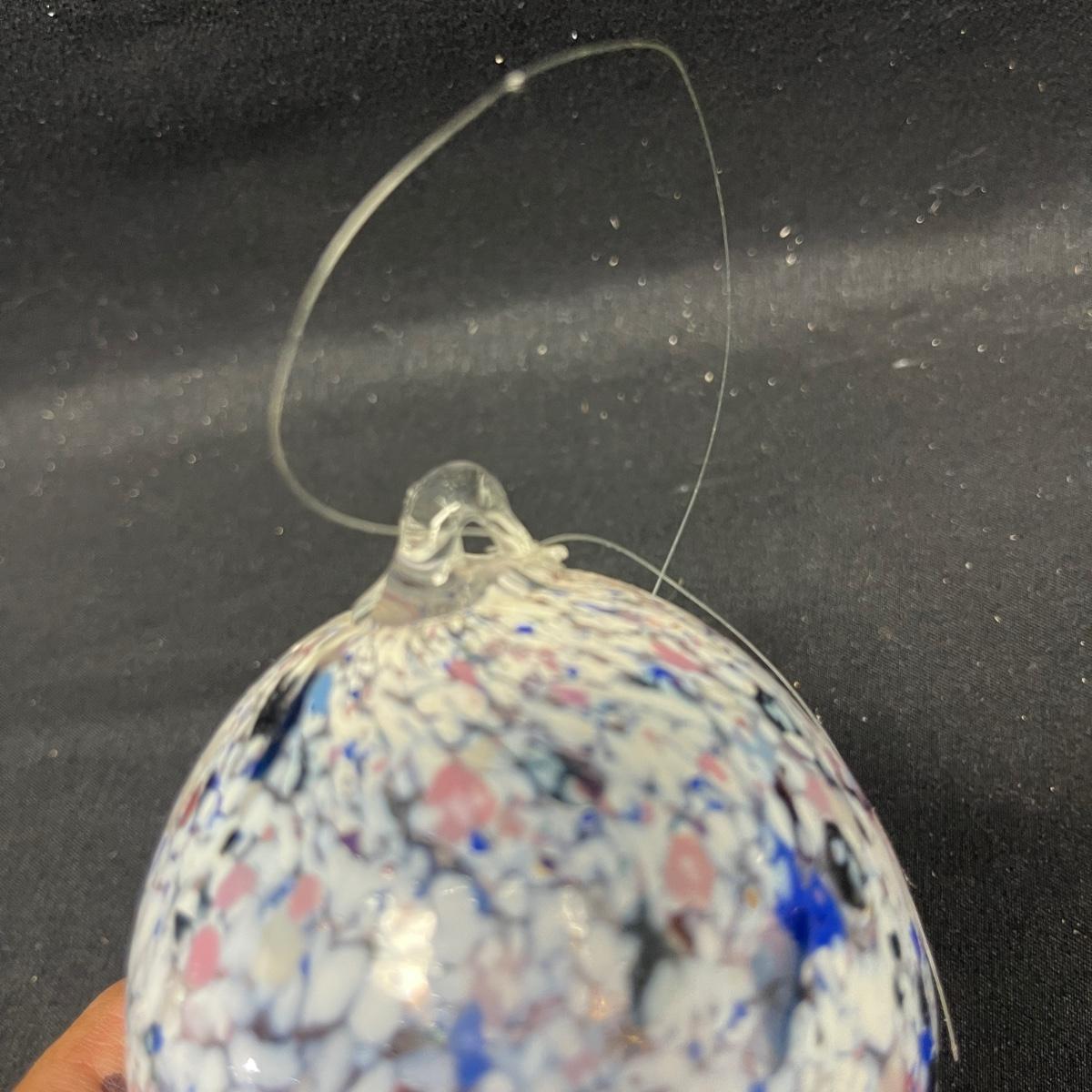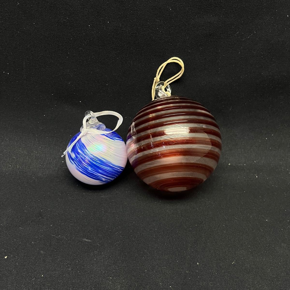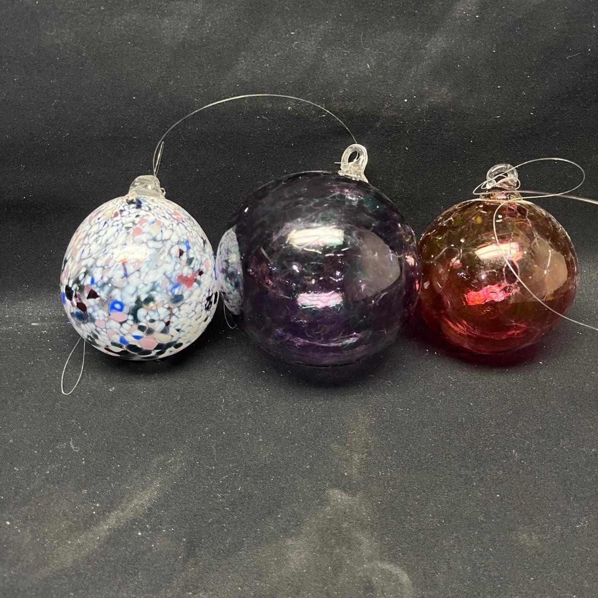 Lot includes five blown glass ornaments with the largest measuring 4"D. All have strings to hang them.