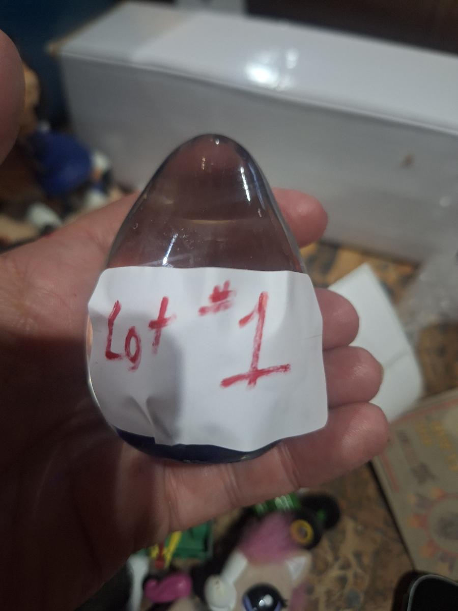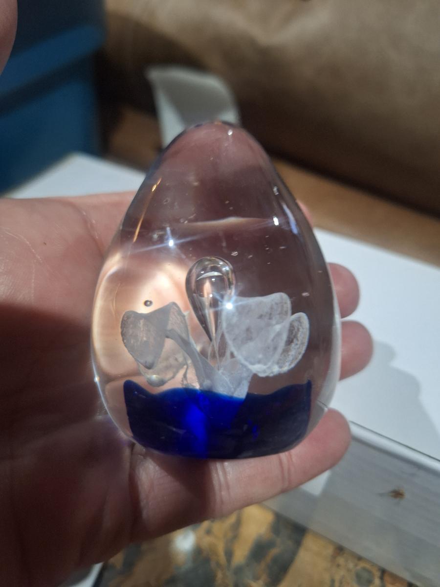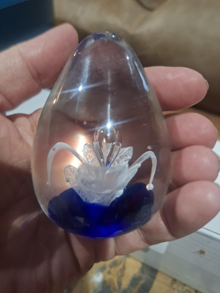 blown glass paperweight, egg shape with cobalt blue and white flower