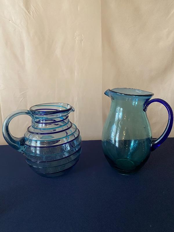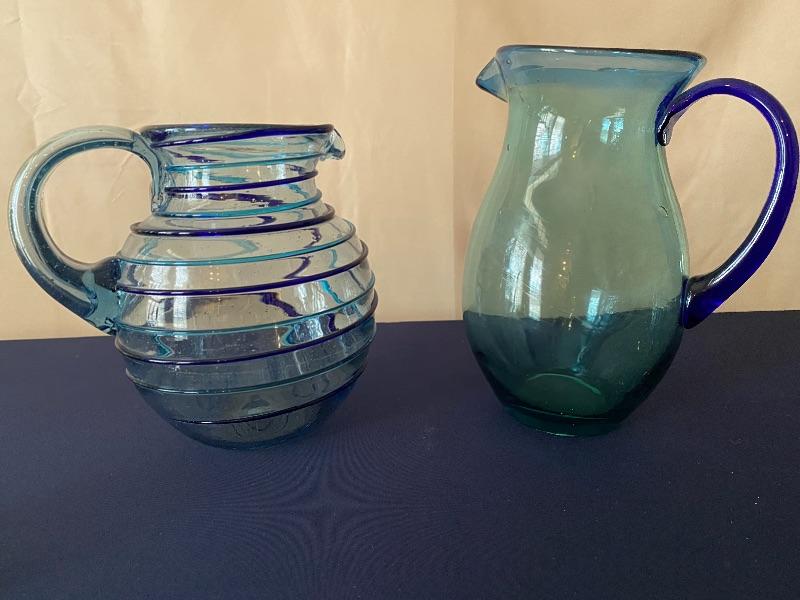 2 Blown glass pitchers 9 1/4,8 1/4 Blue green turq