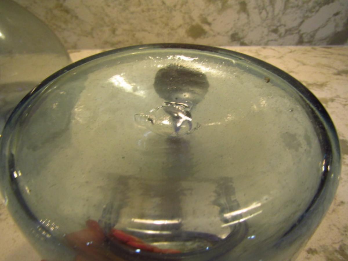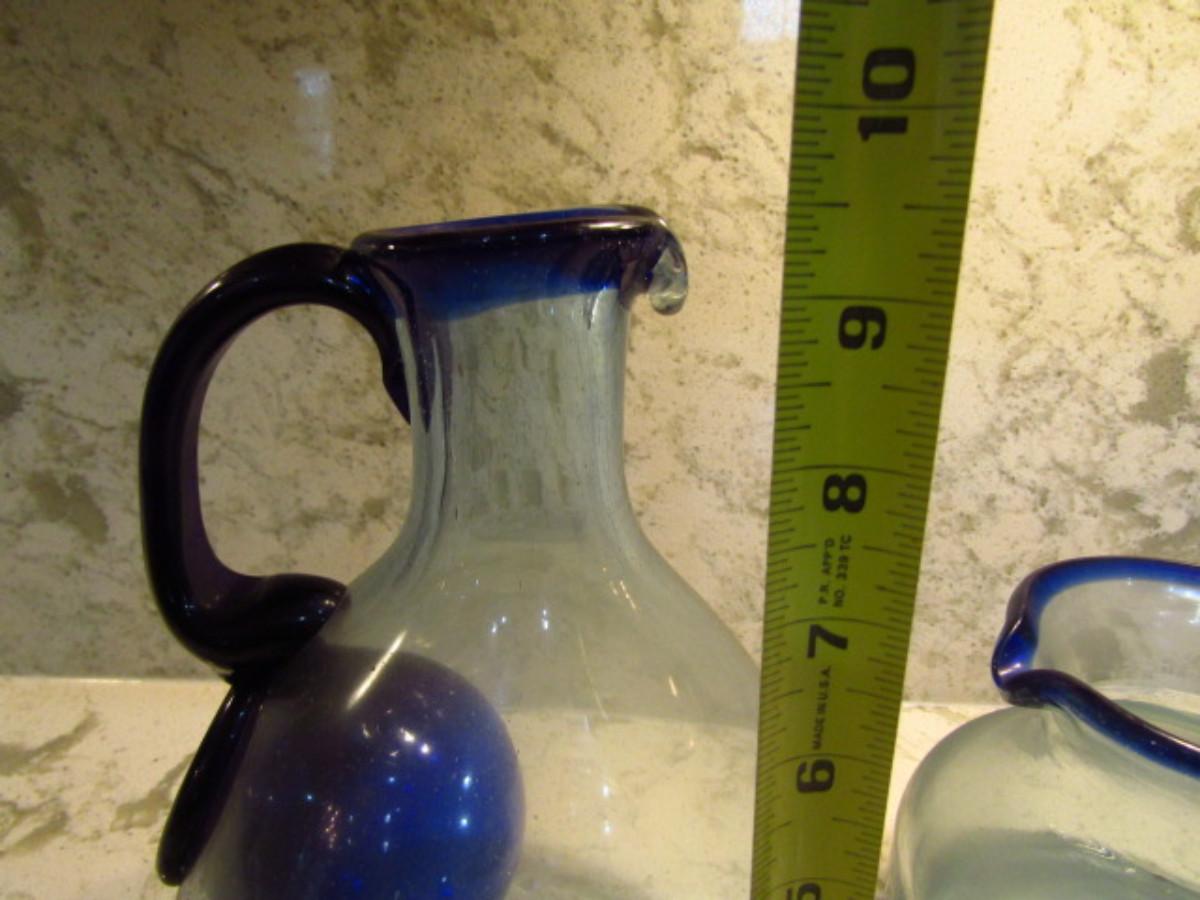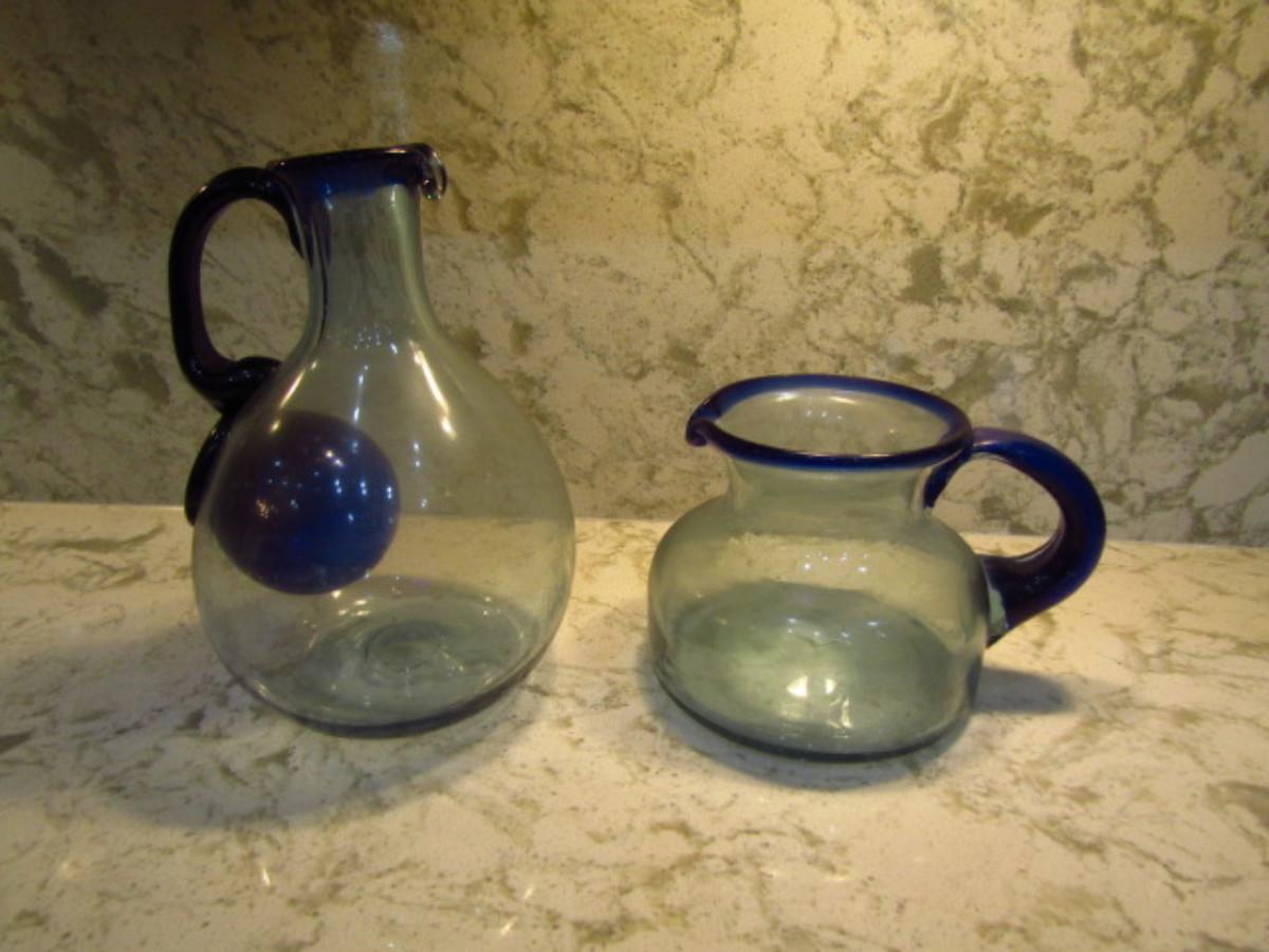 Blown Glass Pitchers- Clear and Cobalt Blue with Inclusions (Kitchen). Tall one = 9 1/2". Short one= 5 1/4".